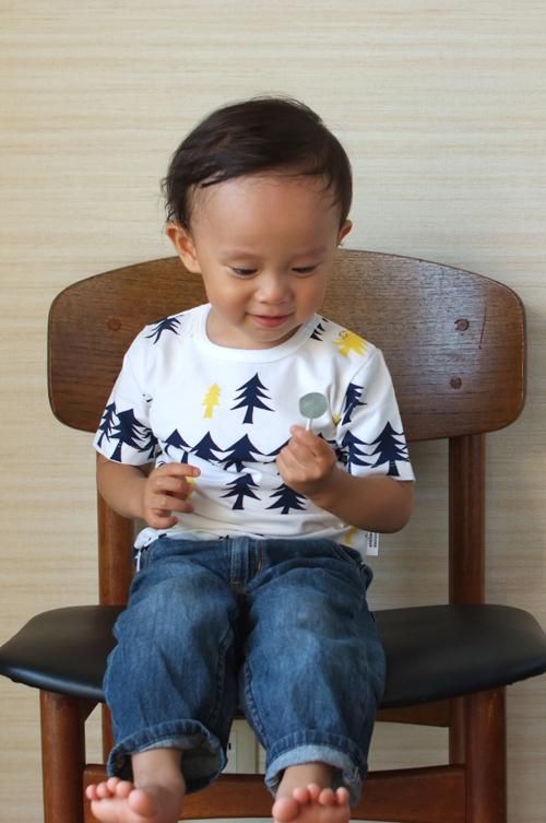 オリジナルのプリント生地「tree」を使用した、ベビーロンパースの長袖と半袖。