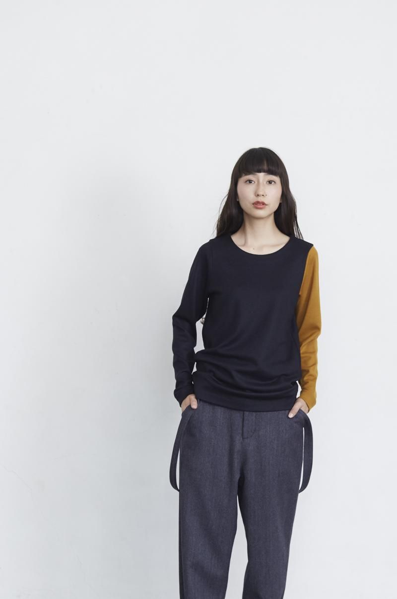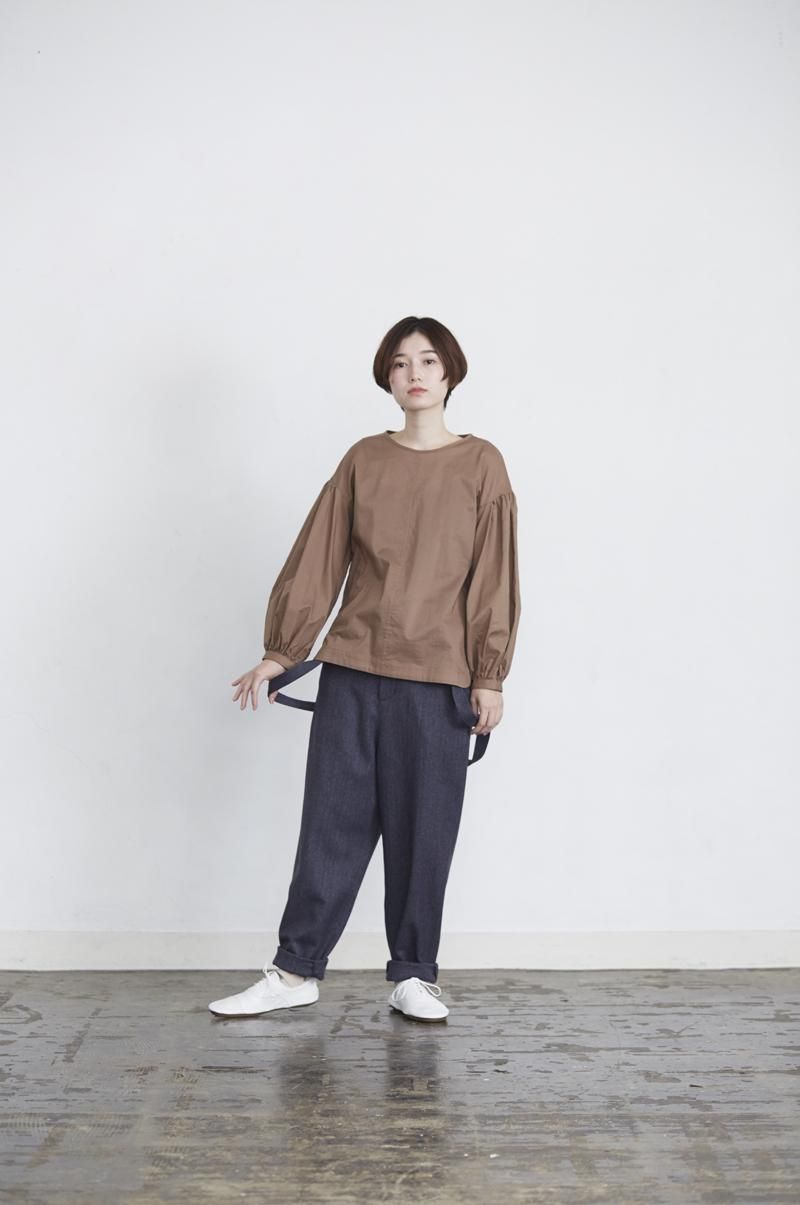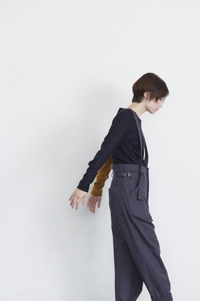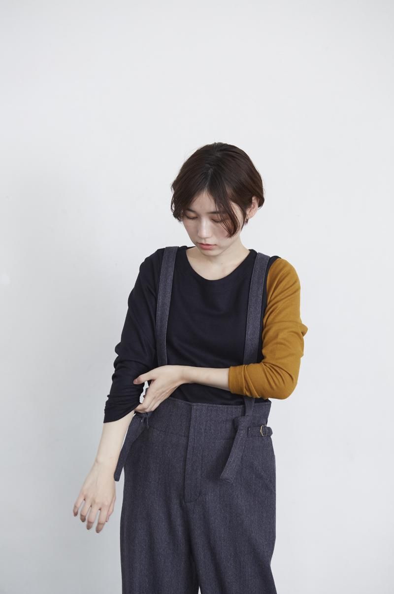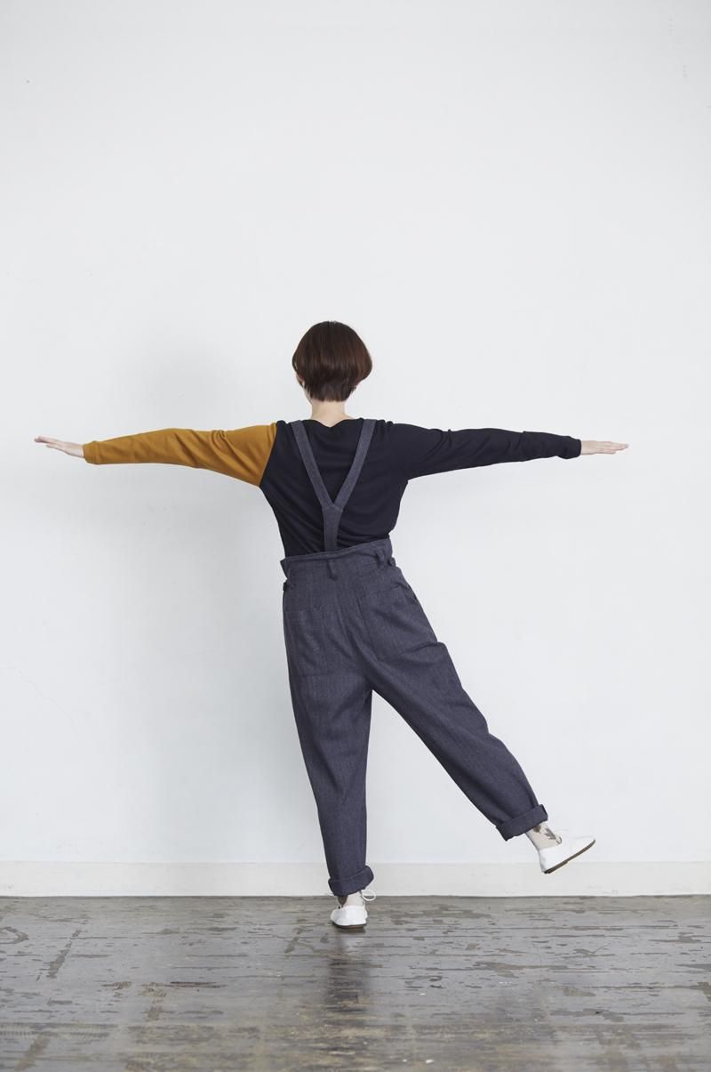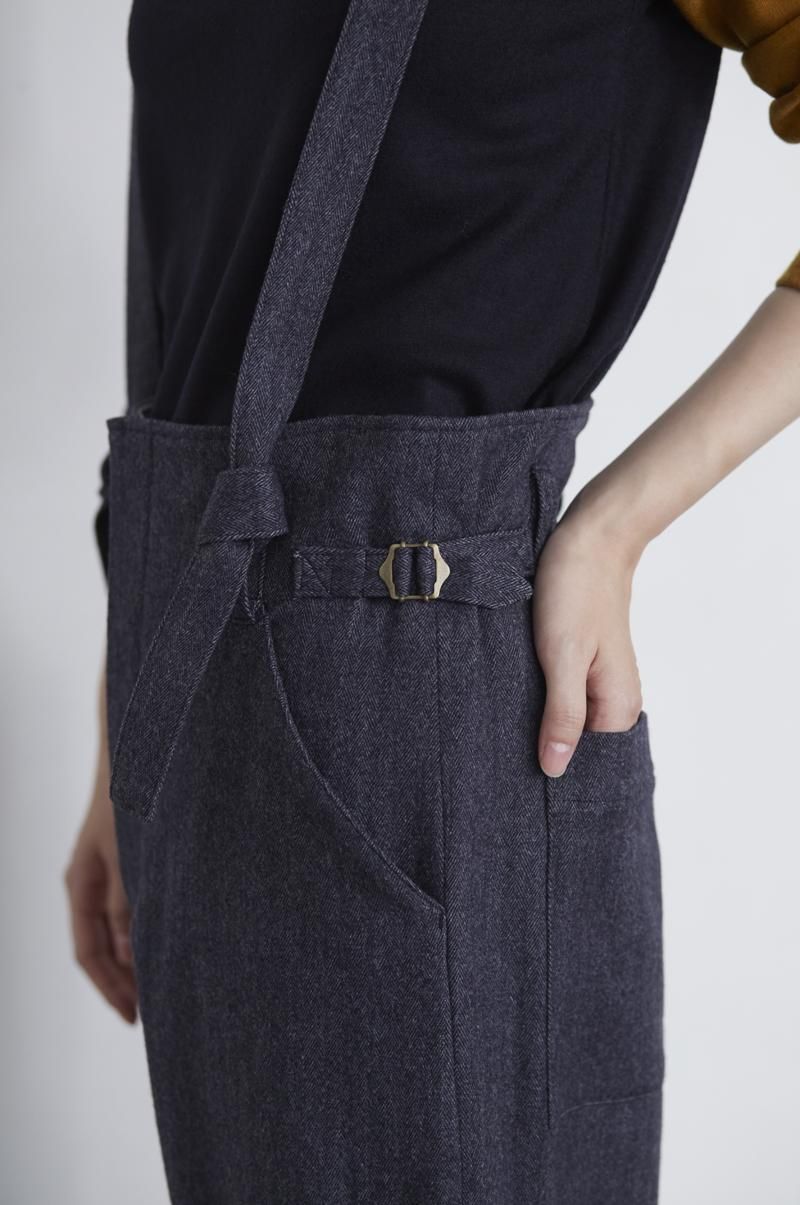 そして、共布のサスペンダーは取り外しが可能。合わせるトップスや気分に合わせて変えることができるさまざまなスタイリングもたのしいパンツです。