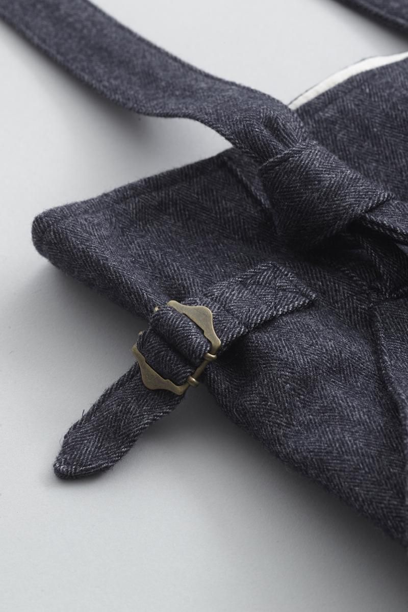 オーストラリア原産のラムウールとsuper100’sウールを混紡した1/16の糸で織り上げるヘリンボン模様のウールツィード素材。そのやさしい肌触りと柔らかな光沢感が特徴の布地でつくった、サスペンダーパンツです。