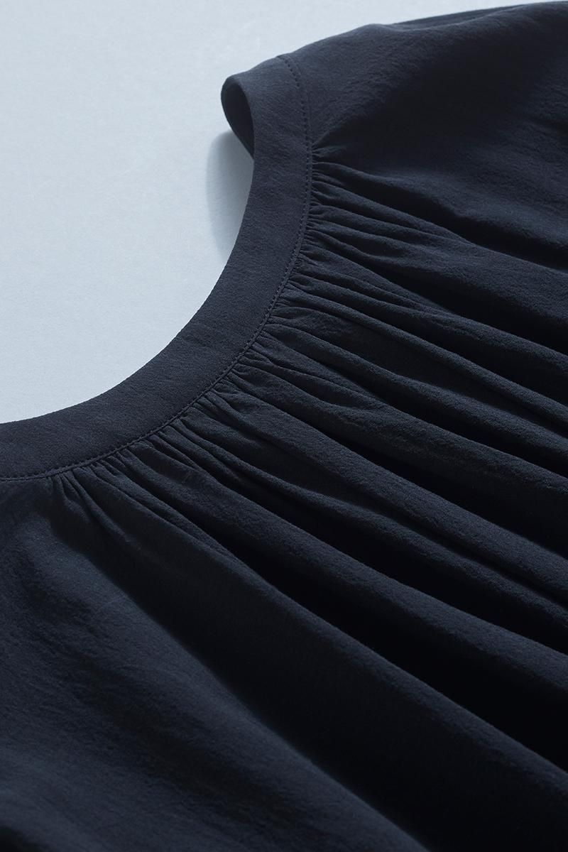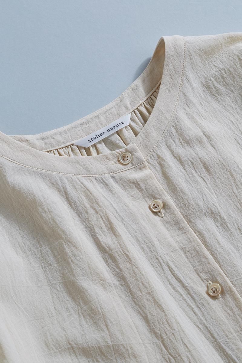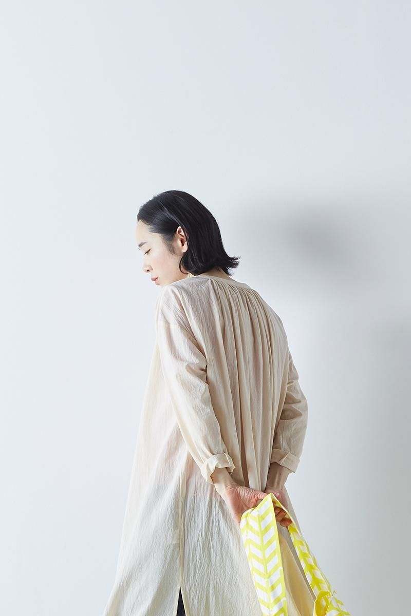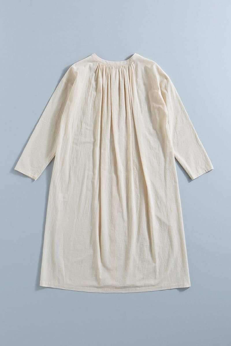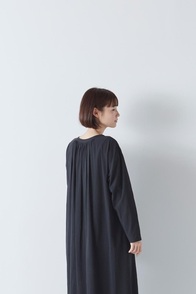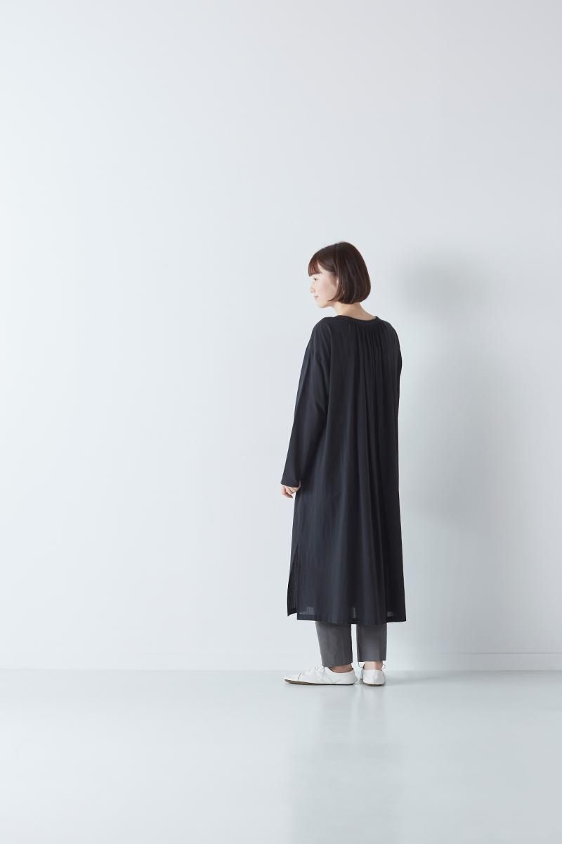 バックのみ、衿ぐりからこまかく繊細なギャザーがたっぷりとはいっています。前からみるとタイトなシルエットですが、後ろはゆったりとした裾まわりになるのでほどよいまるみのあるラインになります。