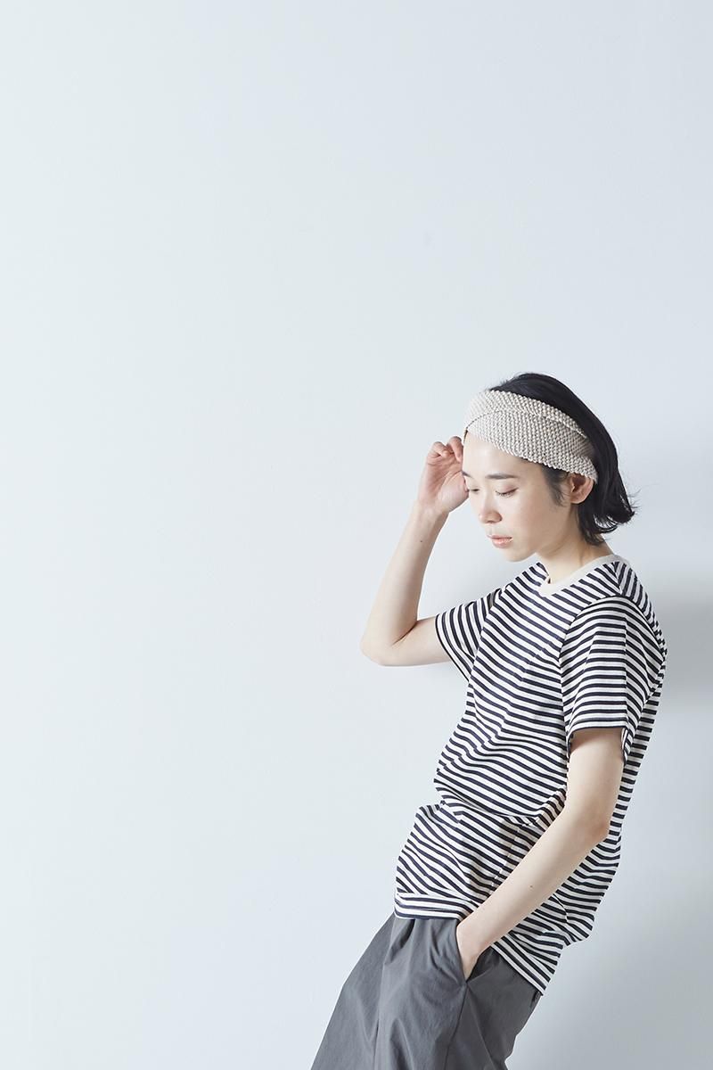 また、頭の中心に高さがでるように“ねじり”が入るほか、後頭部のリブ部分は配色になった~zig-zag(ジグザグ)~の表裏のない模様編みになっています。ねじりや模様の位置など、その日のスタイリングやヘアスタイル、気分に合わせて変えてみるのもたのしいヘアターバンです。
