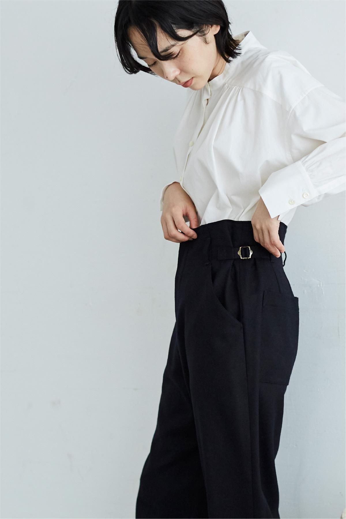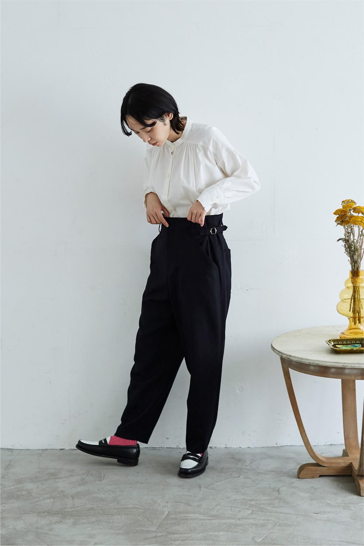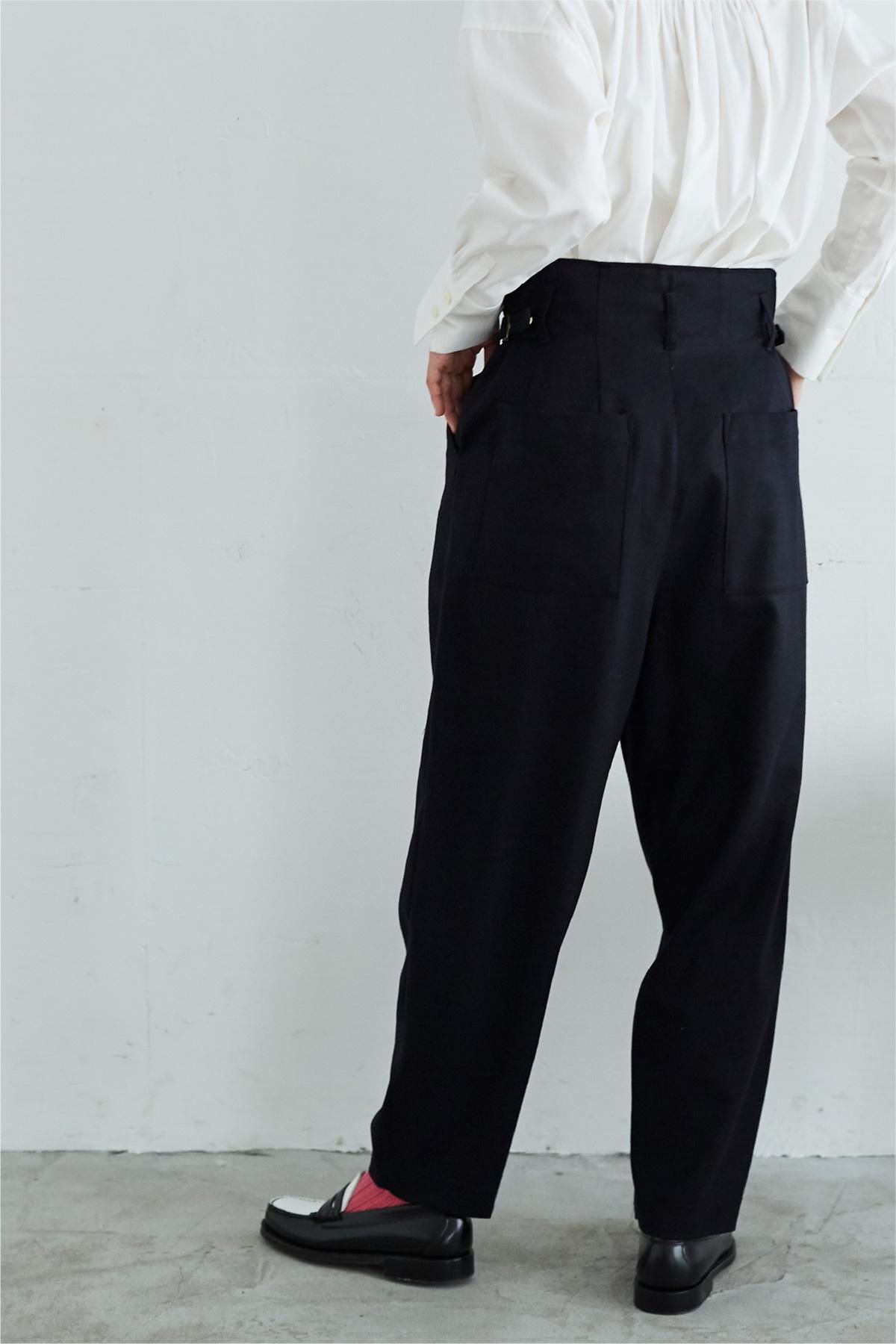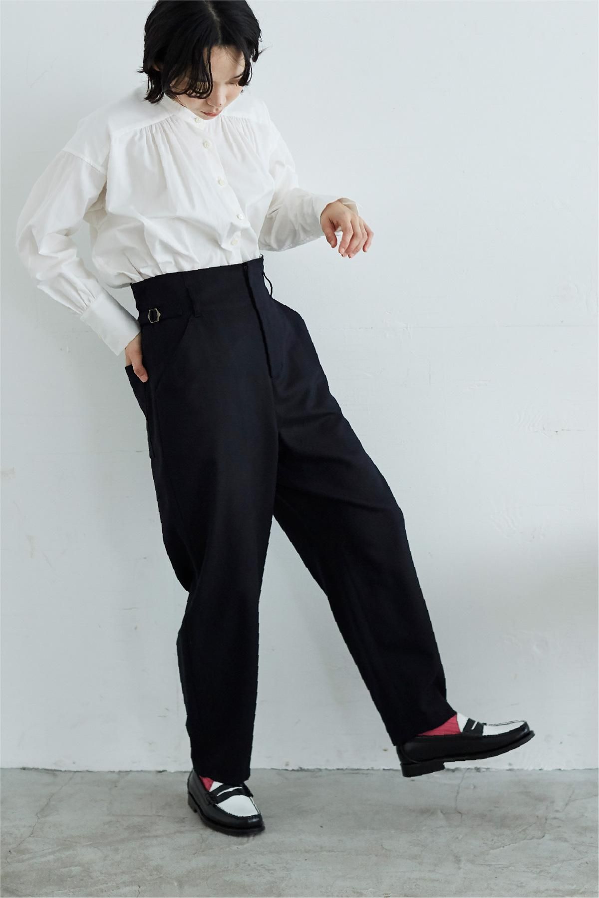 ウエストまわりにダーツが入った、股上の深いハイウエスト型。そんなキュッと細くなったウエスト部分からゆるやかに大きくなるヒップライン、そこから裾にかけてふたたびタイトになってゆく、女性らしいシルエットのパンツです。