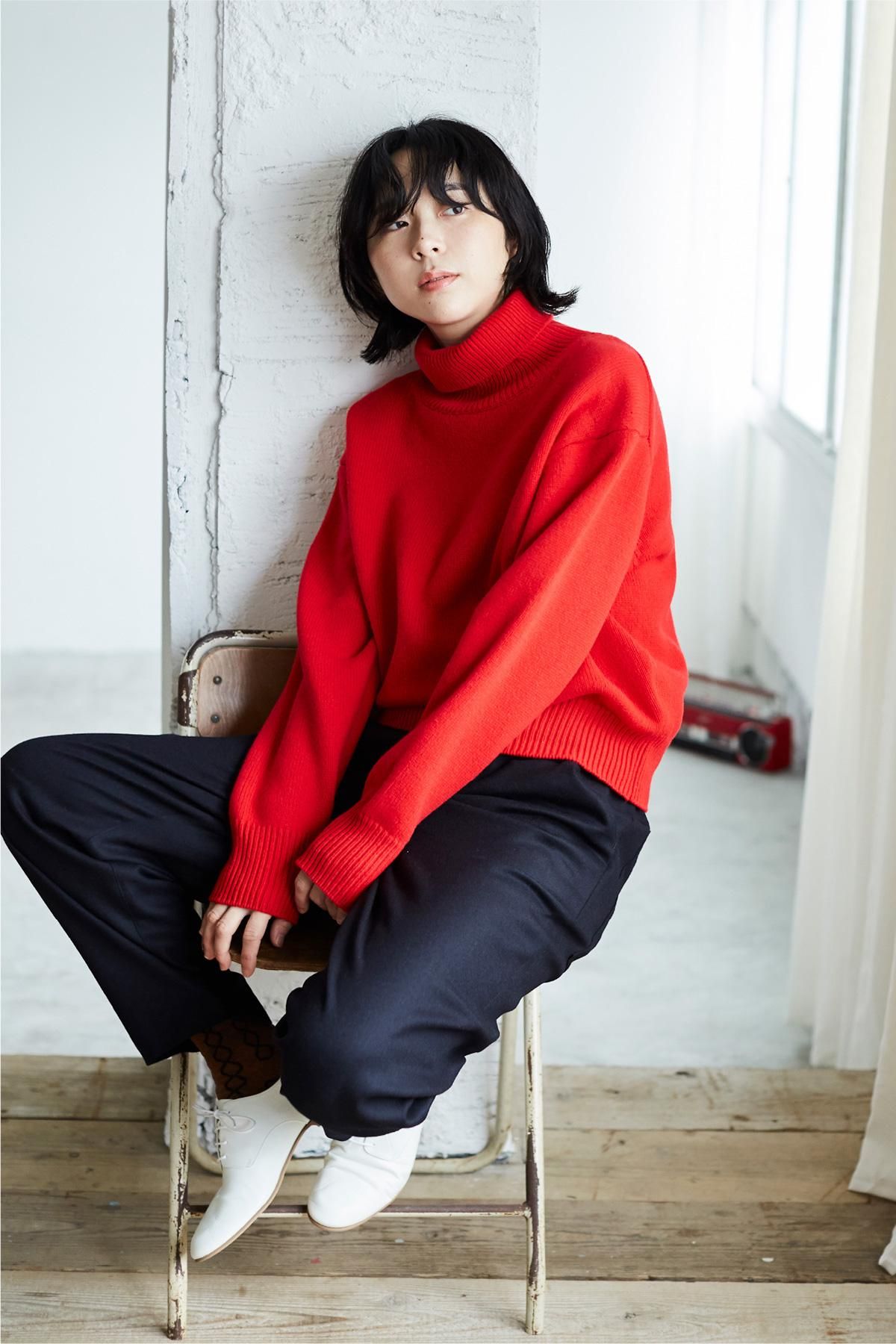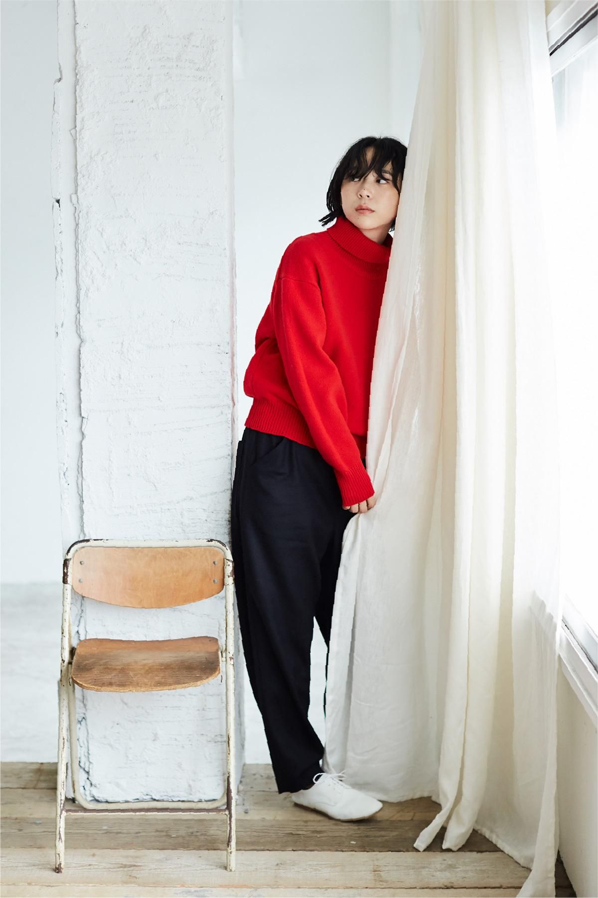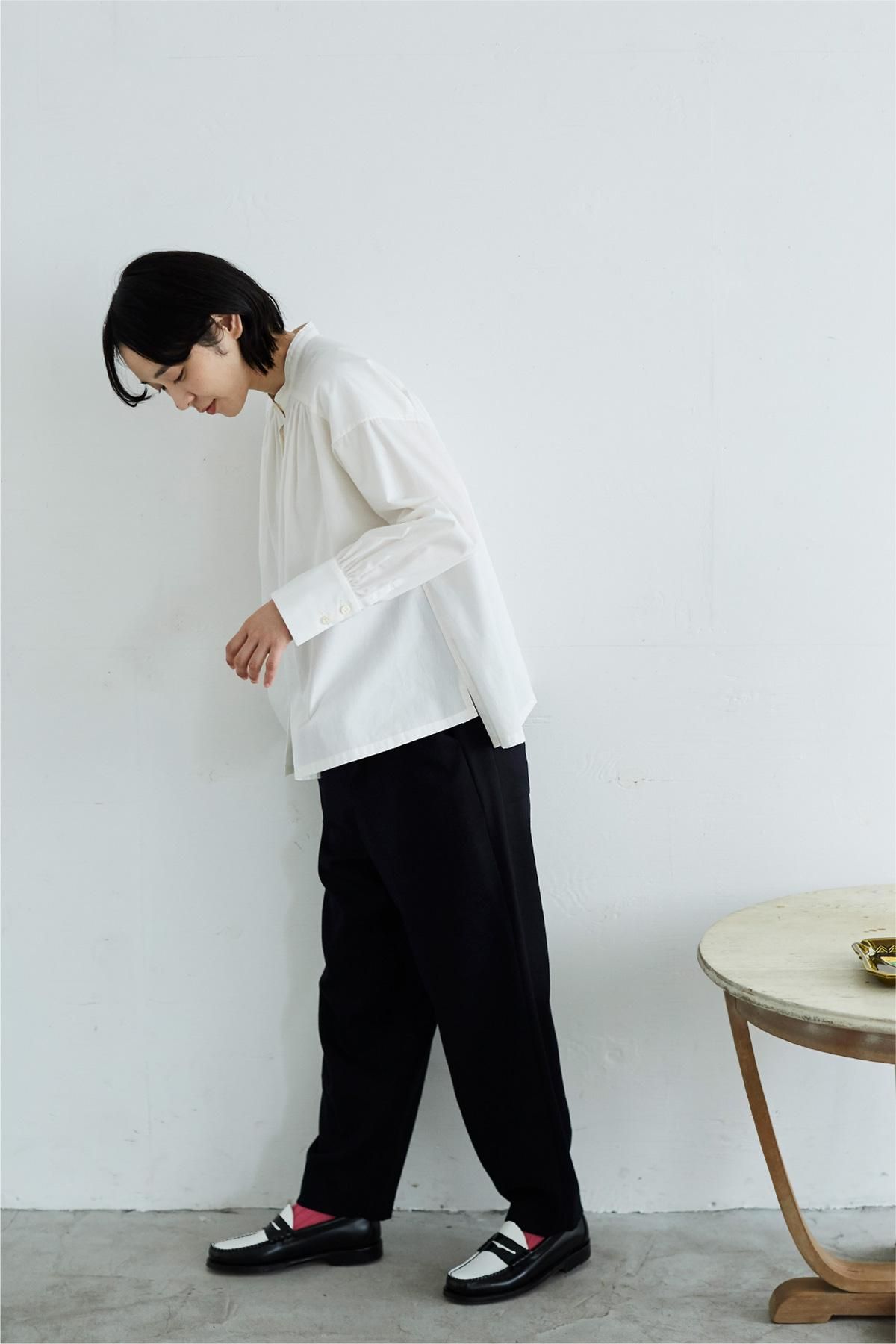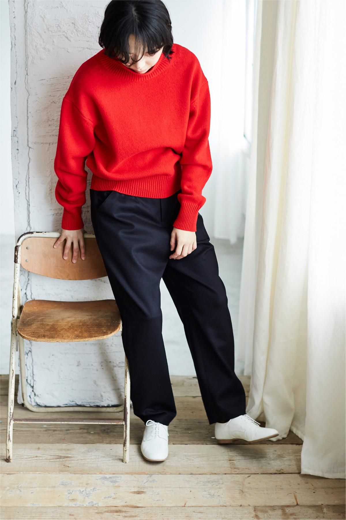 ウエストまわりにダーツが入った、股上の深いハイウエスト型。そんなキュッと細くなったウエスト部分からゆるやかに大きくなるヒップライン、そこから裾にかけてふたたびタイトになってゆく、女性らしいシルエットのパンツです。