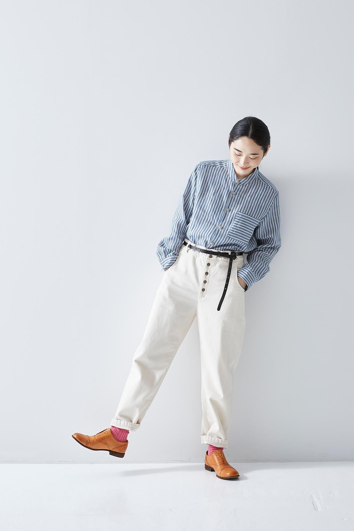 前立てやヨーク表裏のステッチをなくすことでステッチが入る箇所と入らない箇所をつくるなど、シンプルなデザインだからこそ、細かなこだわりを随所にこめた一枚。また、ポケット箇所など部分的なボーダー使いをすることで、デザインのアクセントになっています。