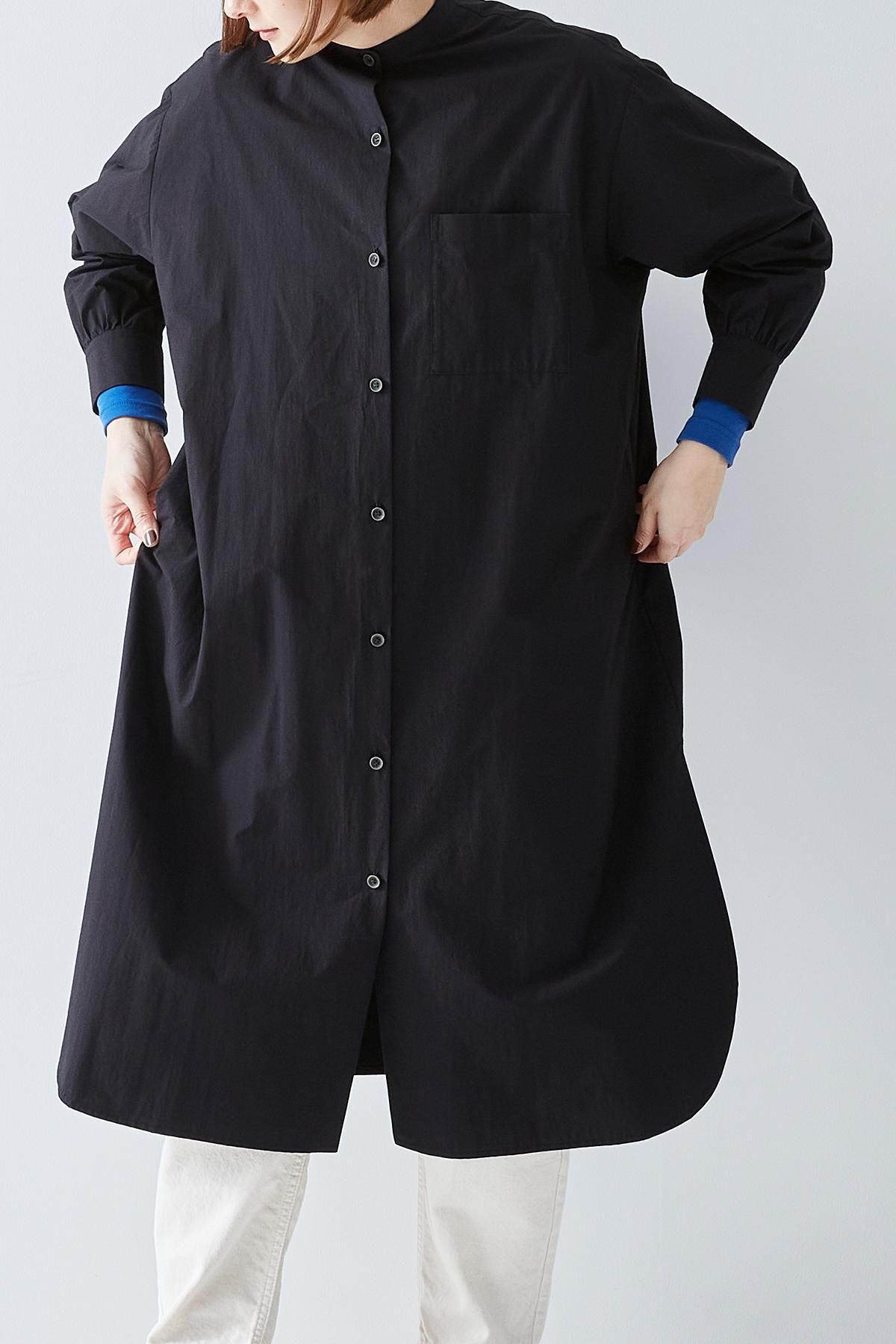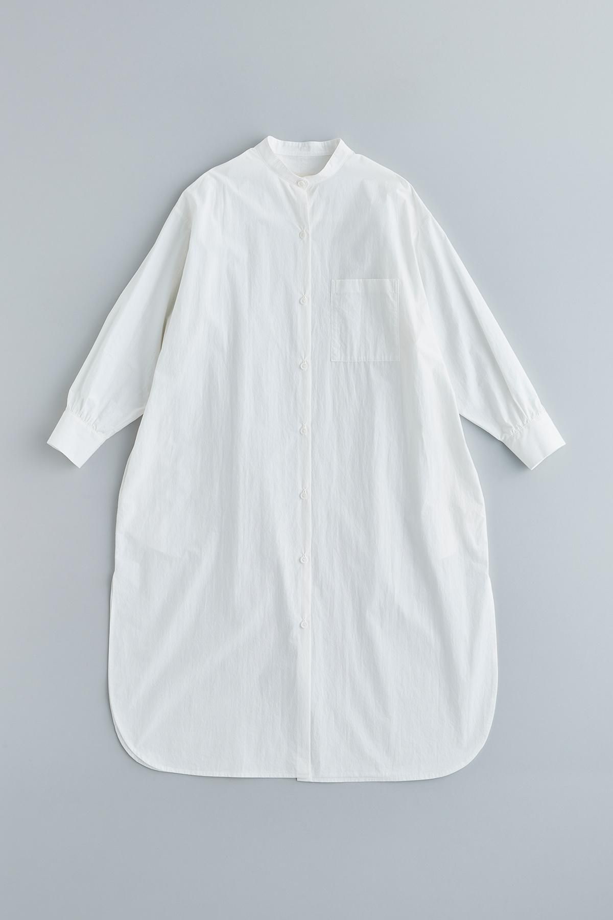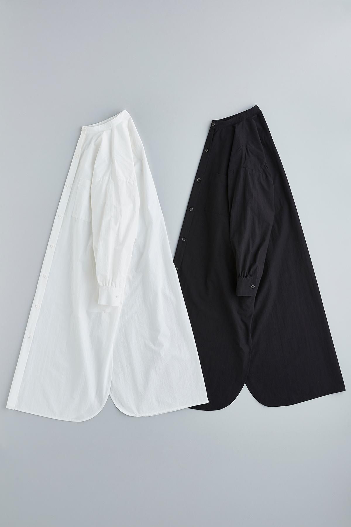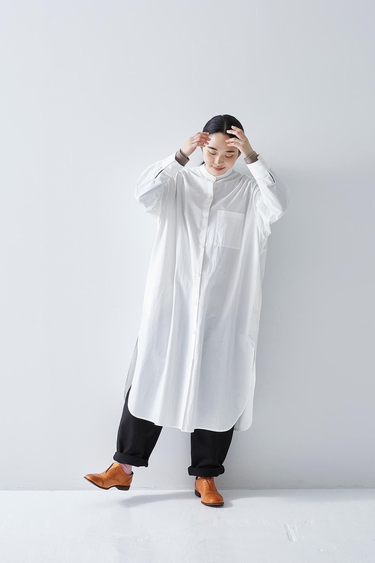 バンドカラーがシャープな印象のワンピースのようなロング丈シャツ。身巾、袖巾ともにゆったり大きめのサイズ感で、通年着ていただける素材感です。