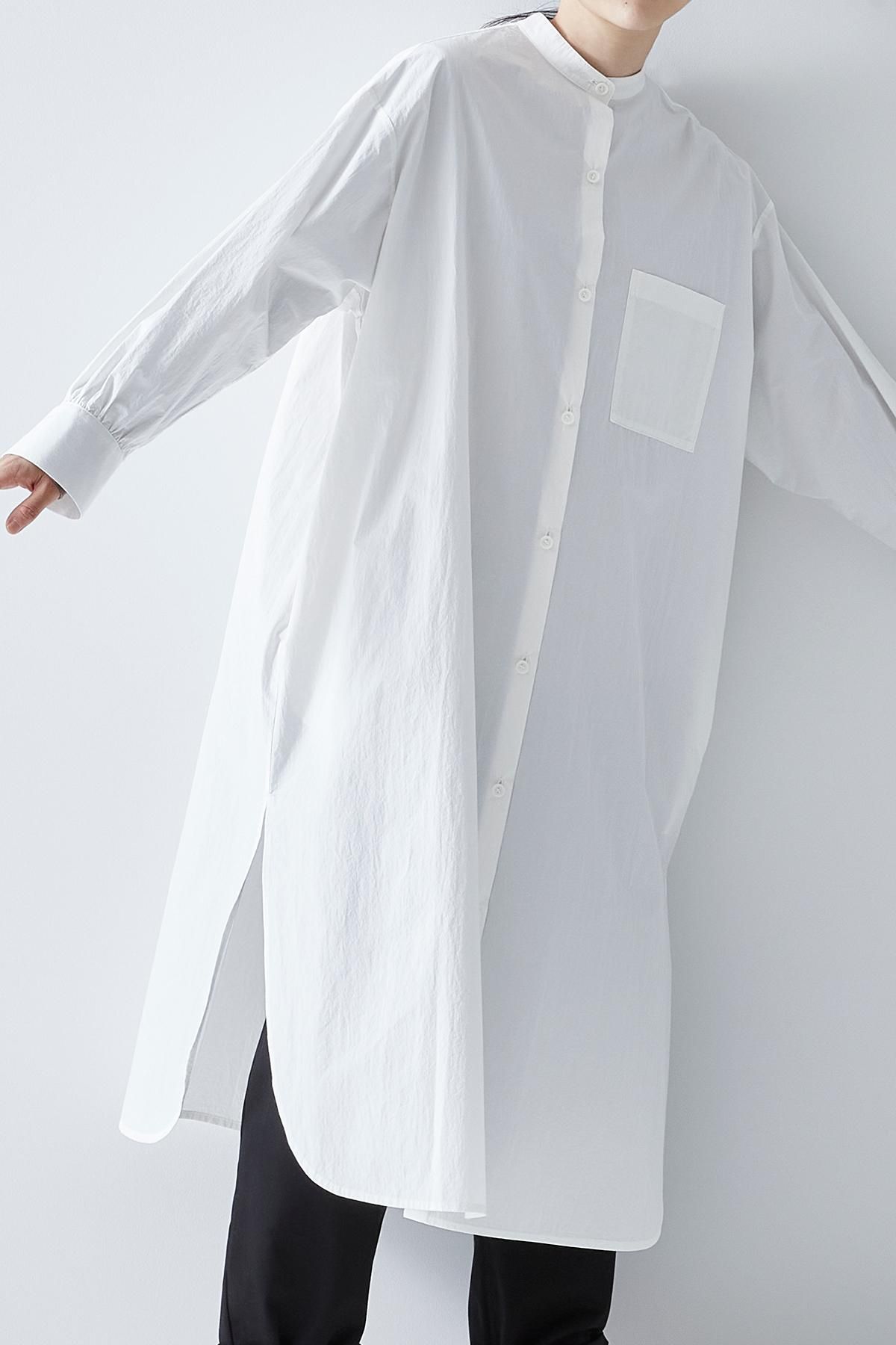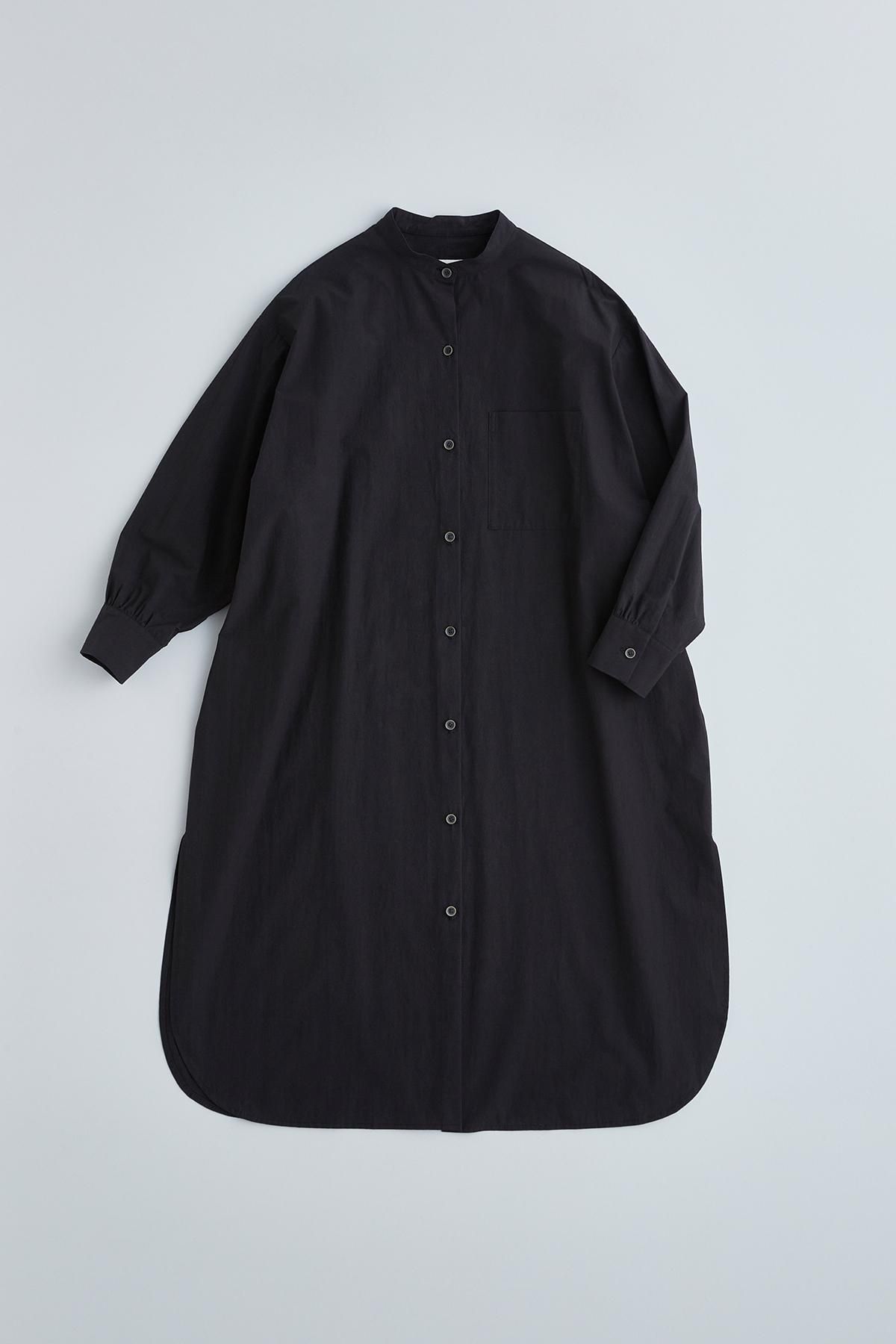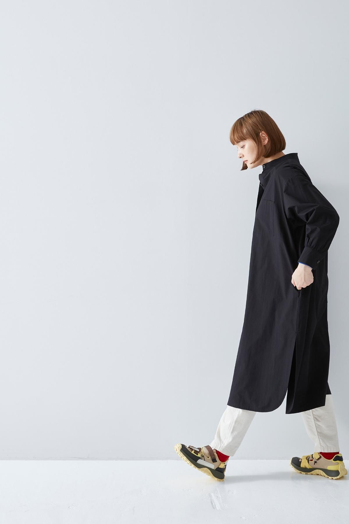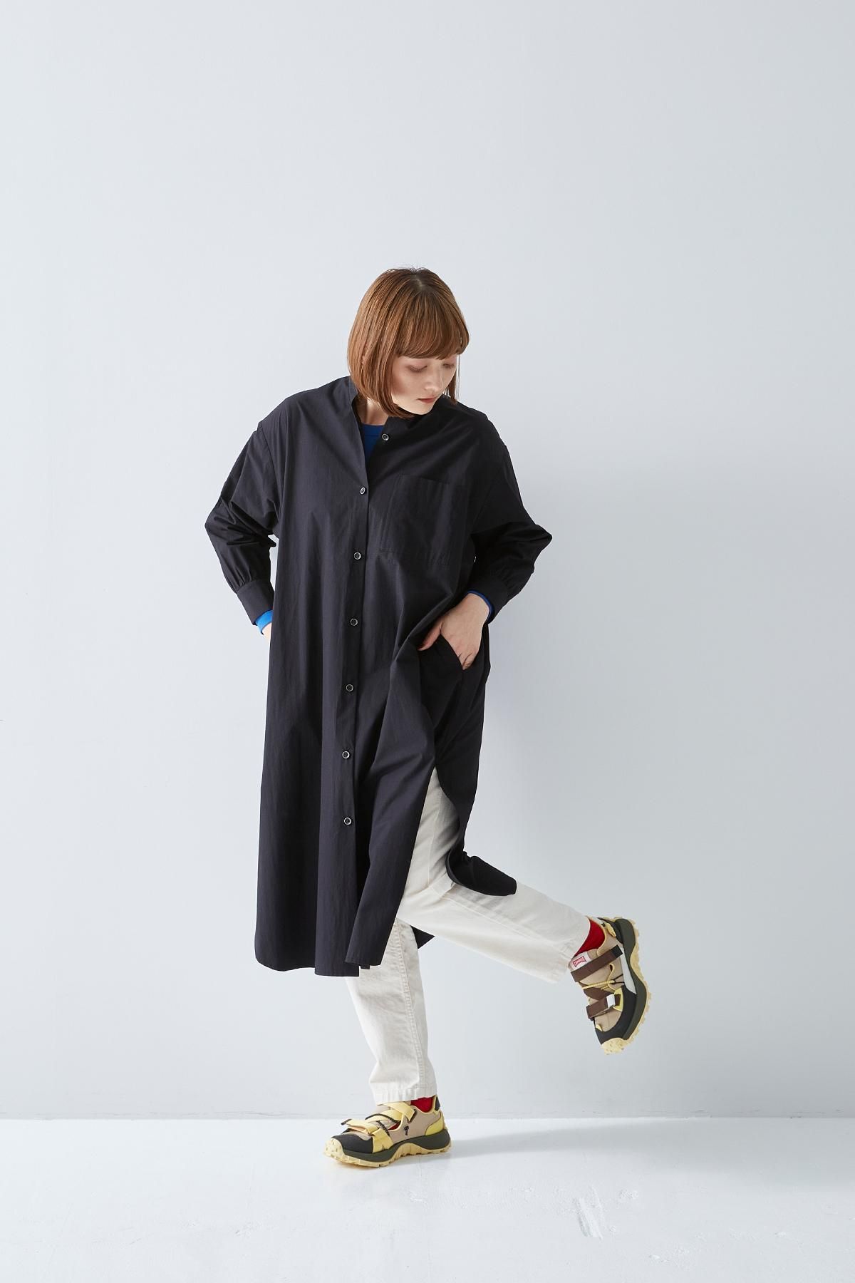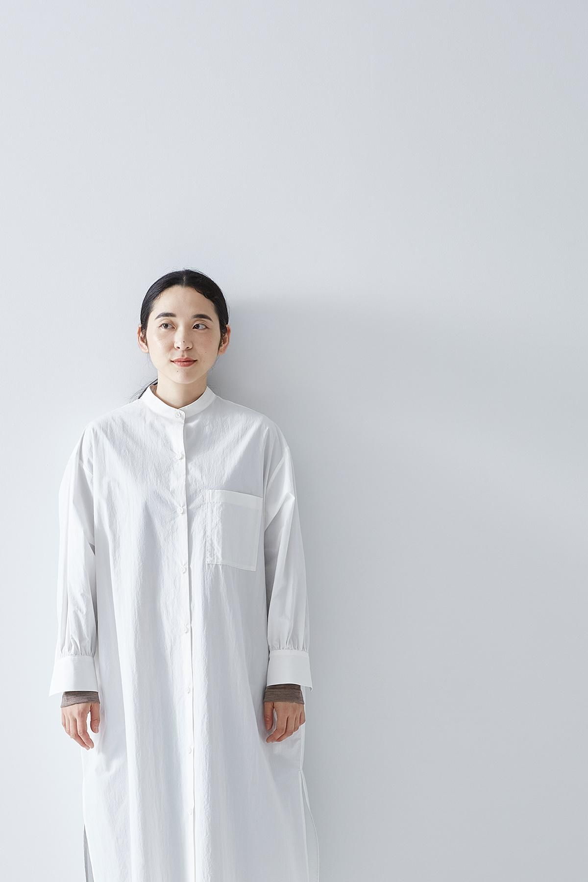 バンドカラーがシャープな印象のワンピースのようなロング丈シャツ。身巾、袖巾ともにゆったり大きめのサイズ感で、通年着ていただける素材感です。