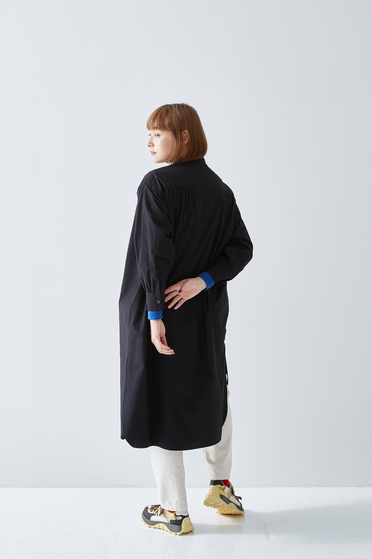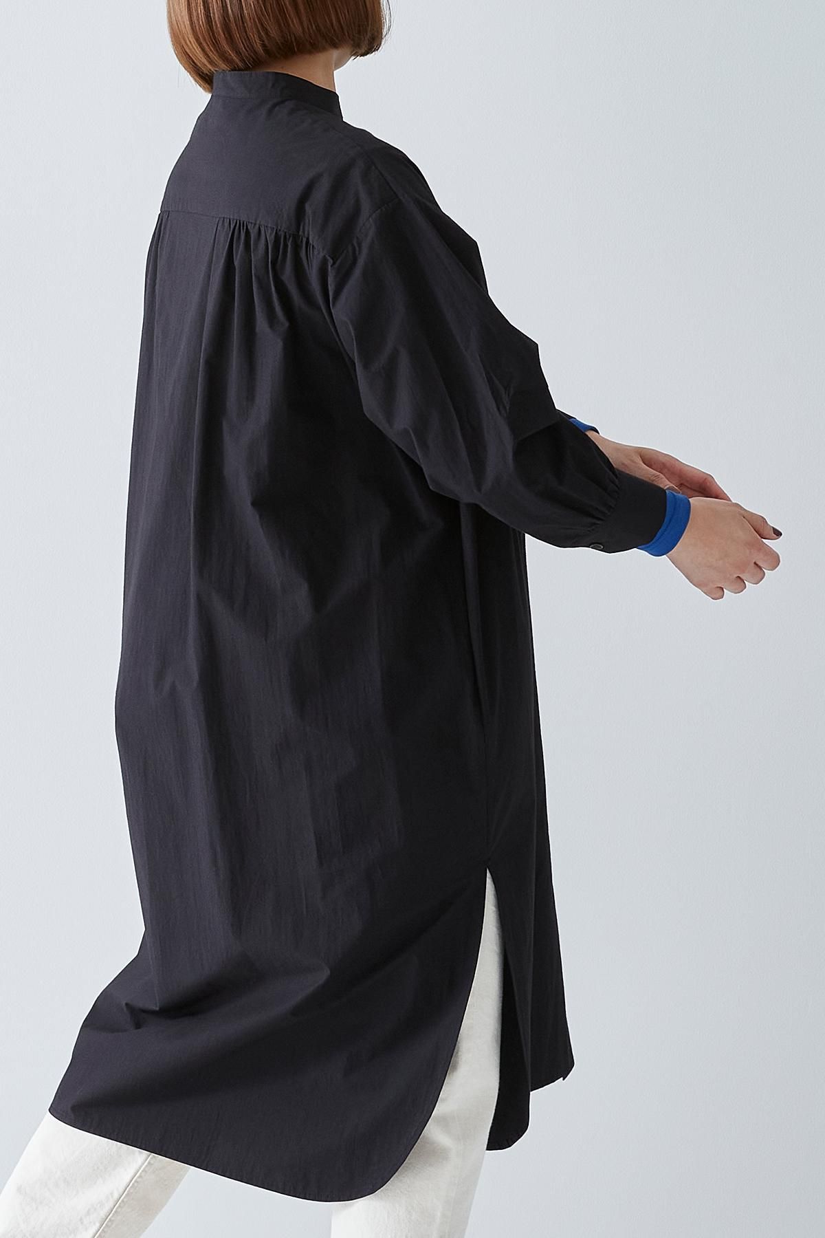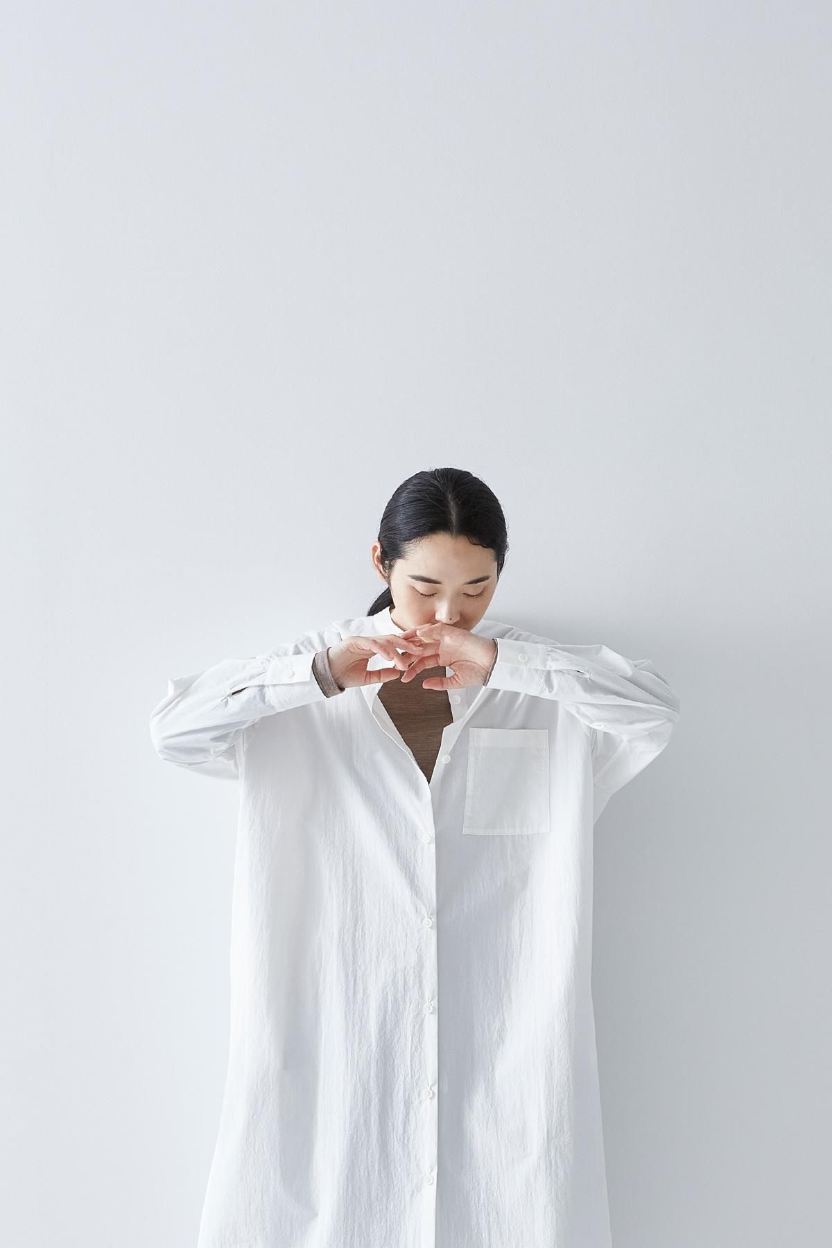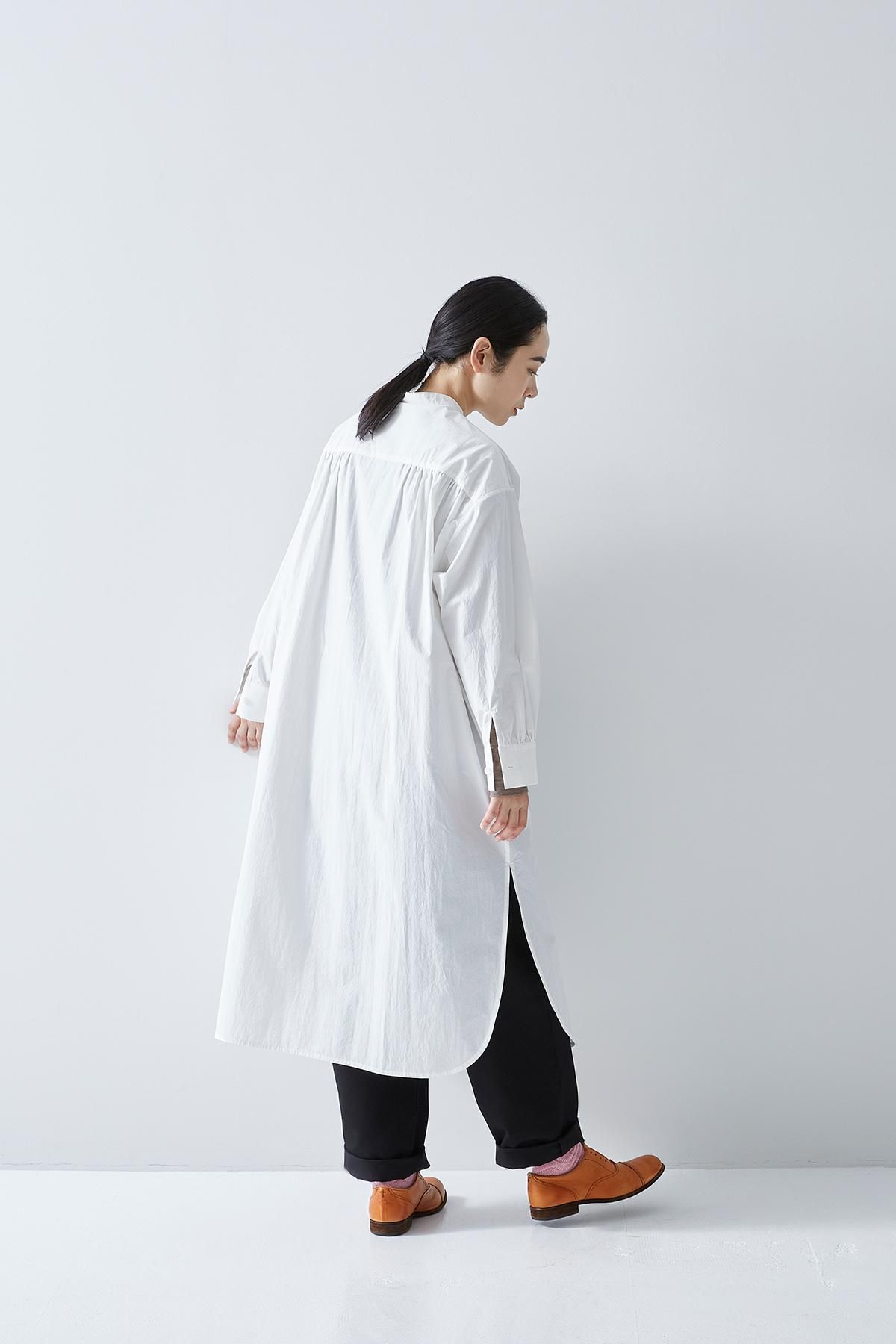 バンドカラーがシャープな印象のワンピースのようなロング丈シャツ。身巾、袖巾ともにゆったり大きめのサイズ感で、通年着ていただける素材感です。