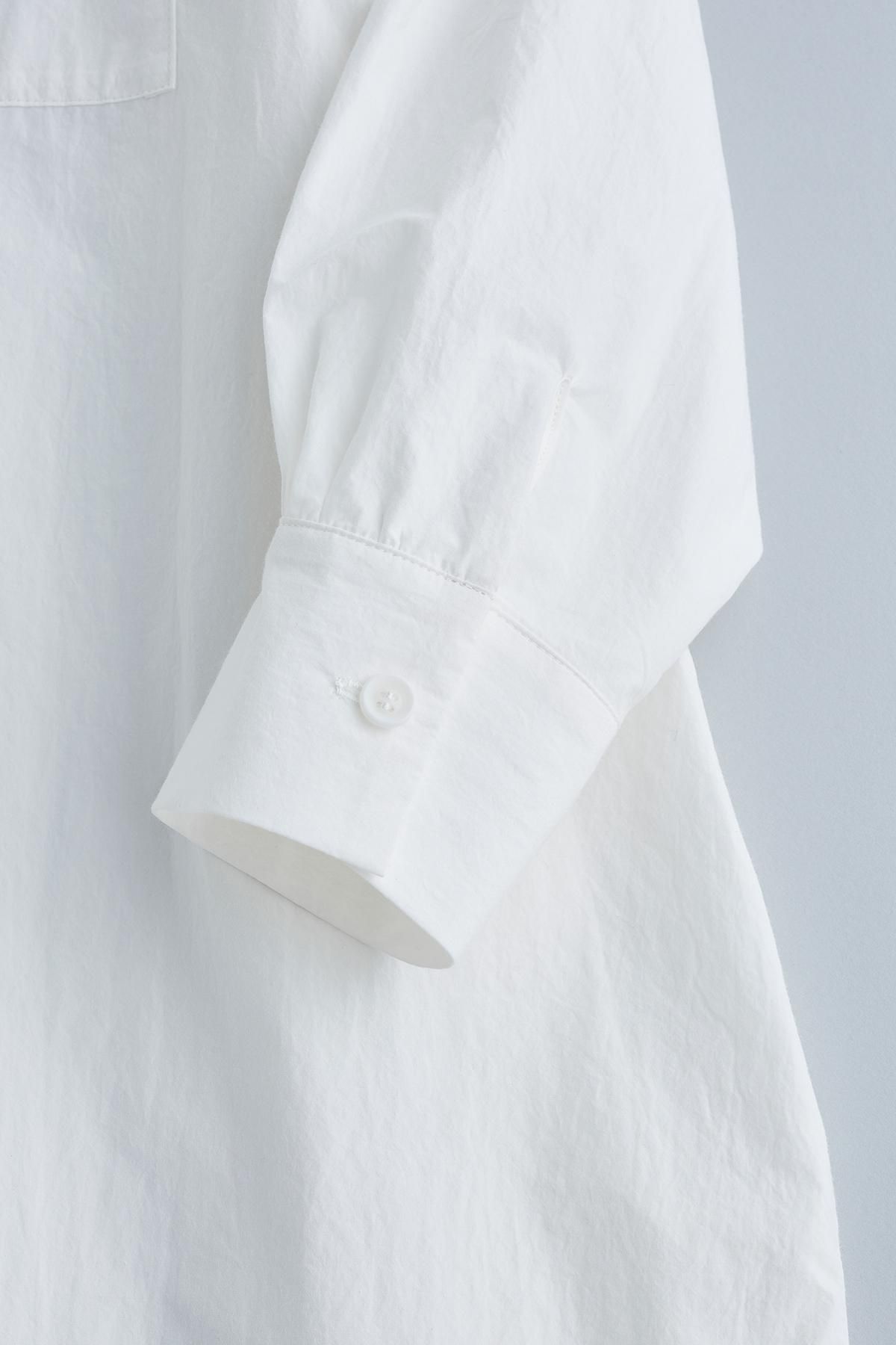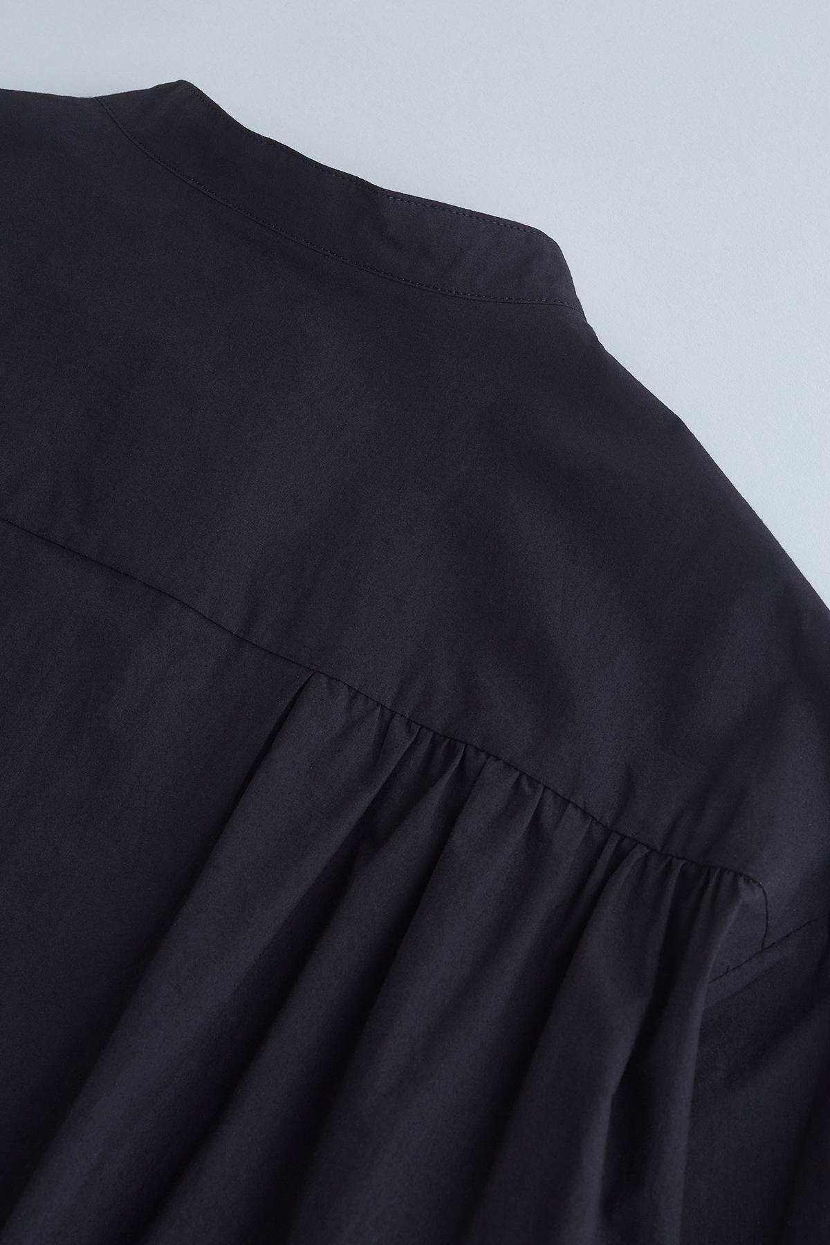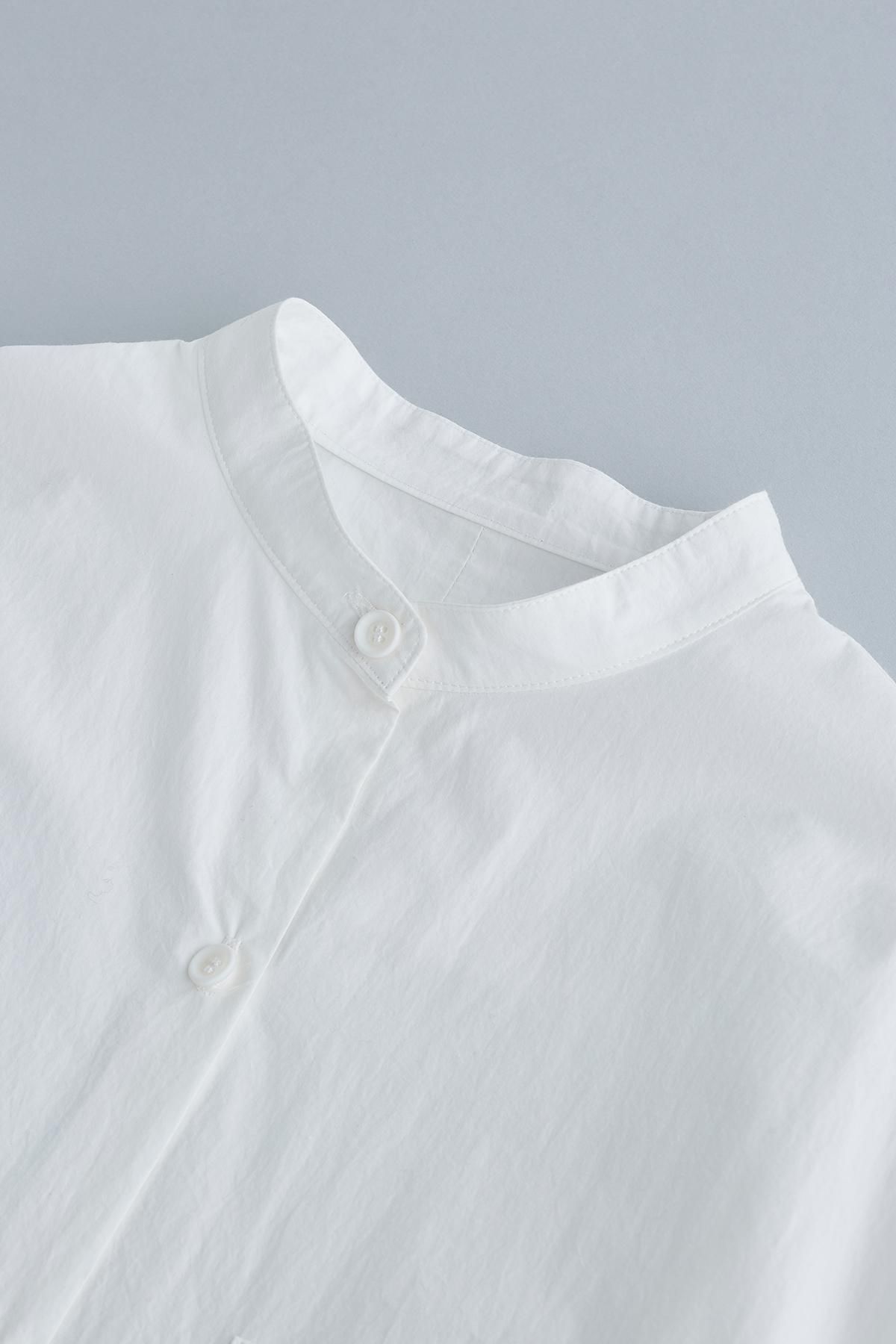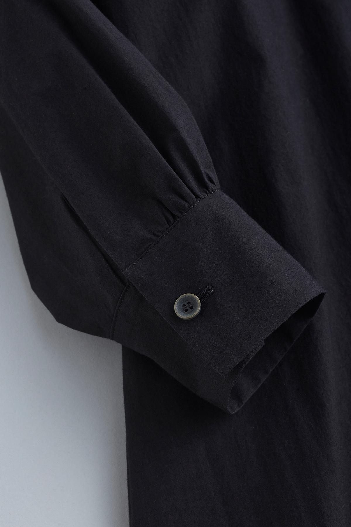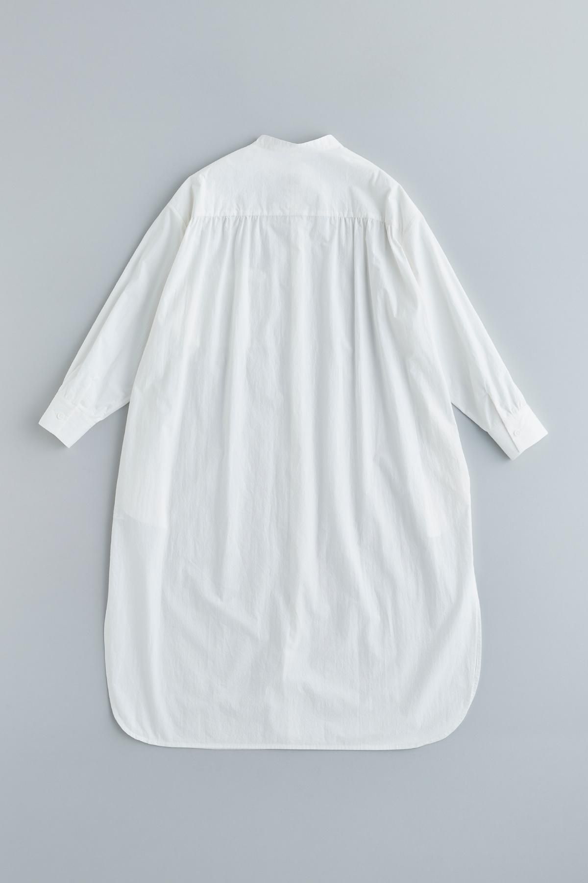 バンドカラーがシャープな印象のワンピースのようなロング丈シャツ。身巾、袖巾ともにゆったり大きめのサイズ感で、通年着ていただける素材感です。