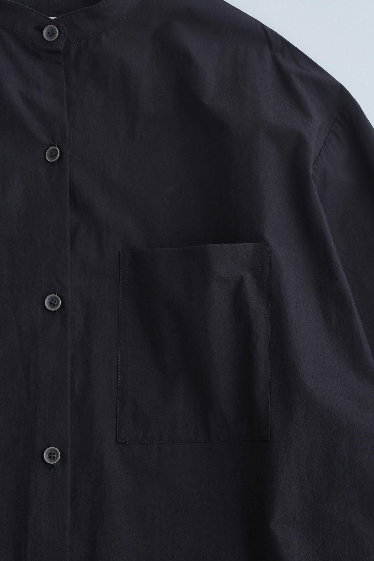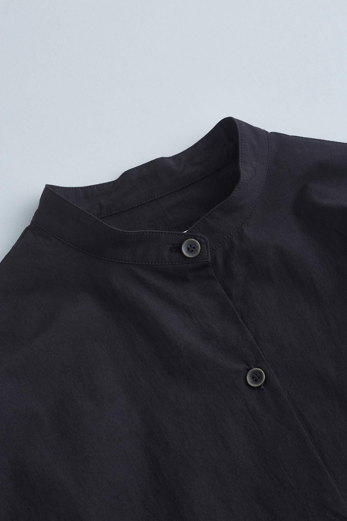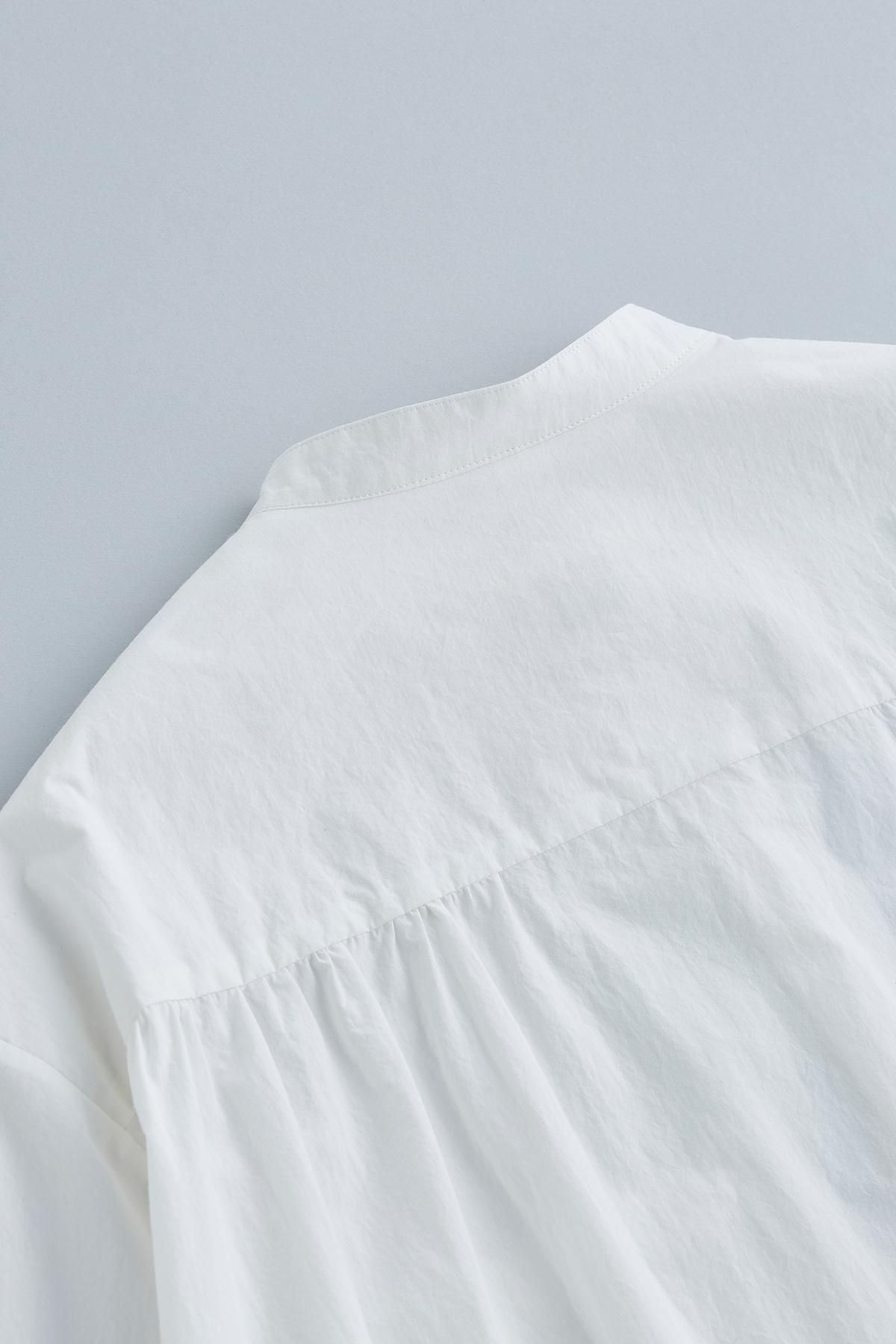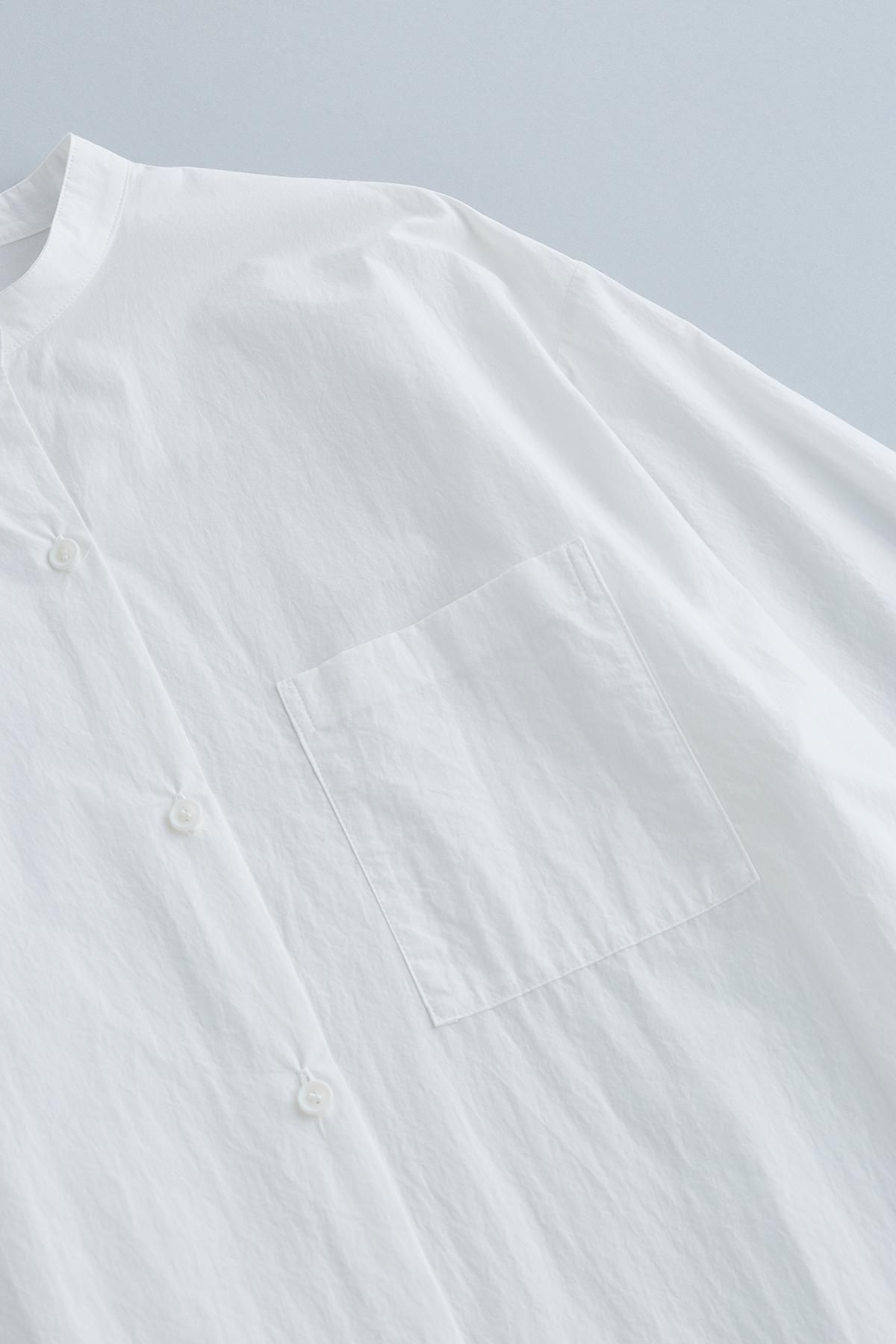 バンドカラーがシャープな印象のワンピースのようなロング丈シャツ。身巾、袖巾ともにゆったり大きめのサイズ感で、通年着ていただける素材感です。