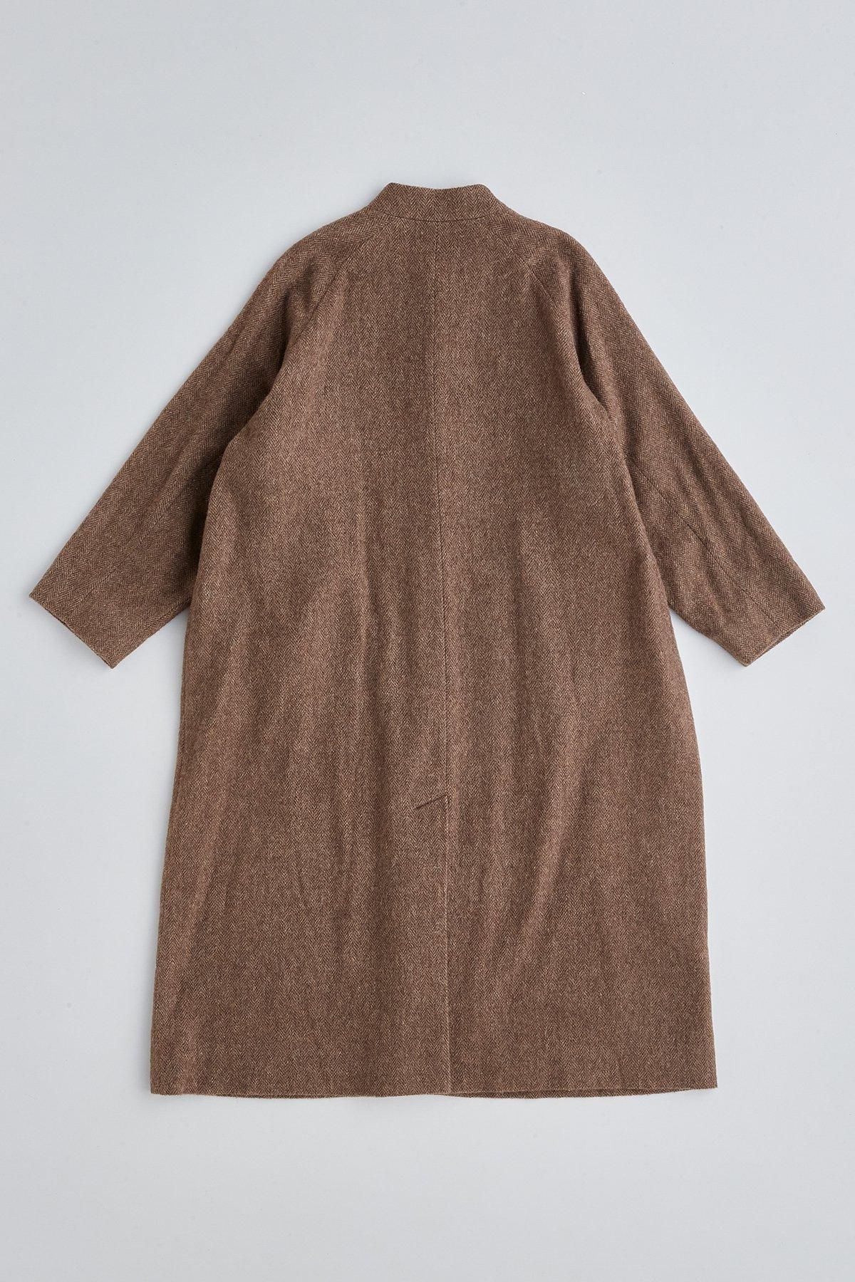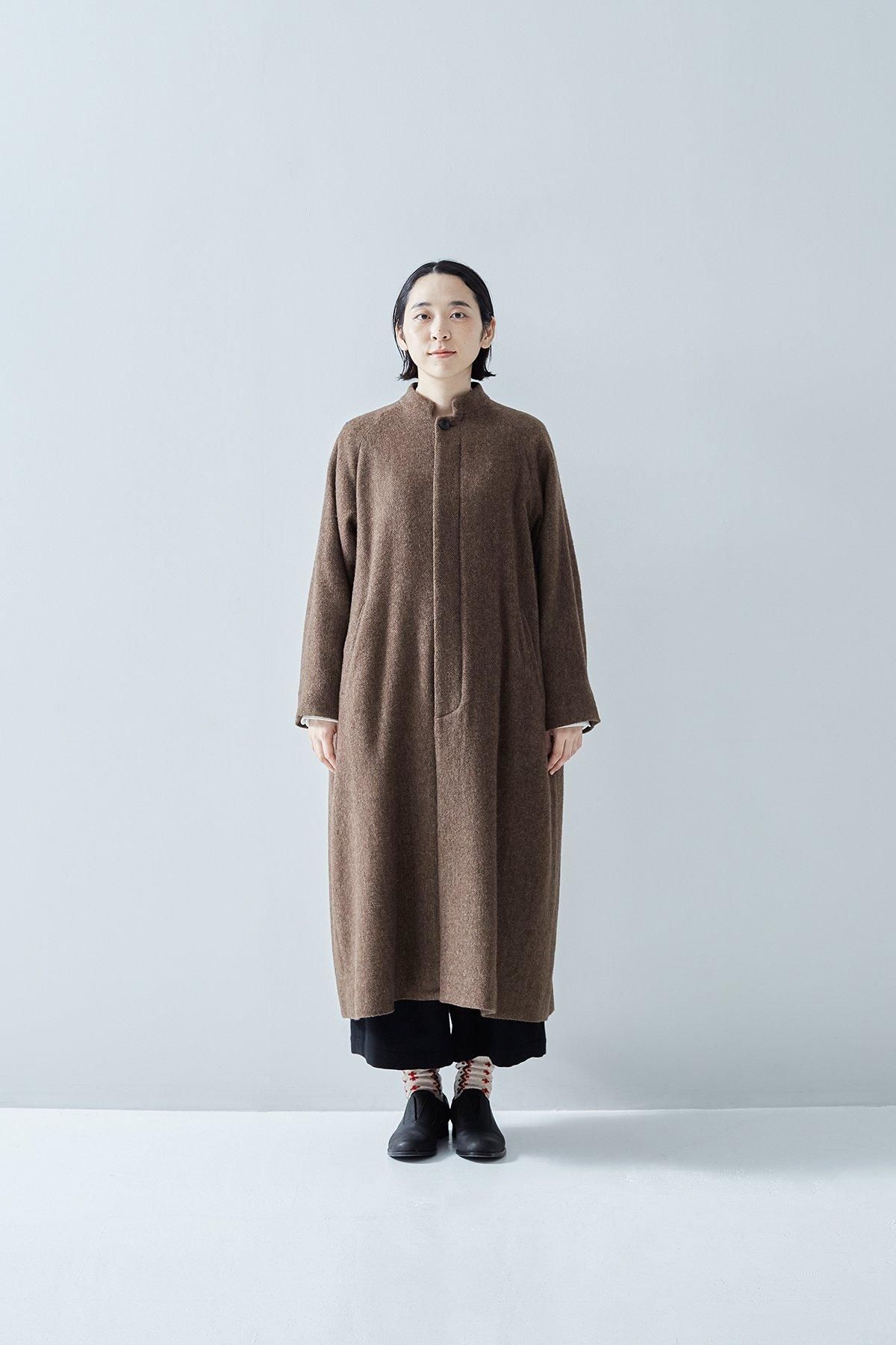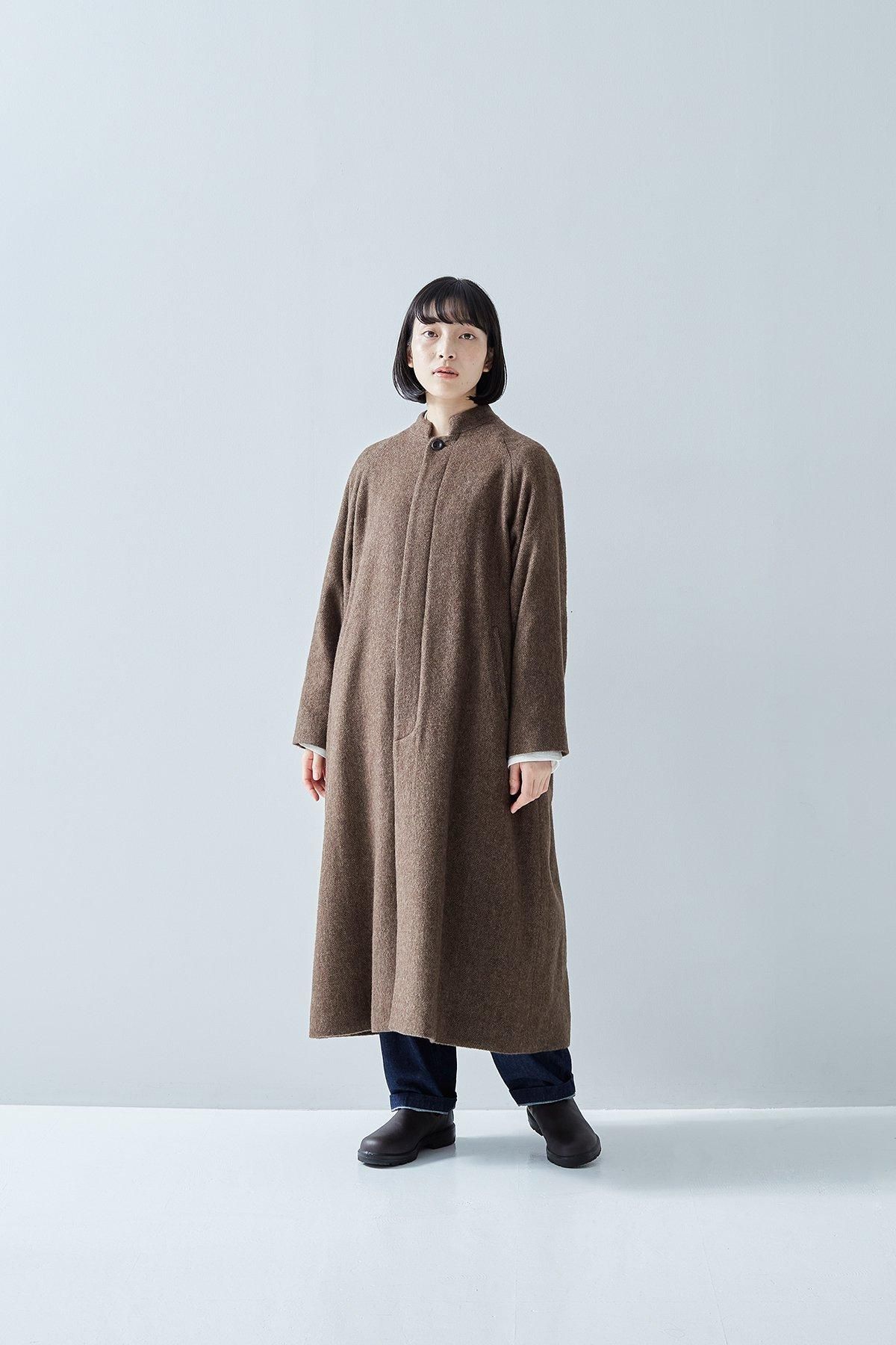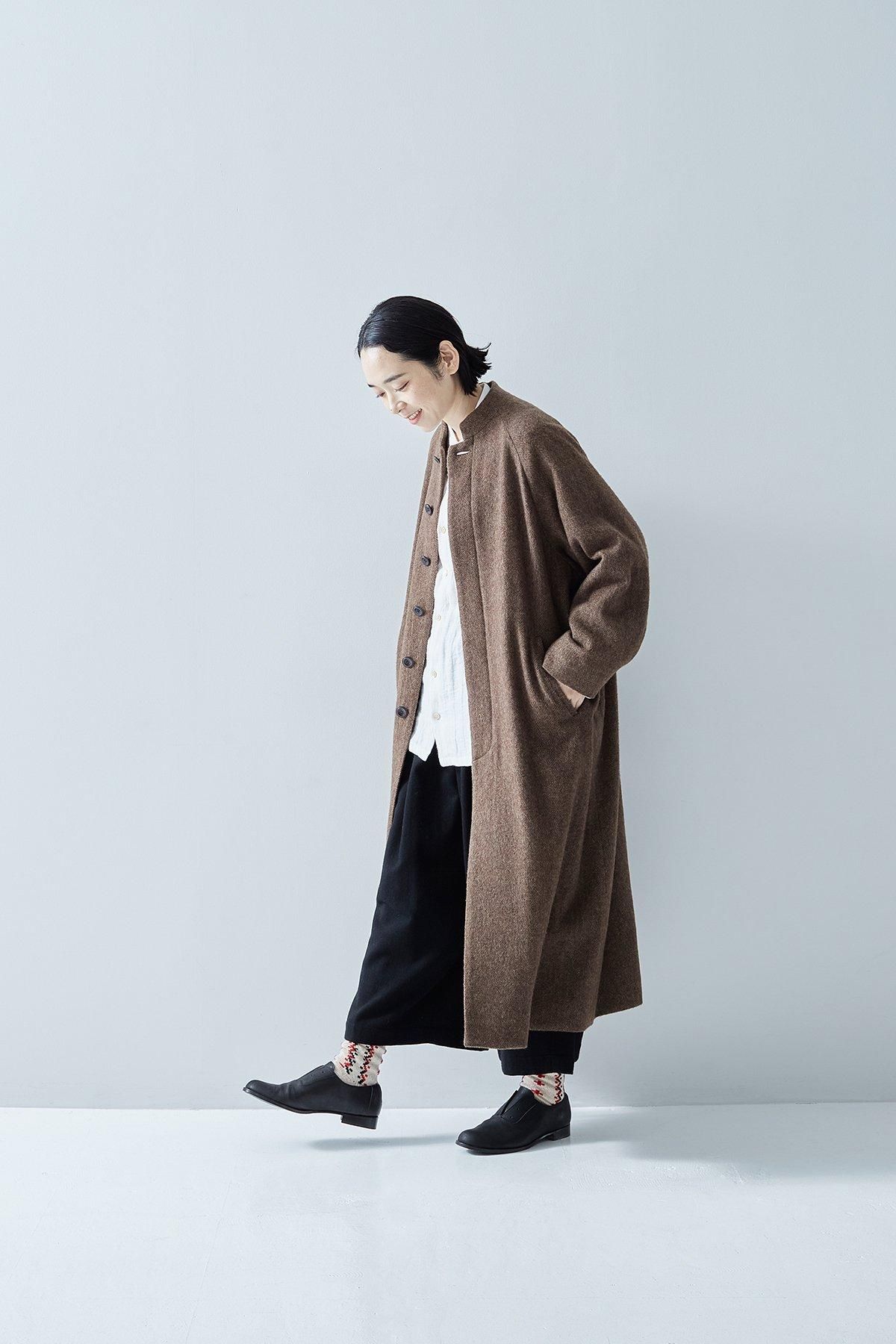 2022a/w に好評だったコットンヘンプのスタンドカラーコートを、あたたかなウールリネンツィードでつくりました。