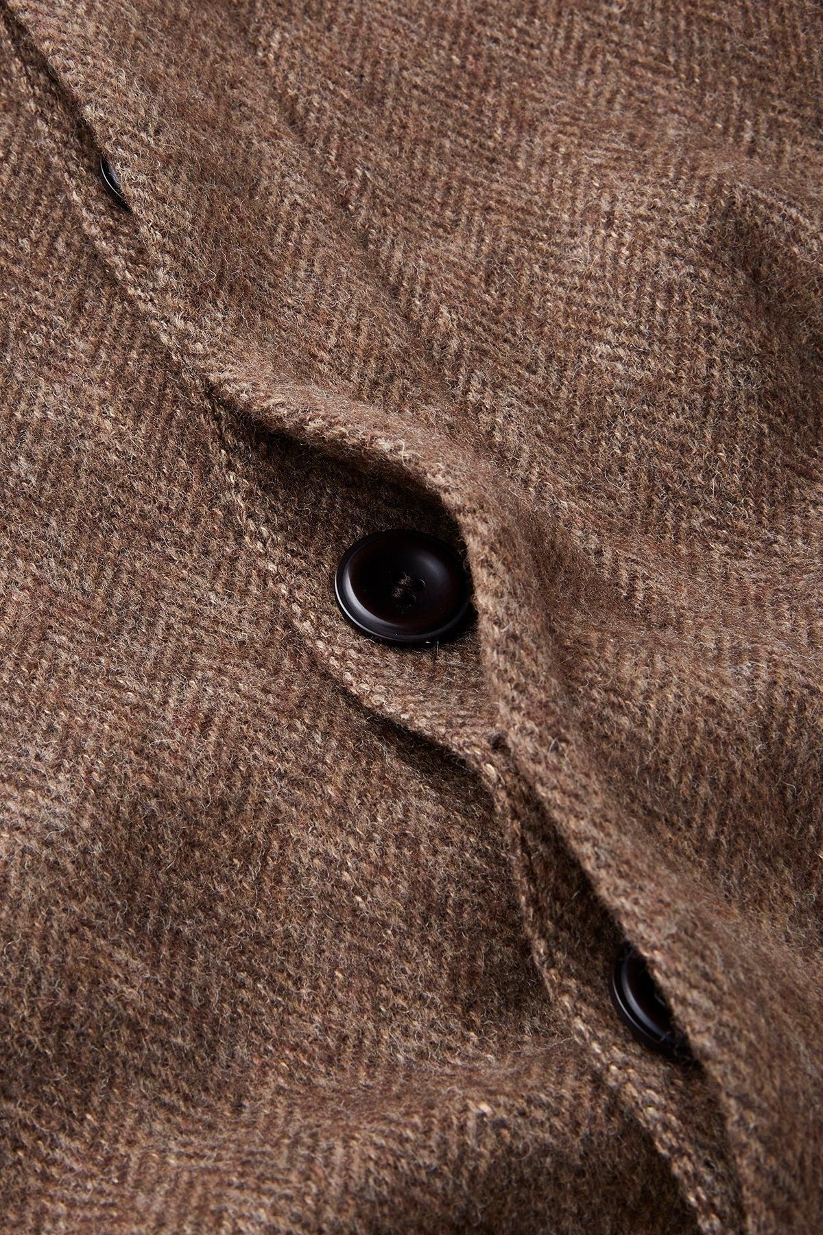 ・使用している布地は、紡毛糸とフレンチリネンを撚り合わせた杢糸を使ったビーバーヘリンボーン生地。起毛ウールにリネンをブレンドすることで、ウールよりもライトでふんわりとした風合いになっています