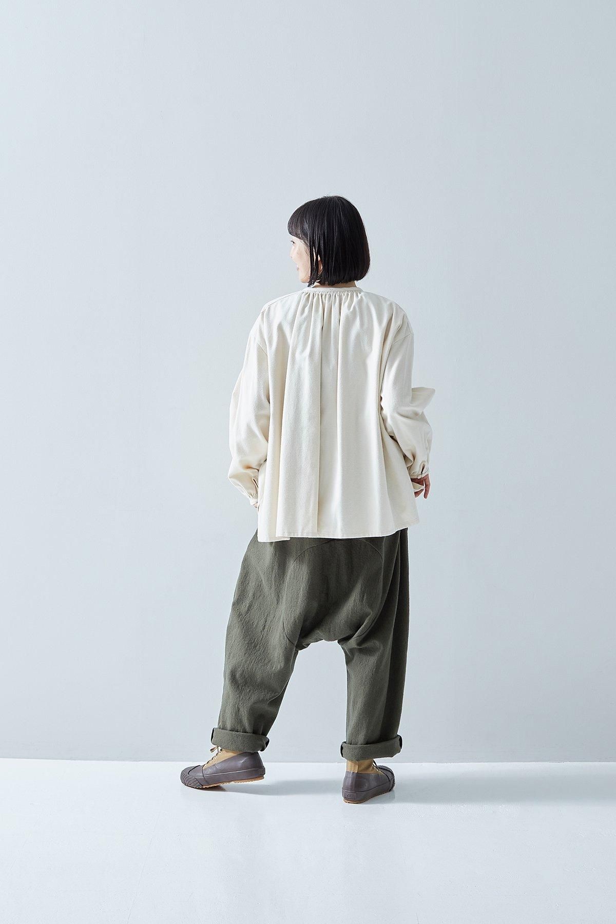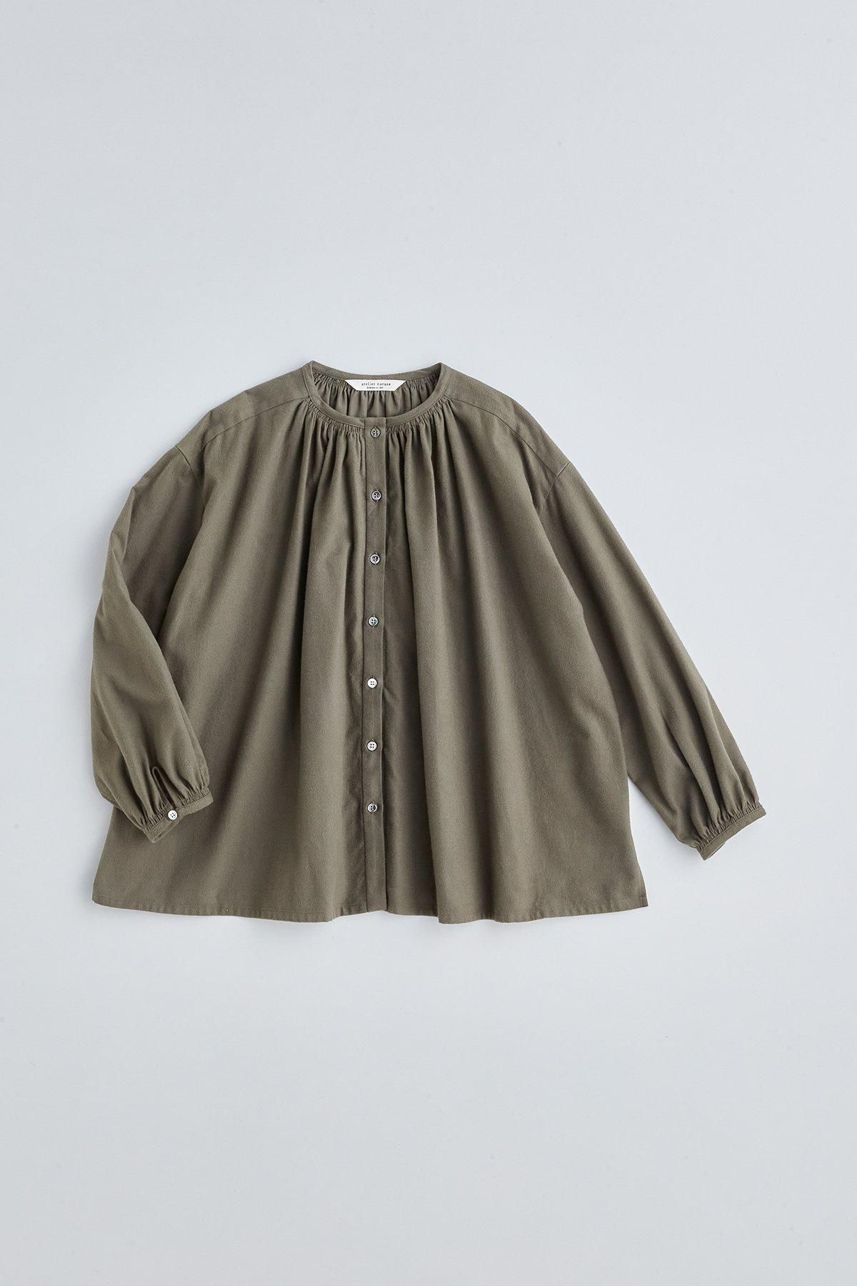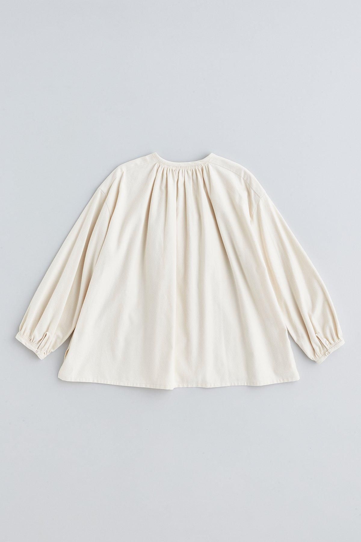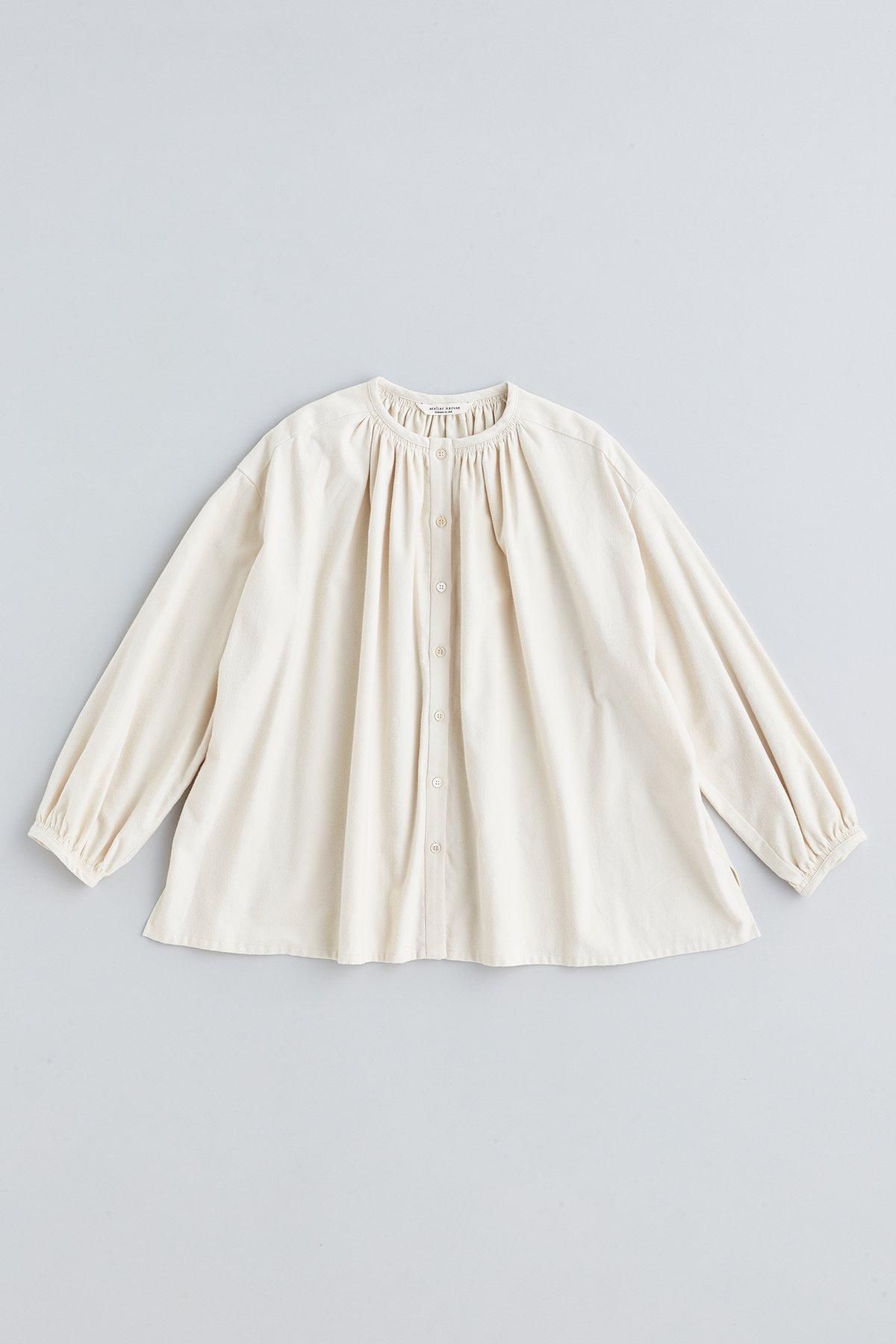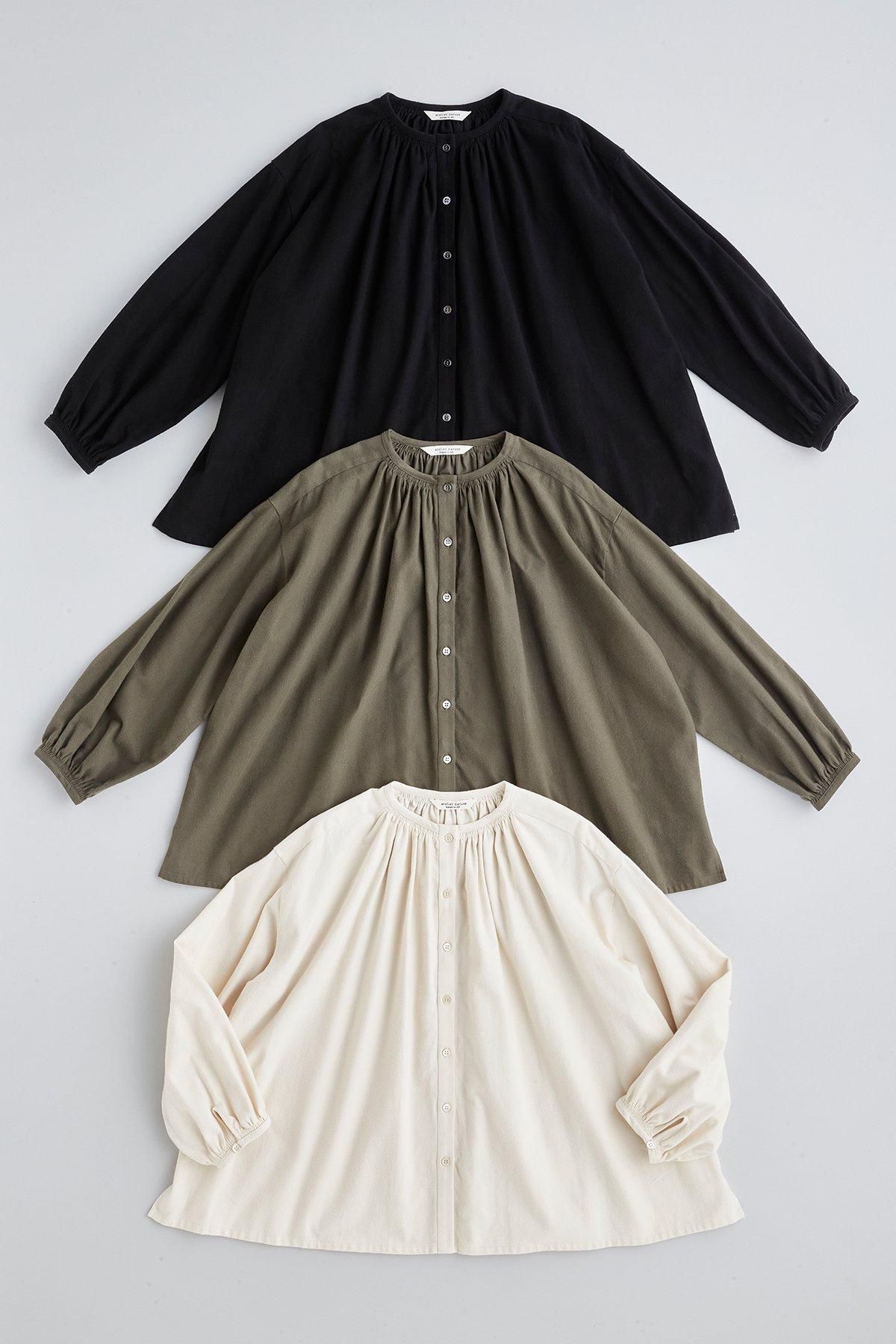 繊細なネックや袖口のステッチギャザーや肩ヨークといったアンティークブラウスのようなディテールを取り入れたオーガニックコットンのブラウスです。