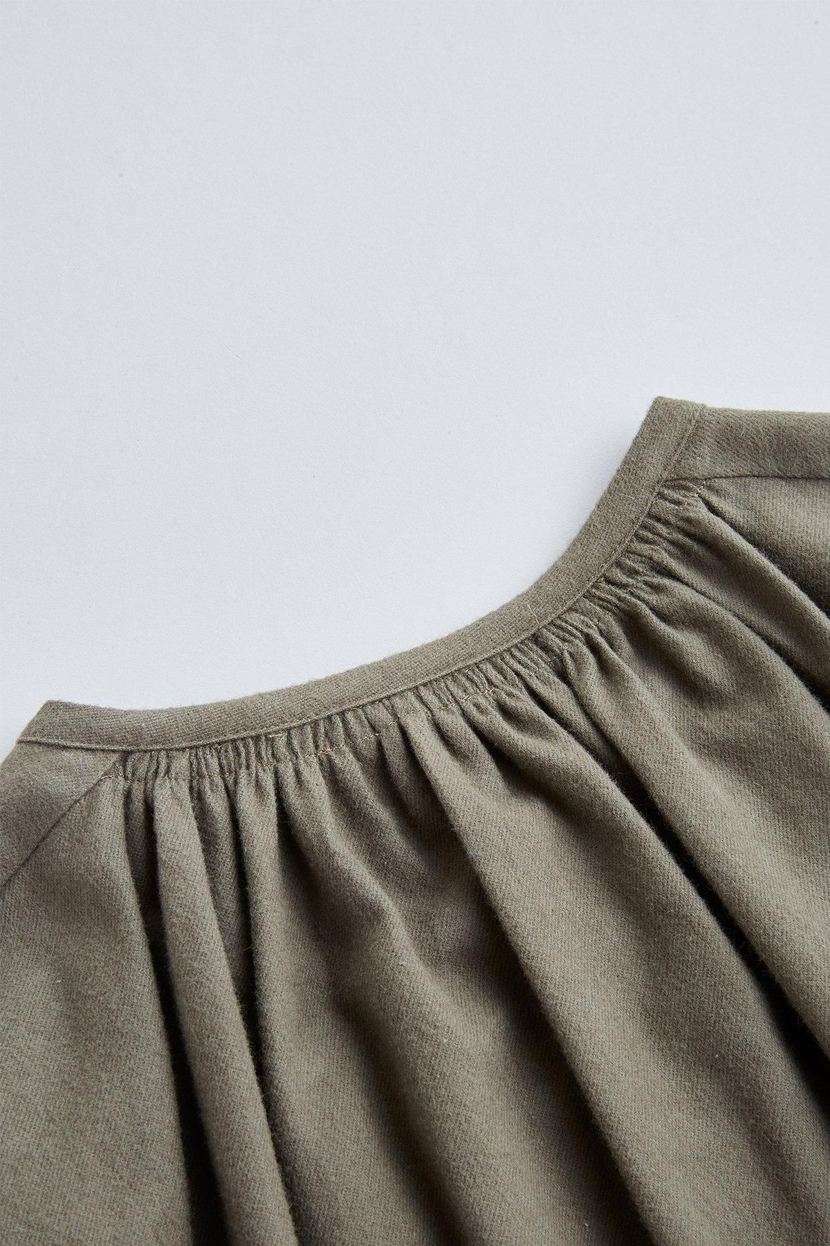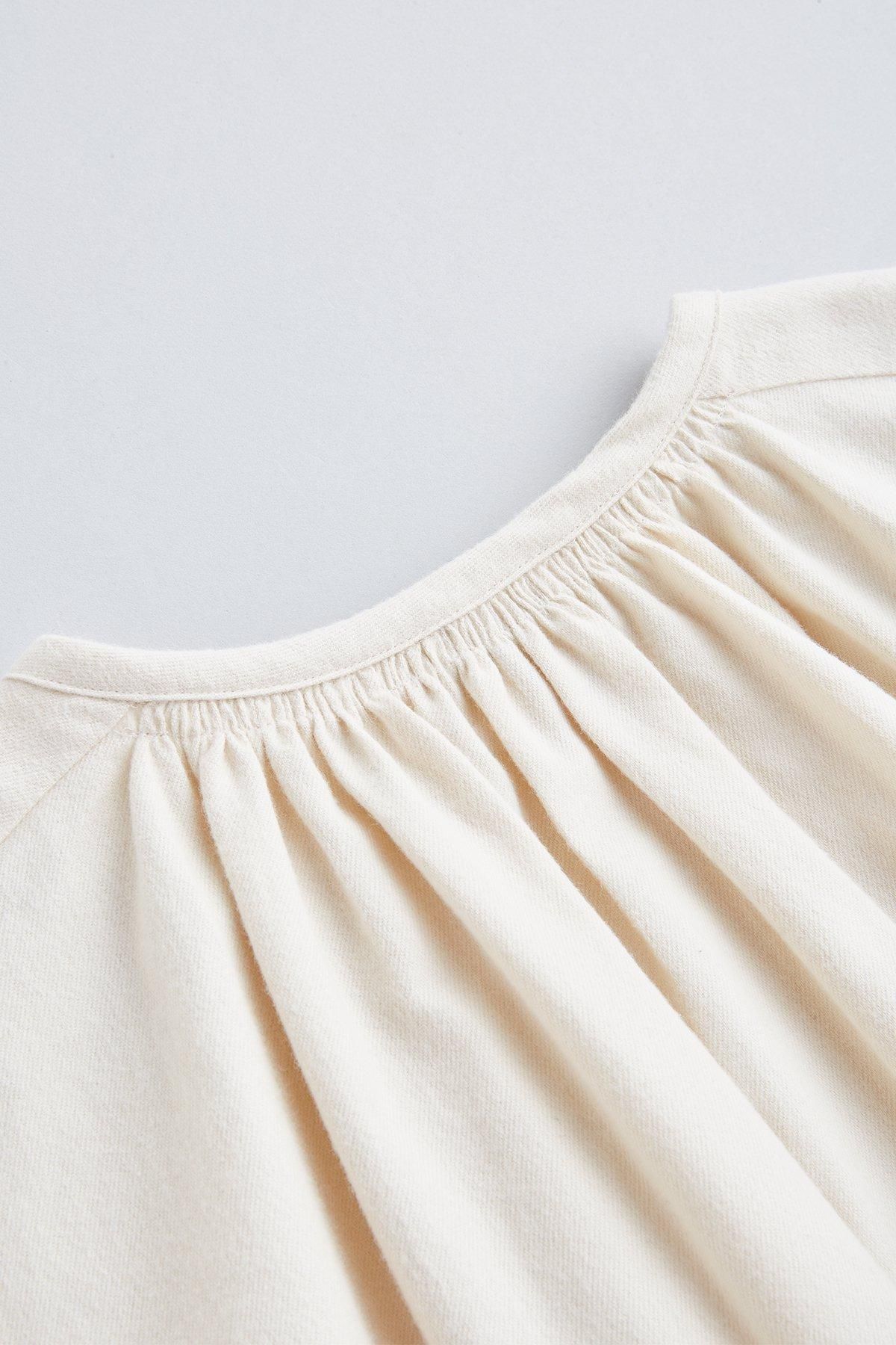 ・繊細なステッチギャザーが、ネックと袖口に入っています