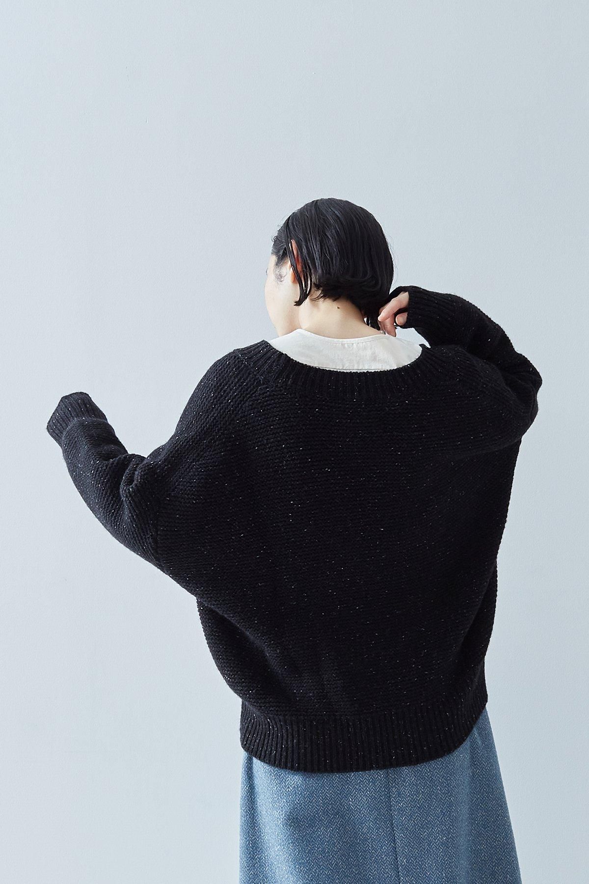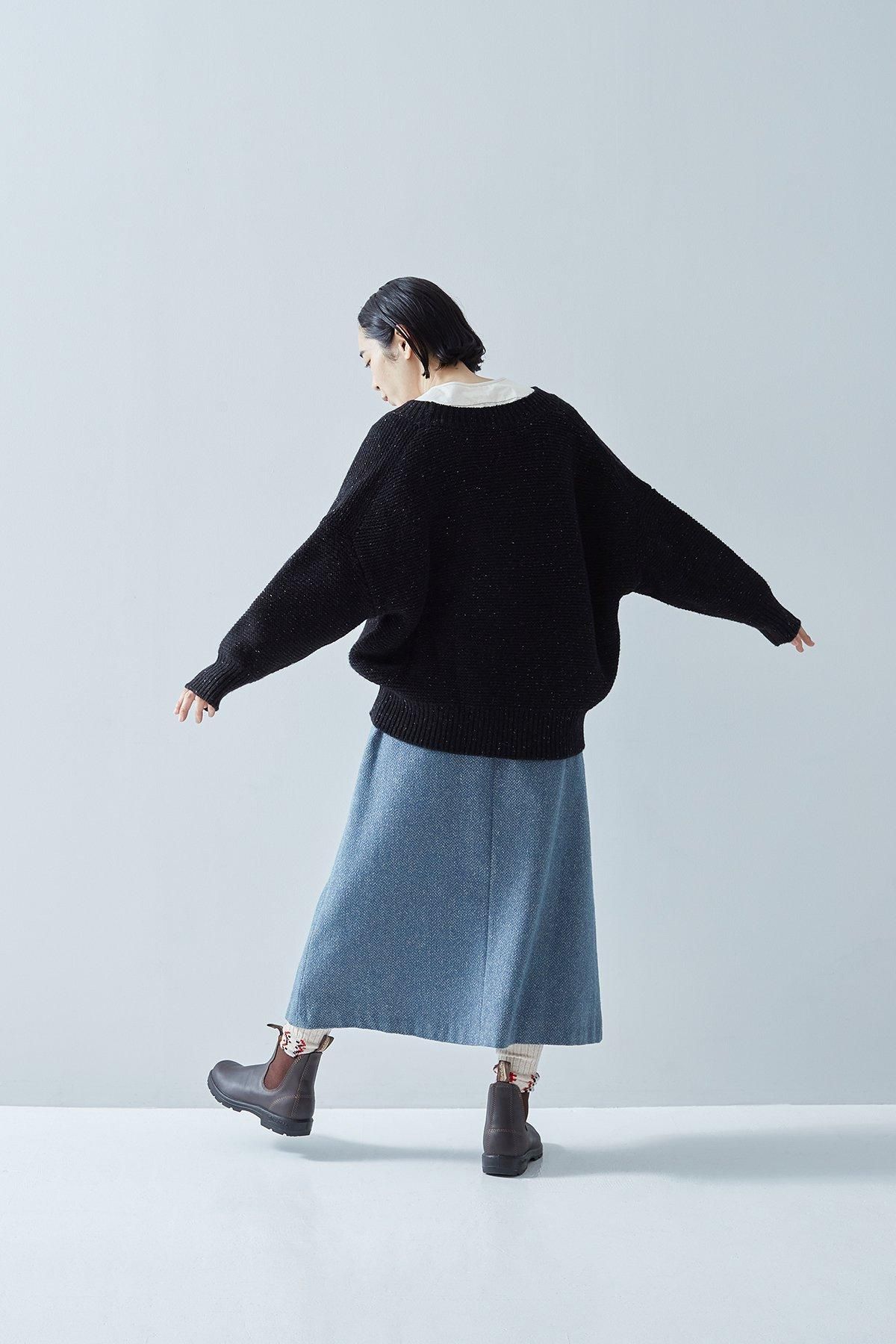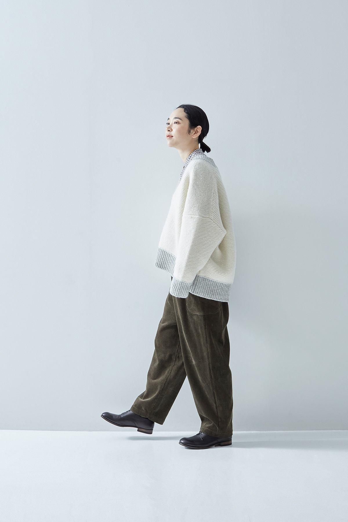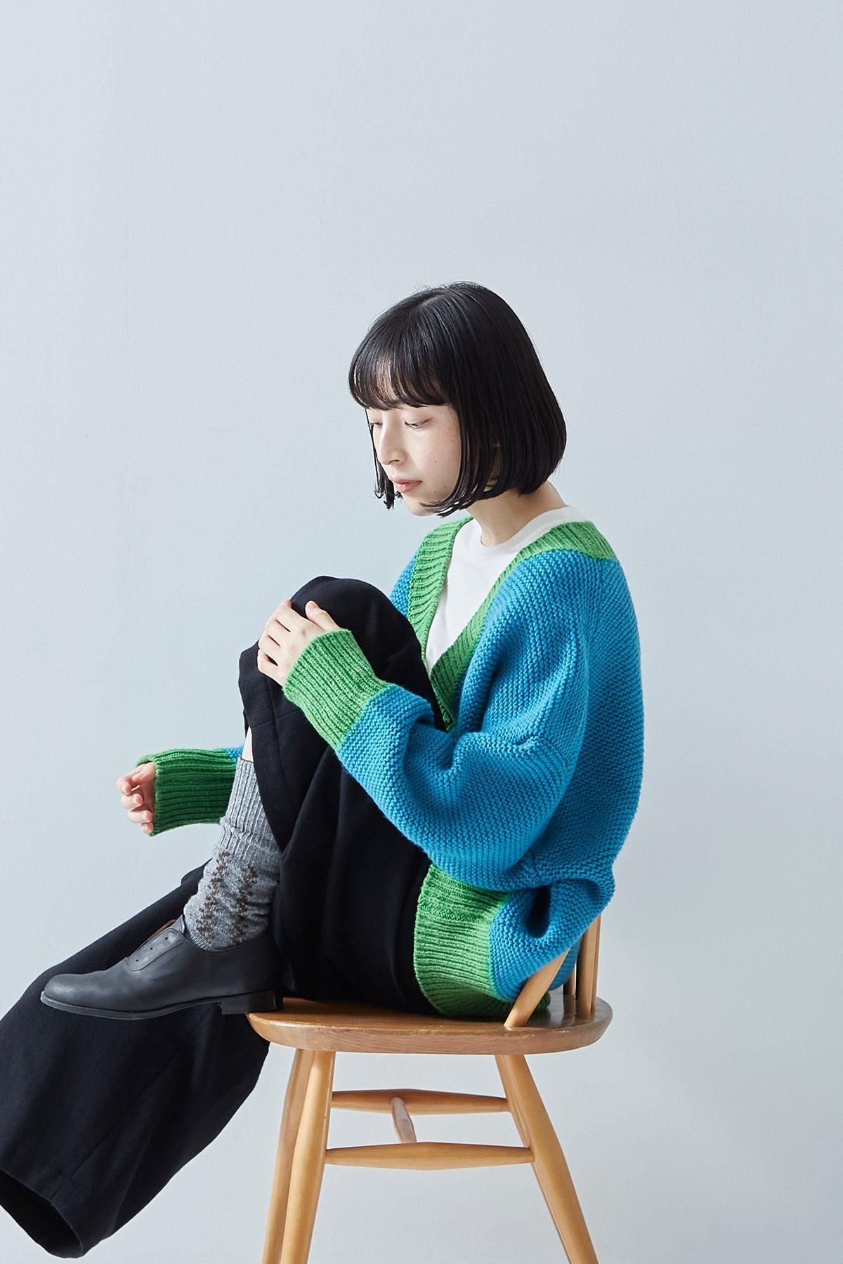 ・ローゲージのガーター編みにすることで、ふんわりとした糸の特徴を活かしたバルキーで手編み感のある編地に仕上げています