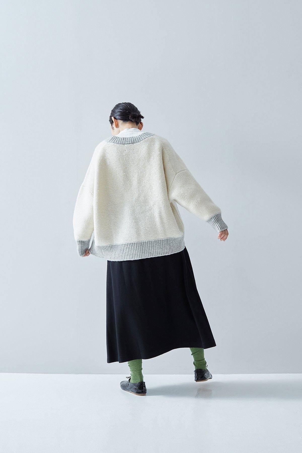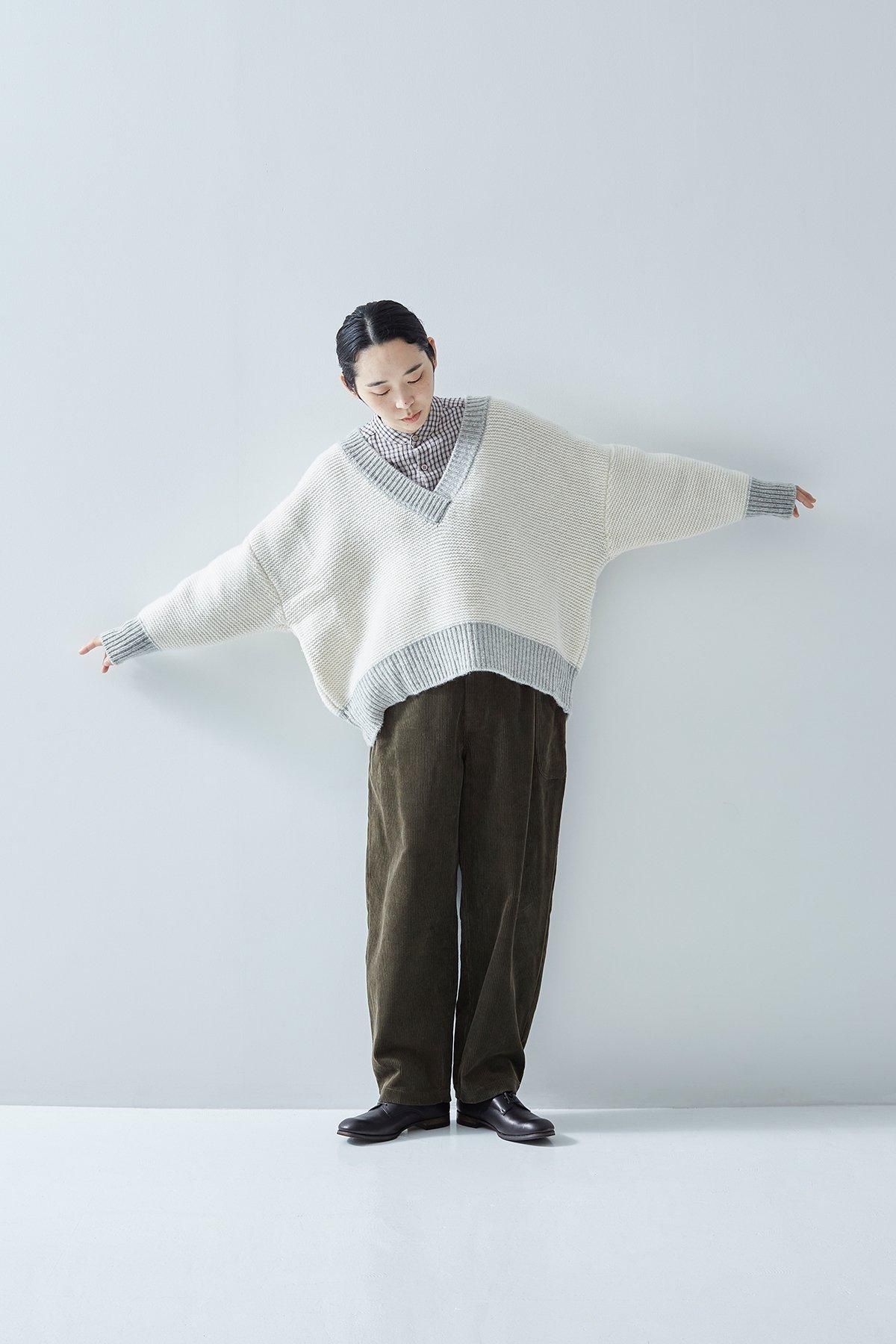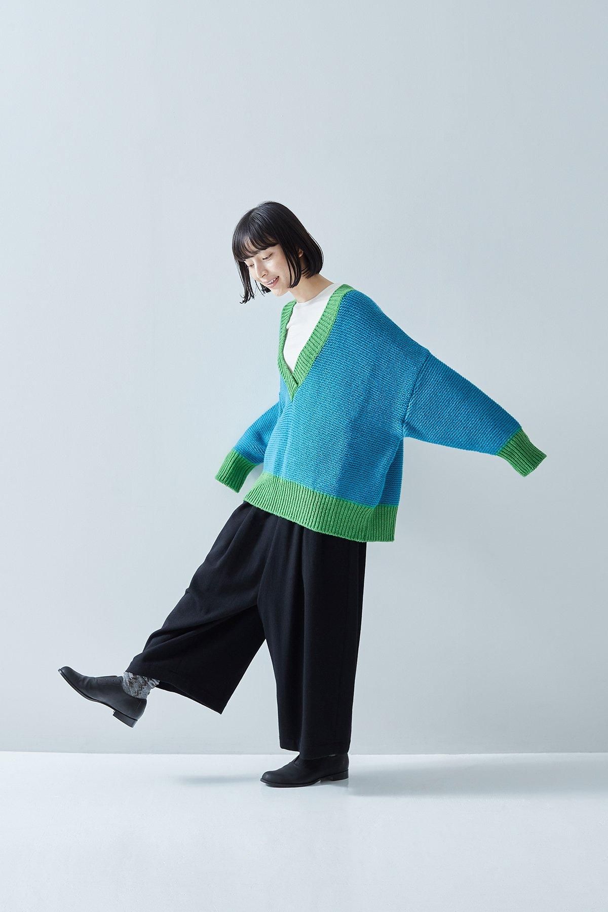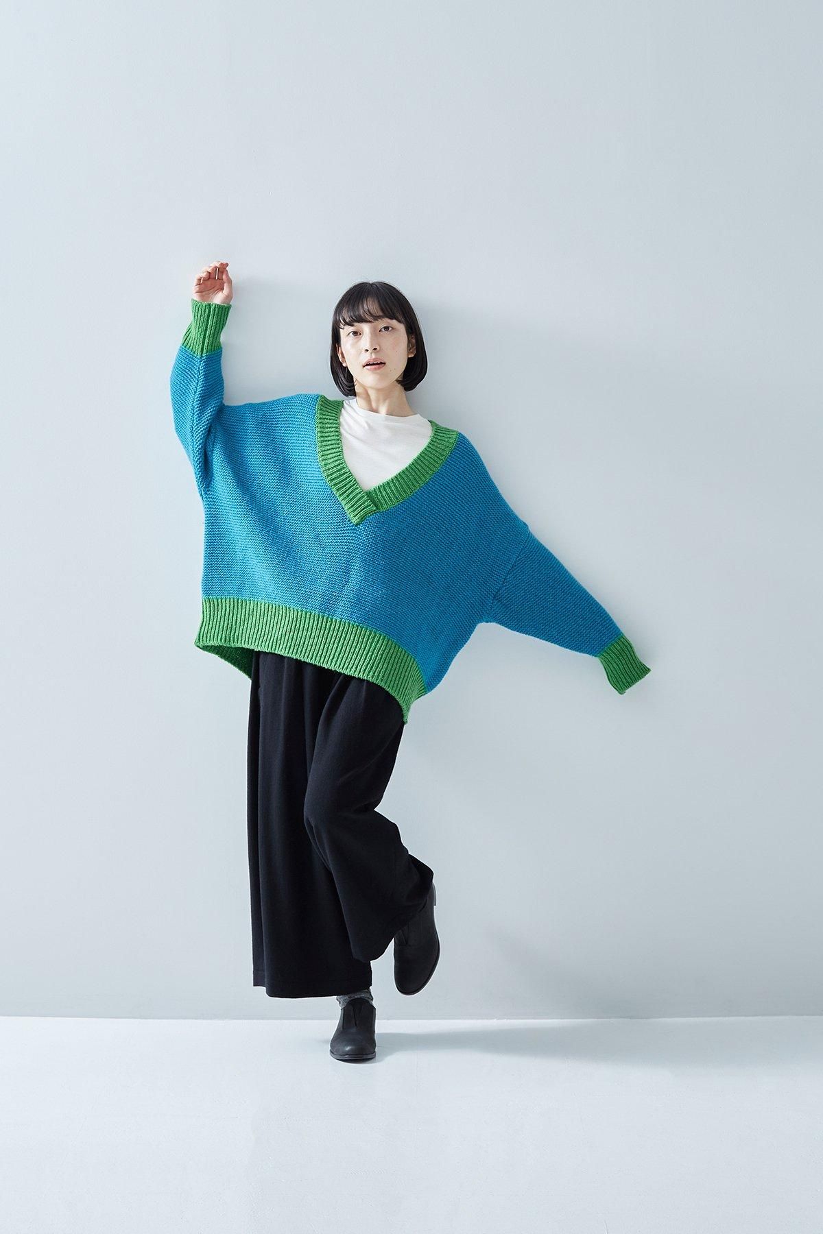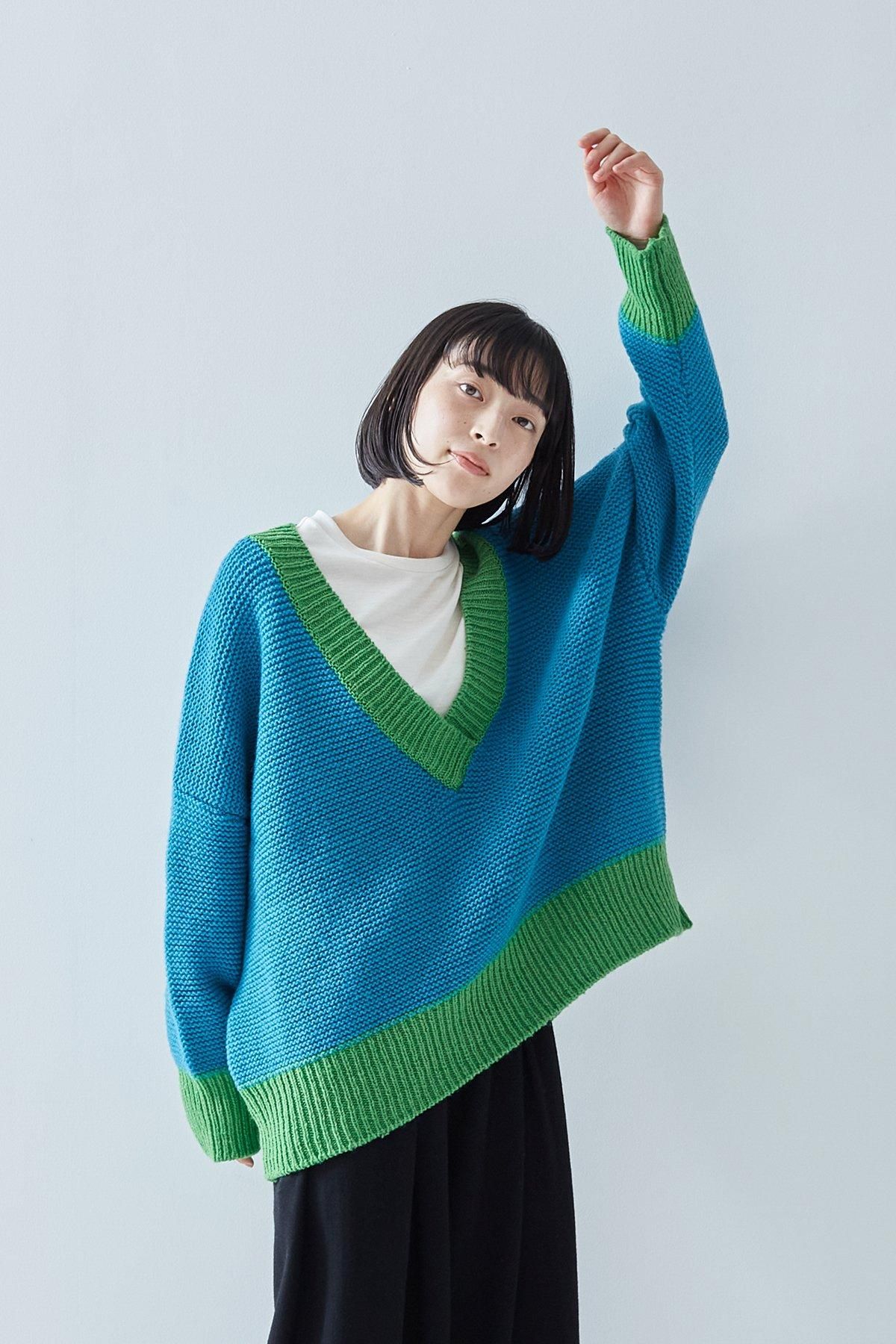 ・ローゲージのガーター編みにすることで、ふんわりとした糸の特徴を活かしたバルキーで手編み感のある編地に仕上げています
