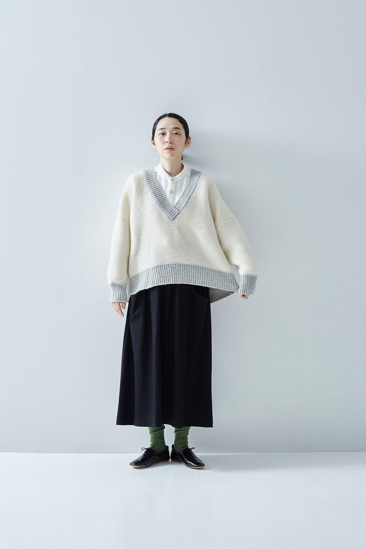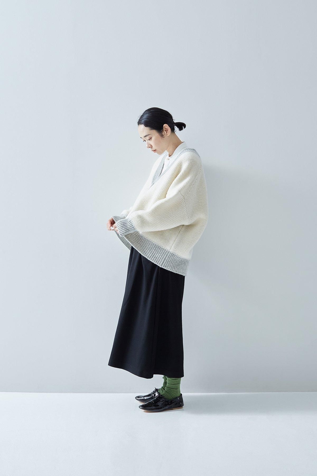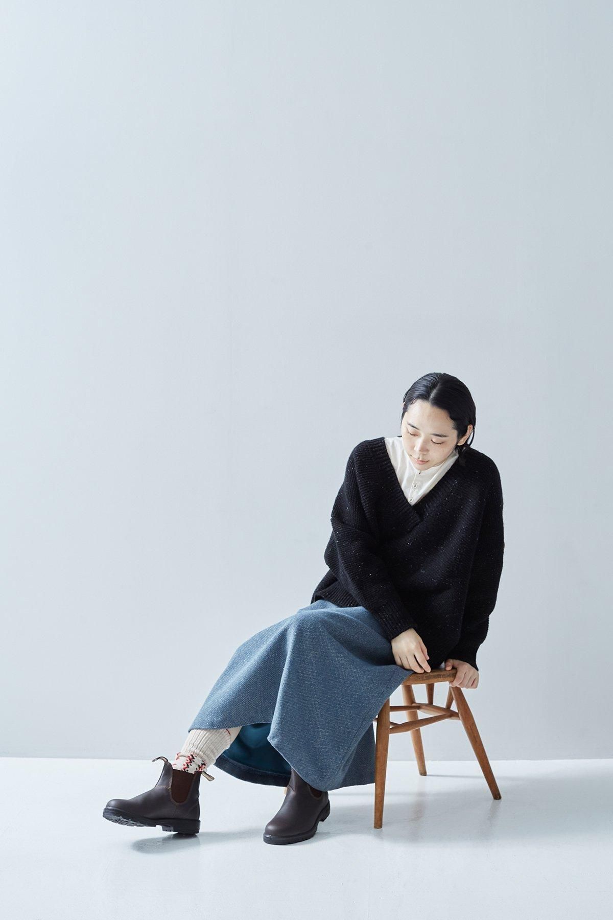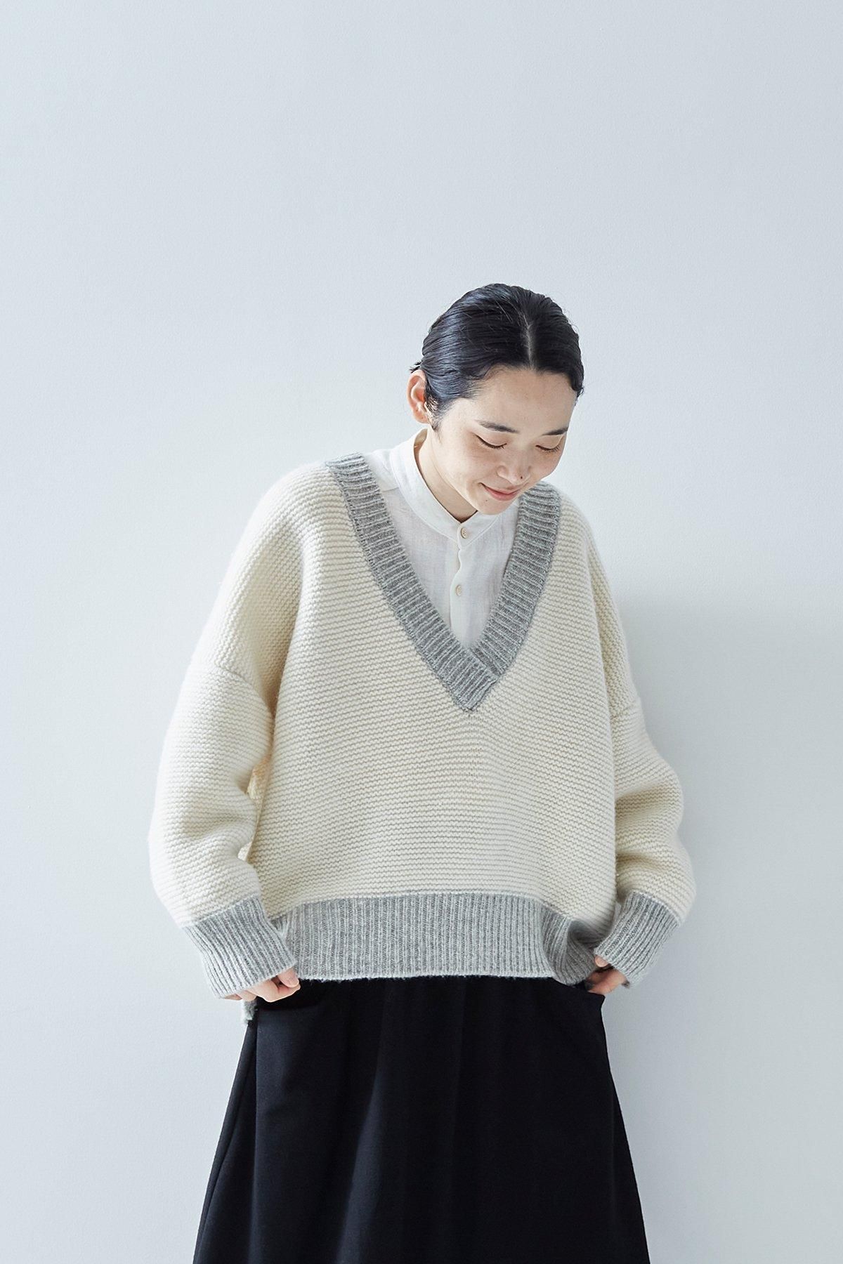 ・ローゲージのガーター編みにすることで、ふんわりとした糸の特徴を活かしたバルキーで手編み感のある編地に仕上げています