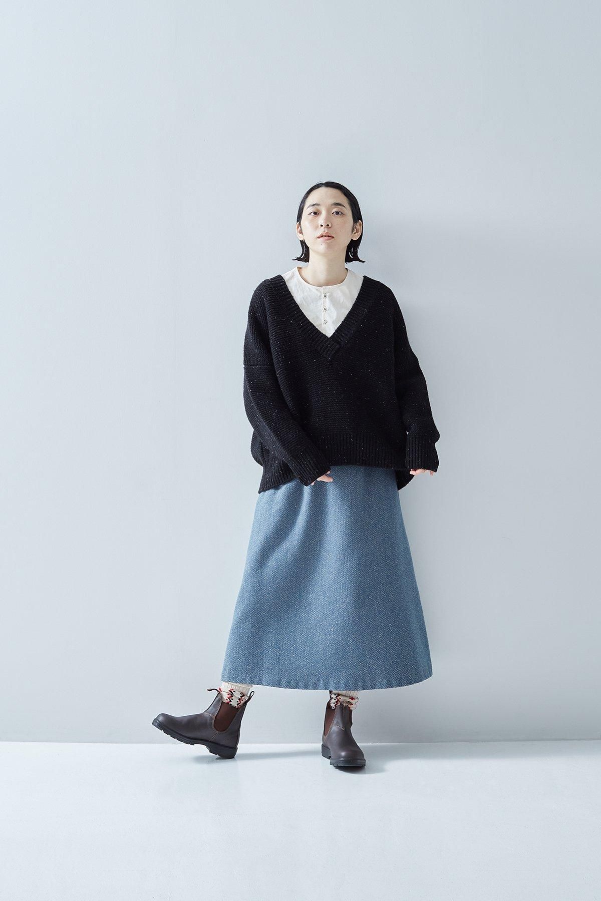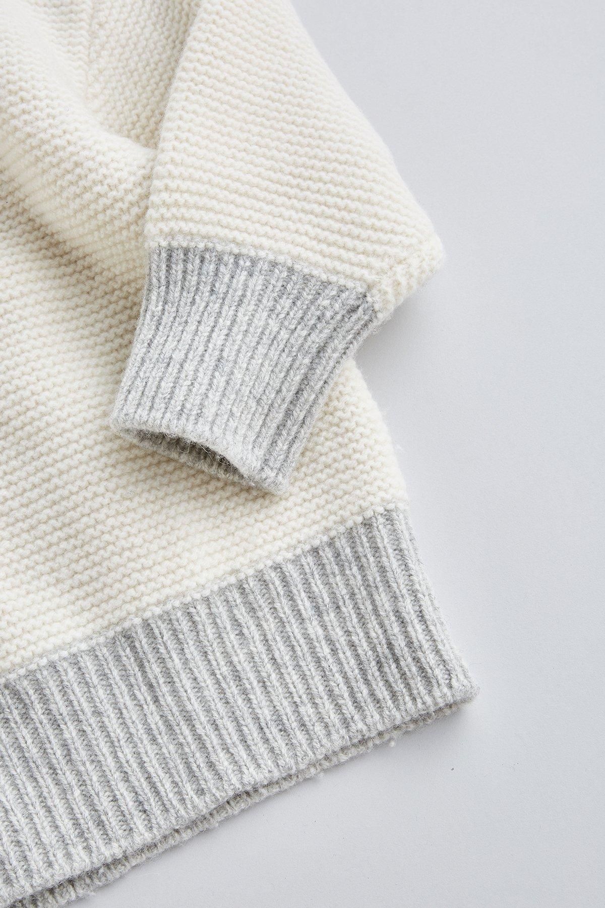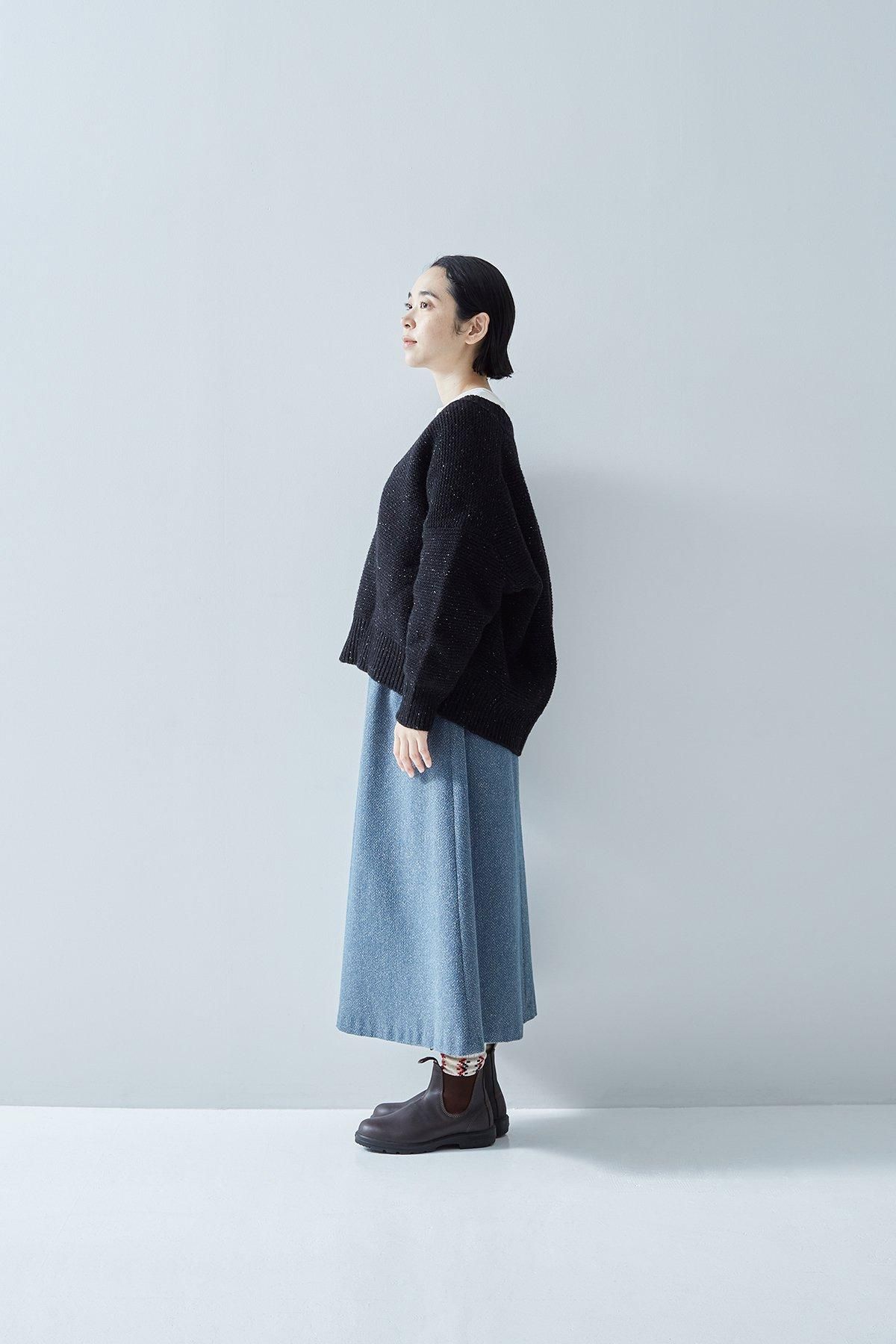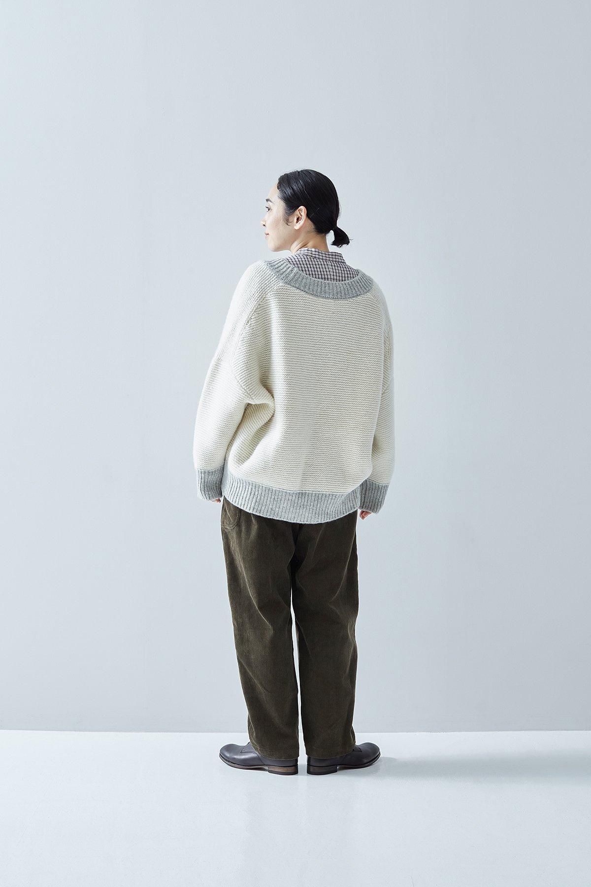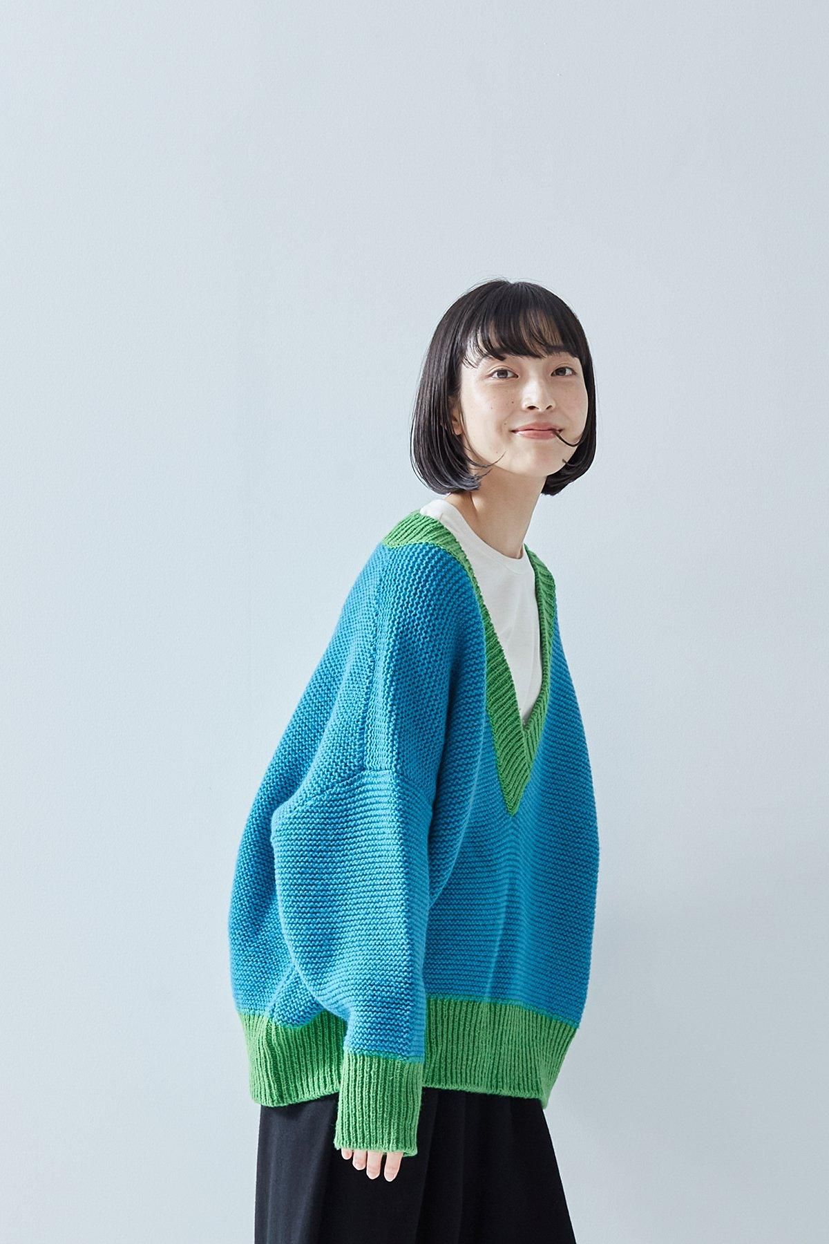 ・ローゲージのガーター編みにすることで、ふんわりとした糸の特徴を活かしたバルキーで手編み感のある編地に仕上げています