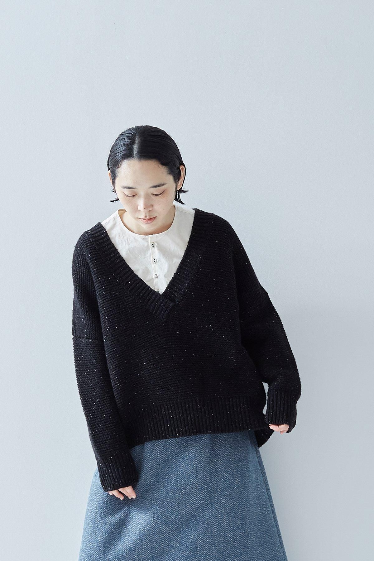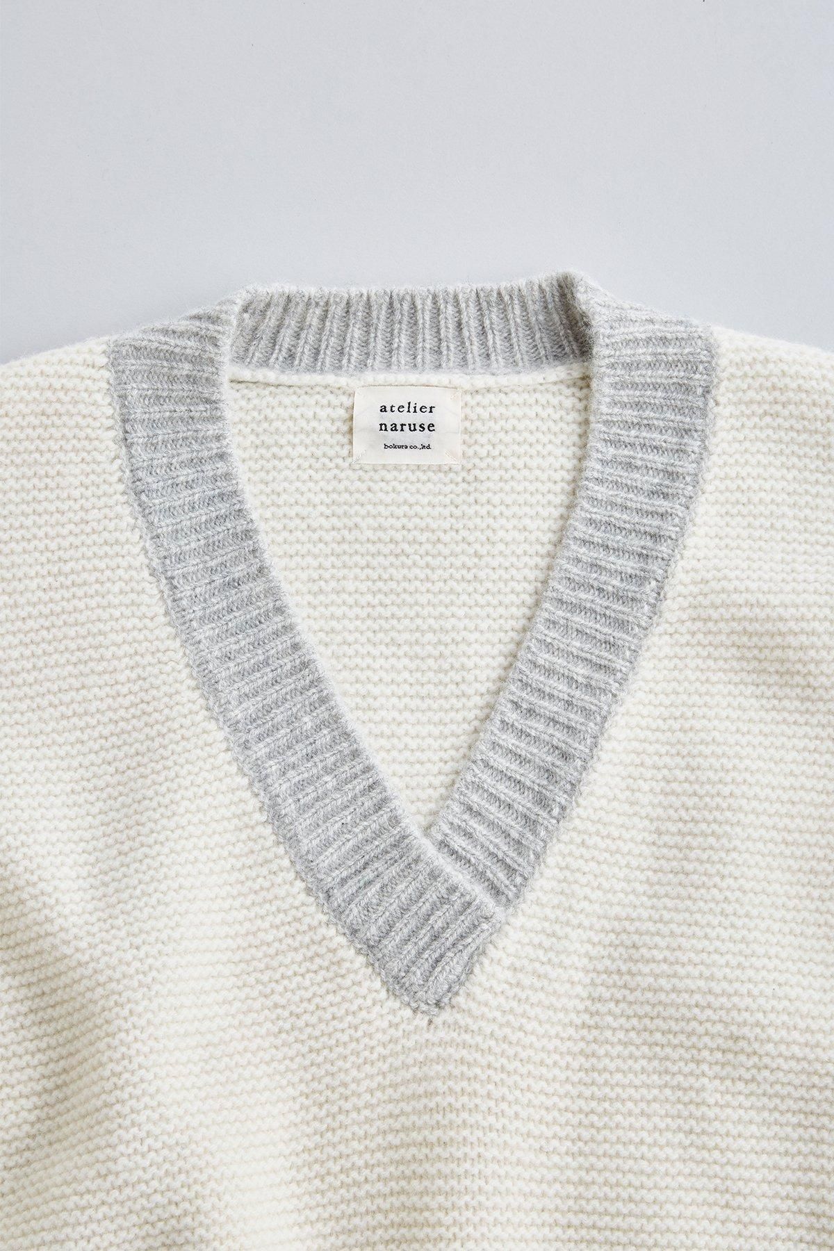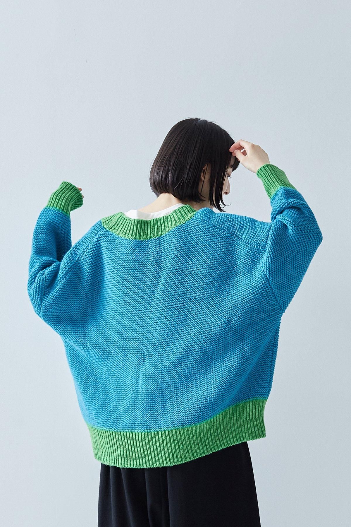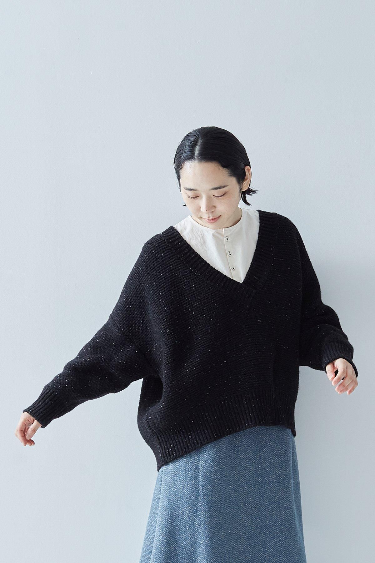 ・ローゲージのガーター編みにすることで、ふんわりとした糸の特徴を活かしたバルキーで手編み感のある編地に仕上げています