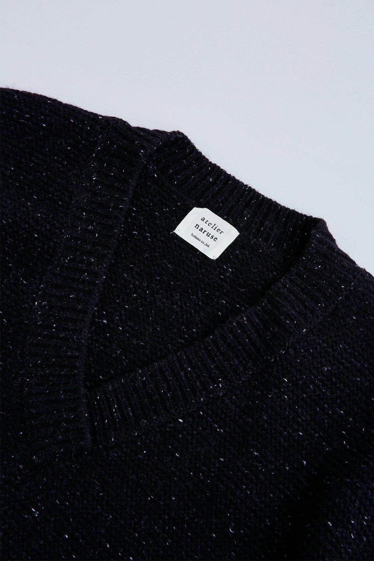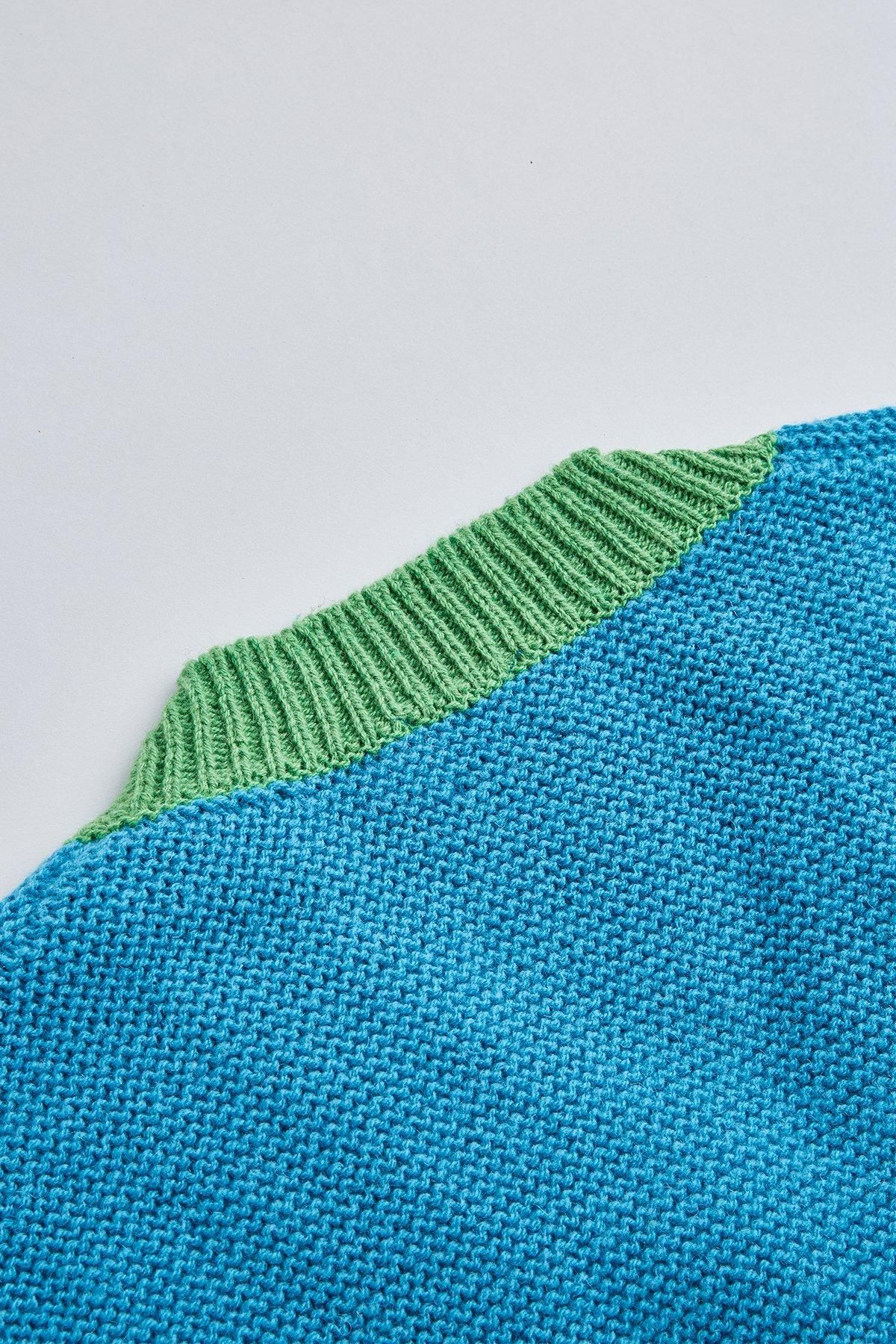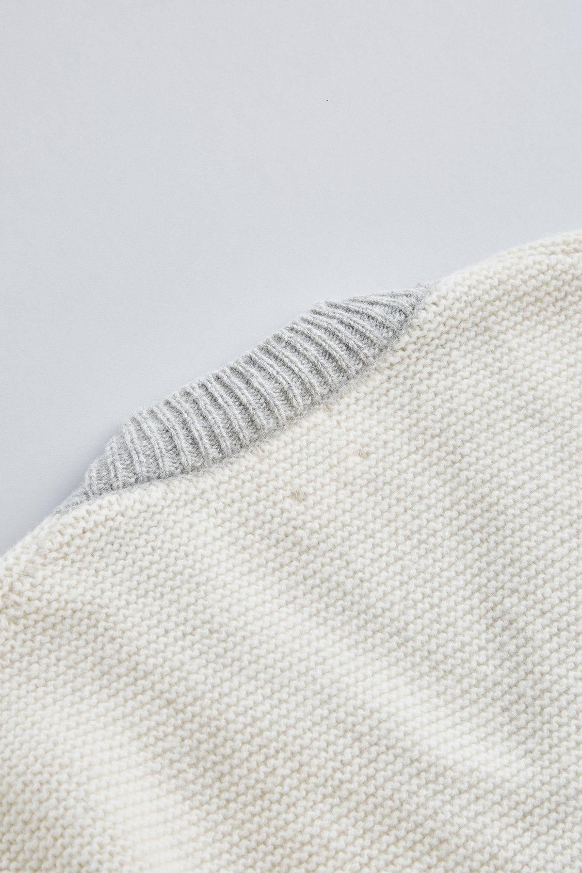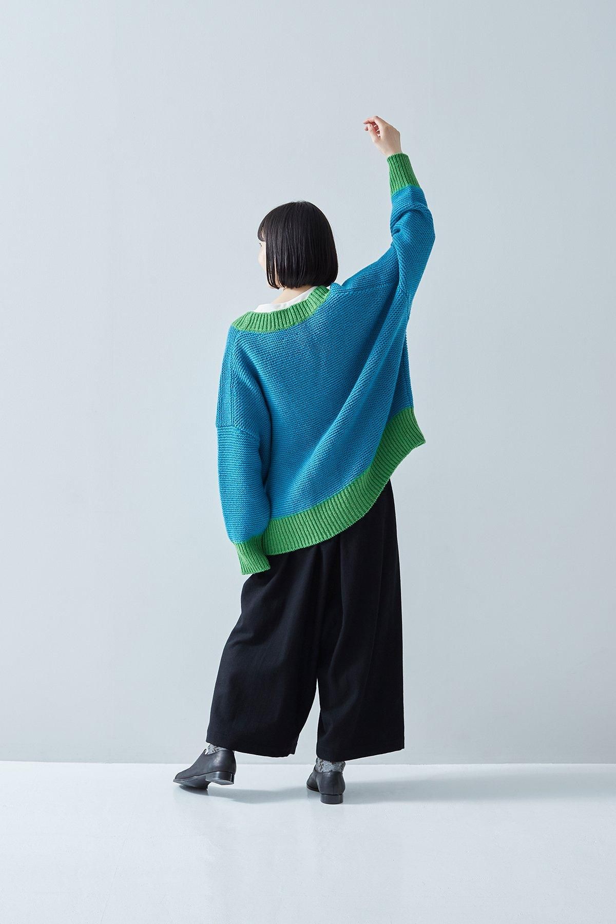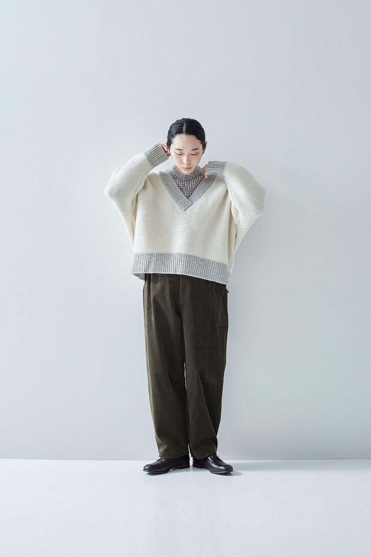 ・ローゲージのガーター編みにすることで、ふんわりとした糸の特徴を活かしたバルキーで手編み感のある編地に仕上げています