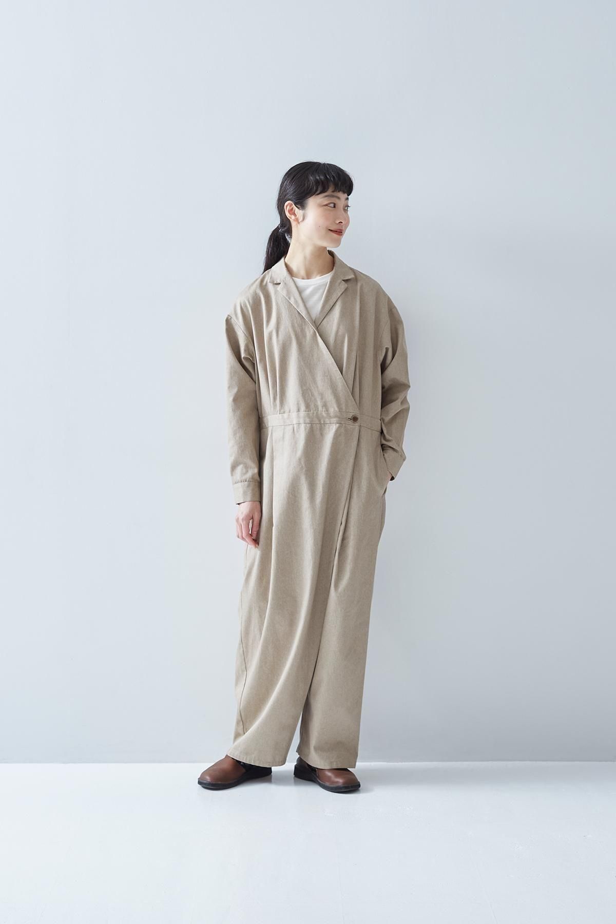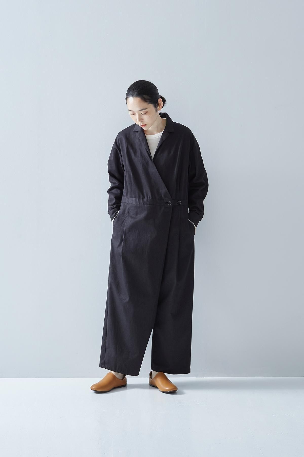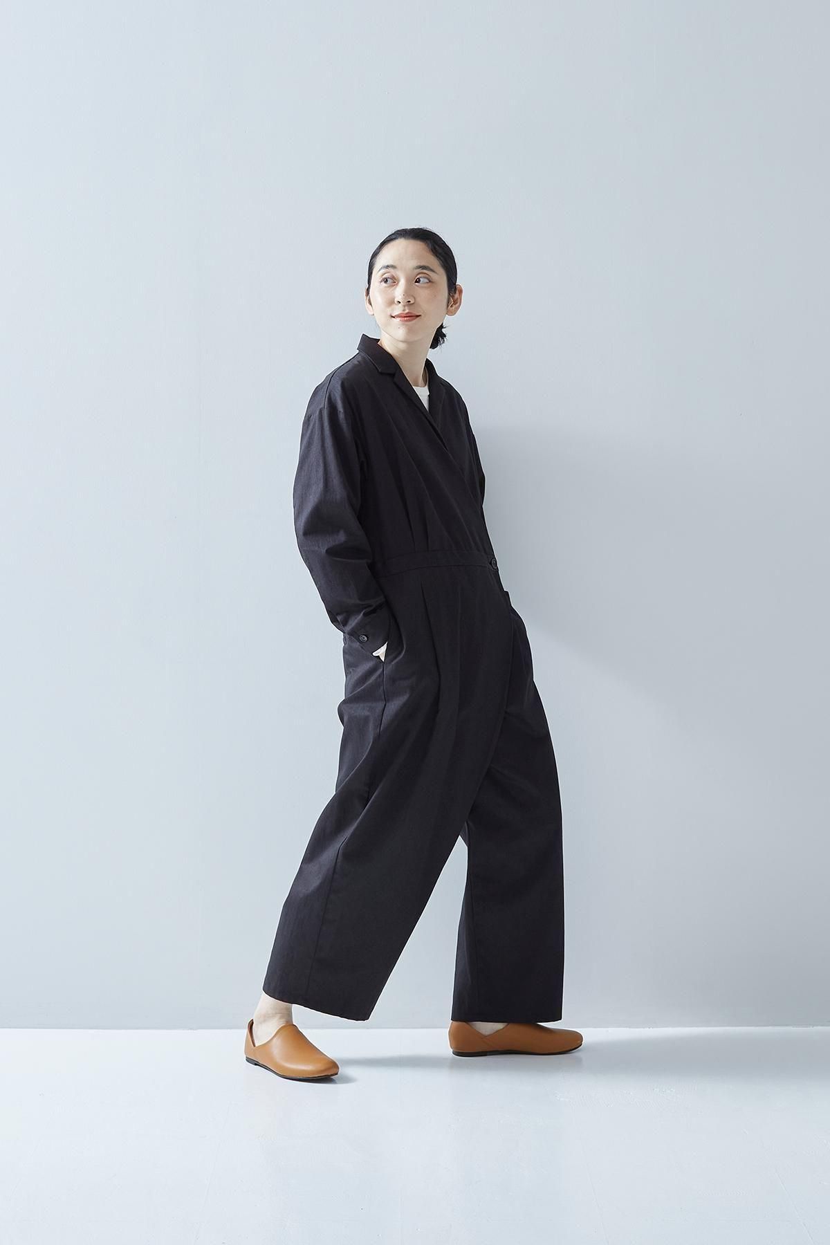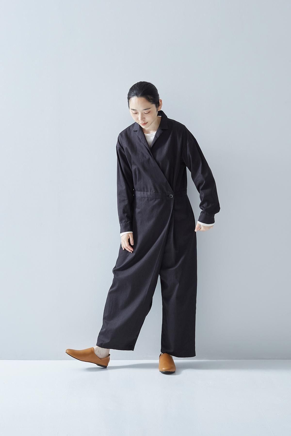 また、カシュクールデザインにより開け閉めするボタンの数を最小限にしジャンプスーツにありがちな着脱の手間を軽減しています。