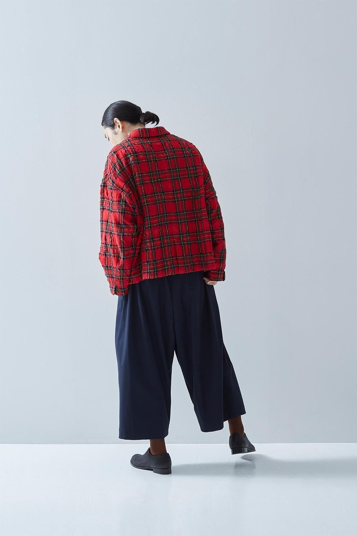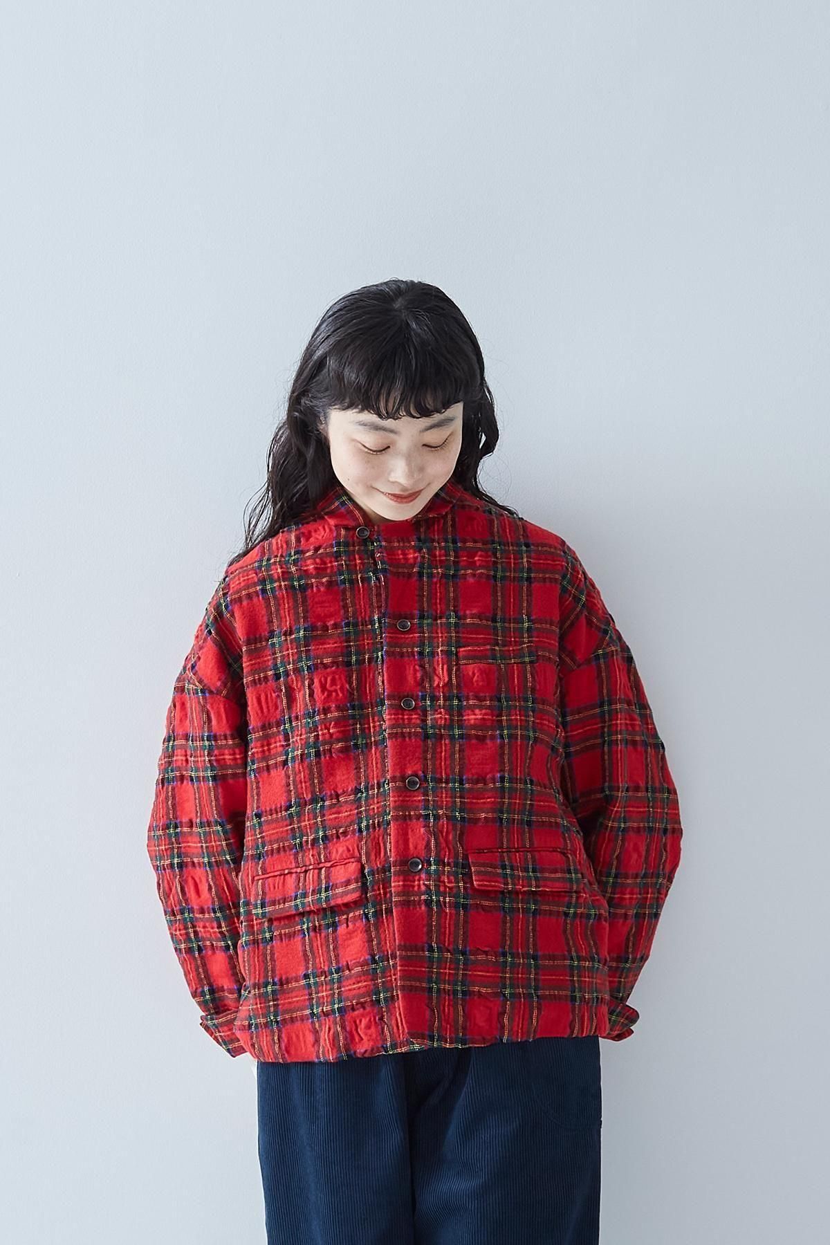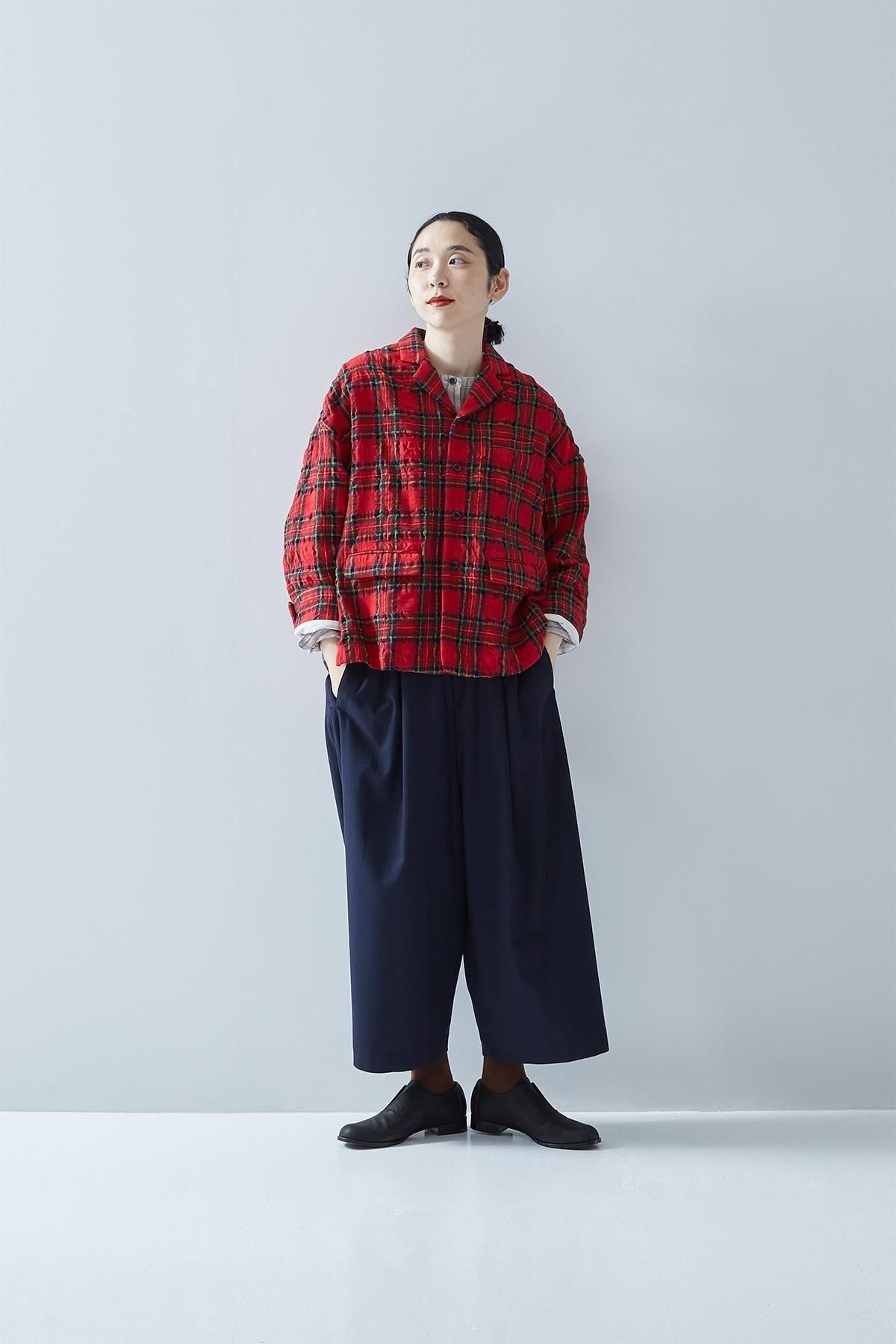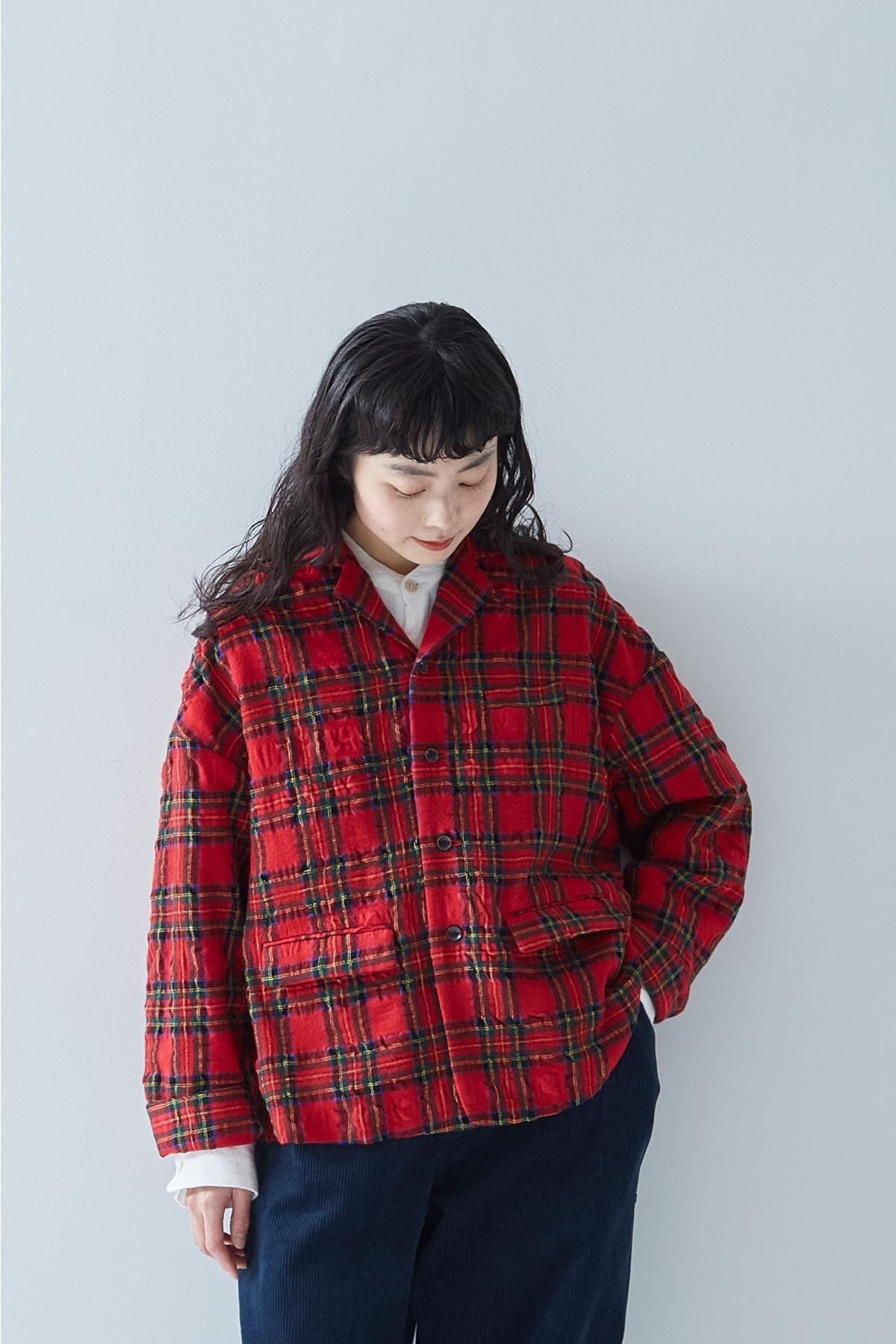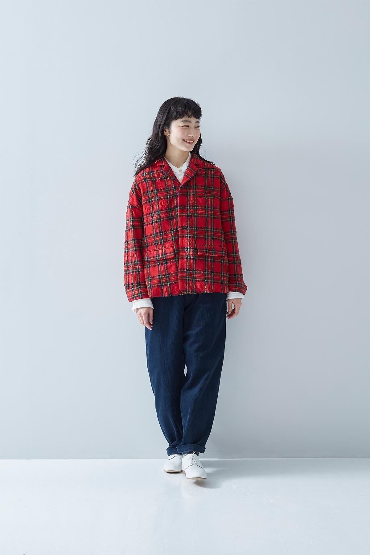 ・使用している生地は、ウールコットンツイルのタータンチェック地。ウールとコットンのハーフブレンド素材を使用し、収縮差を活かしたポコポコとした立体的な風合いと豊かな表情が魅力です。