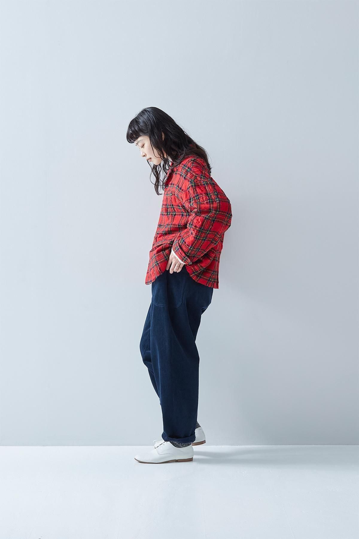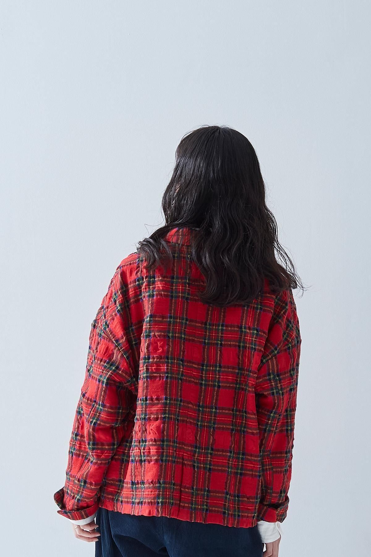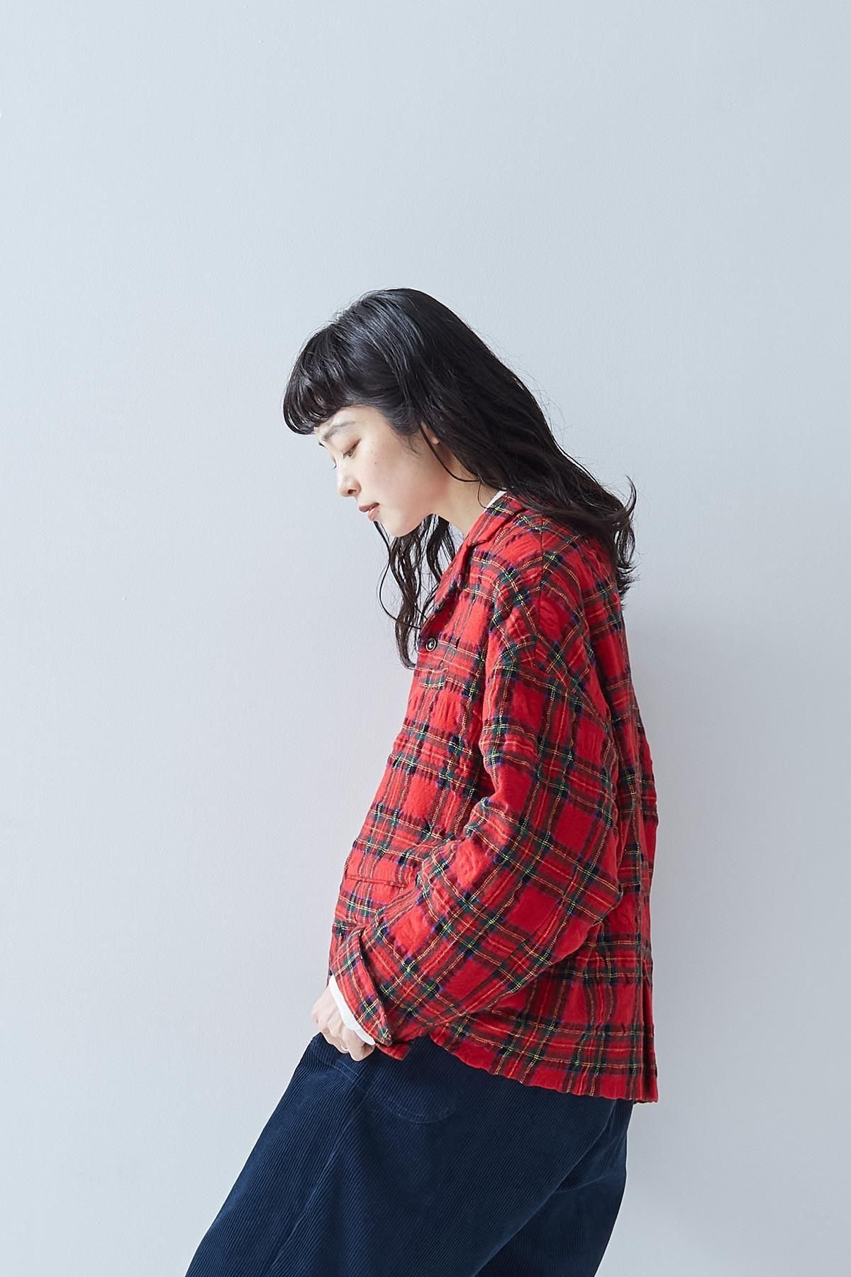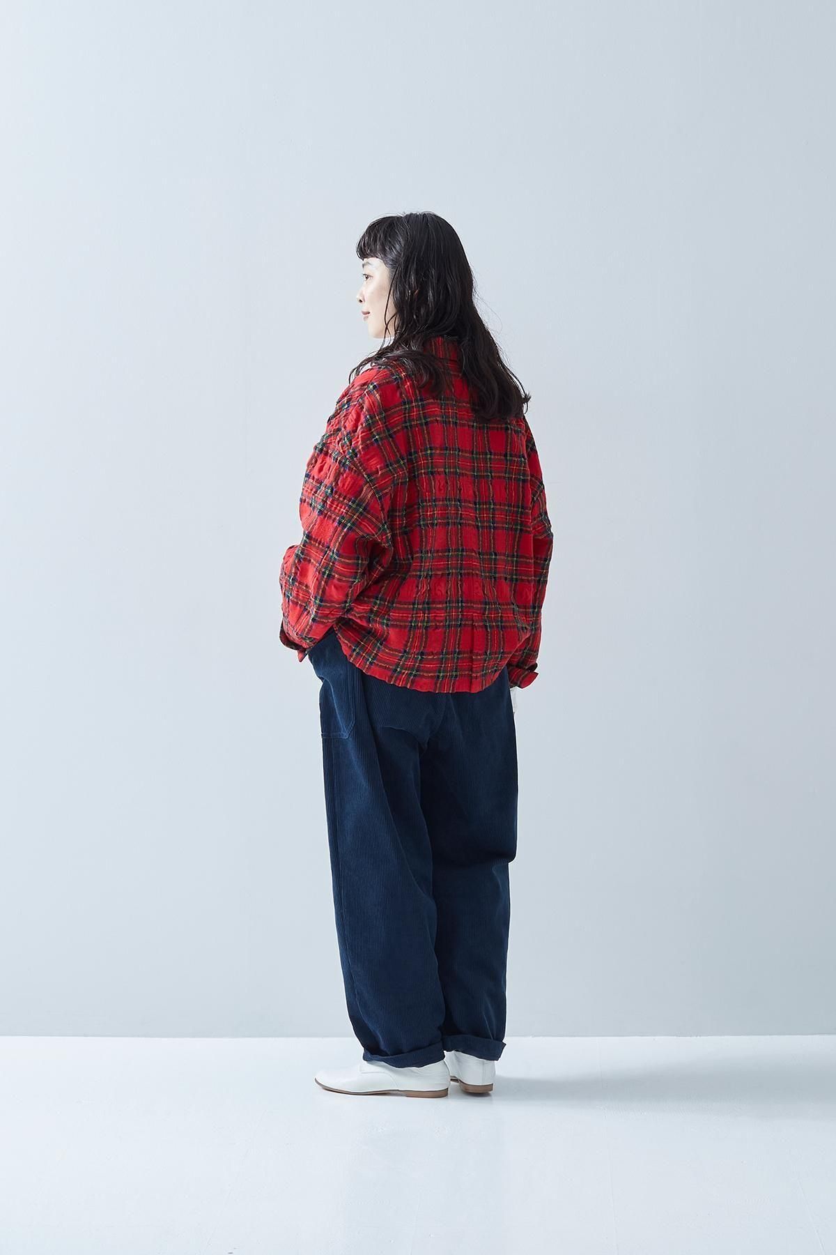 ・使用している生地は、ウールコットンツイルのタータンチェック地。ウールとコットンのハーフブレンド素材を使用し、収縮差を活かしたポコポコとした立体的な風合いと豊かな表情が魅力です。