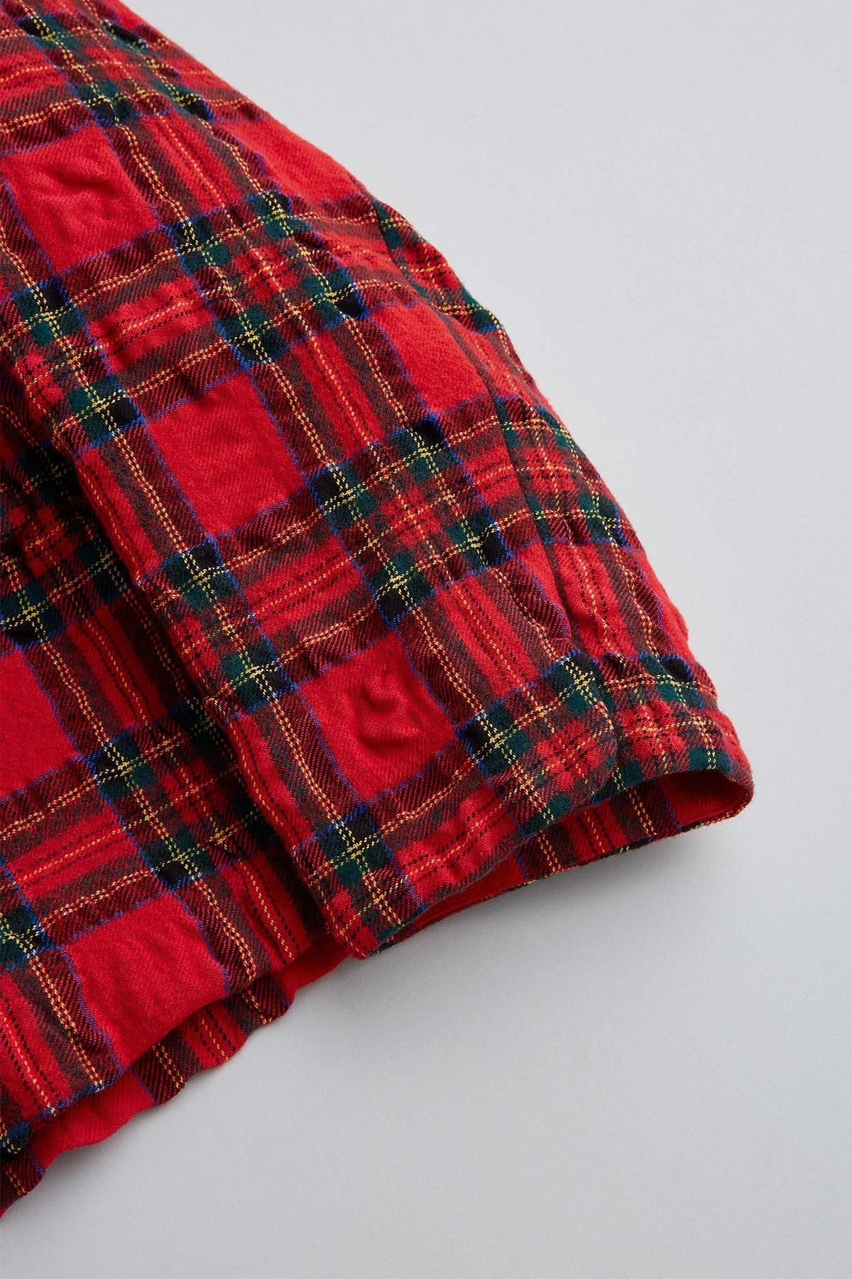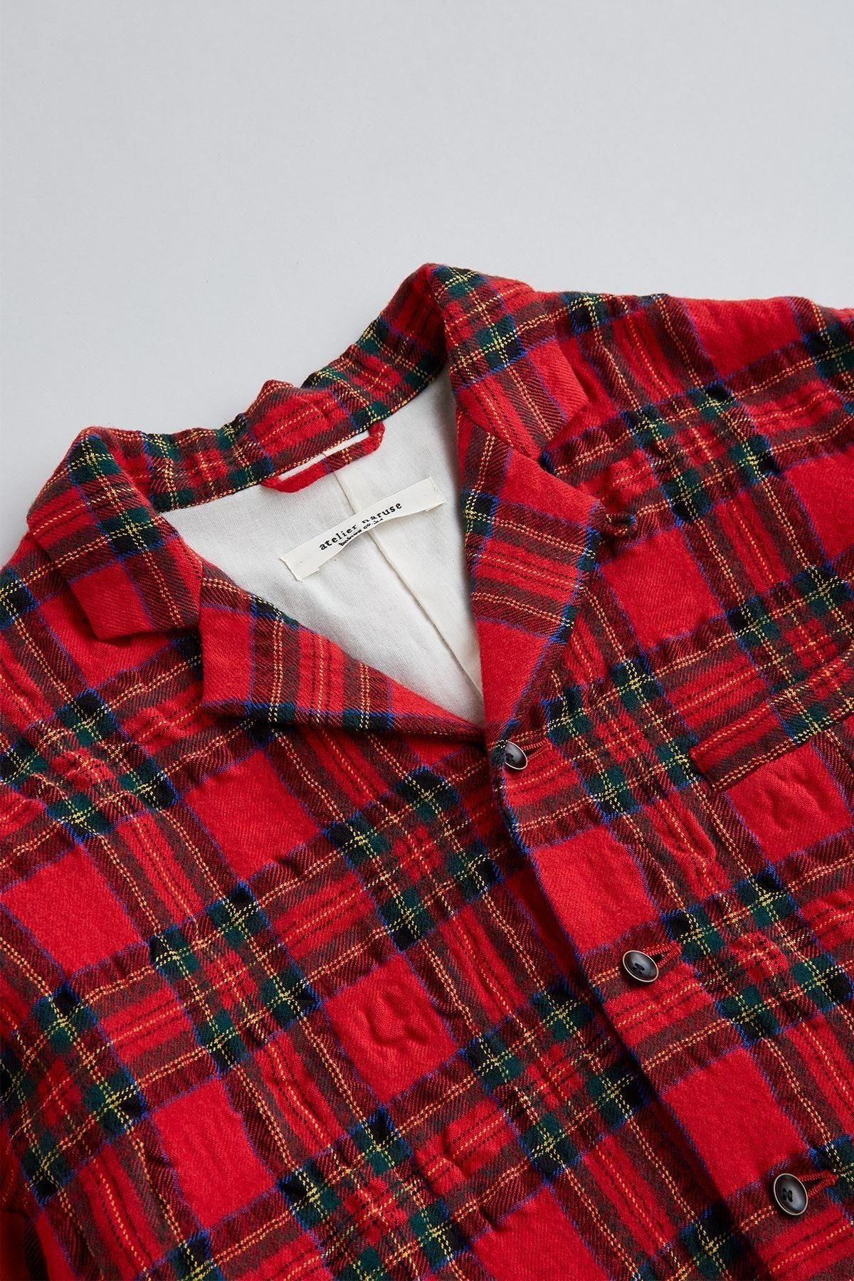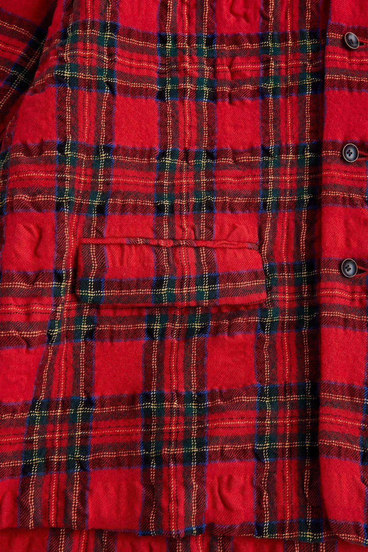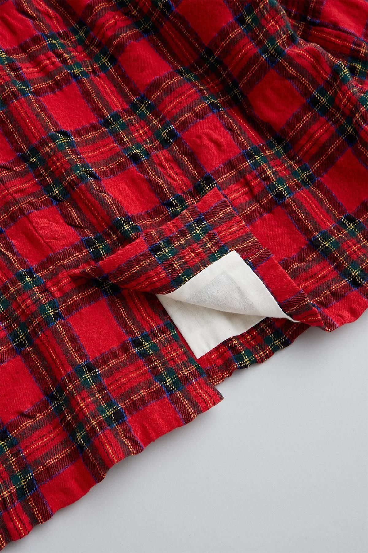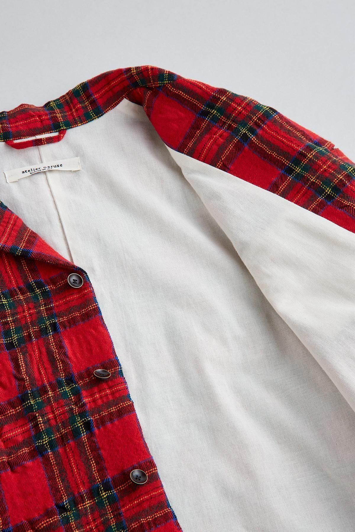 ・使用している生地は、ウールコットンツイルのタータンチェック地。ウールとコットンのハーフブレンド素材を使用し、収縮差を活かしたポコポコとした立体的な風合いと豊かな表情が魅力です。