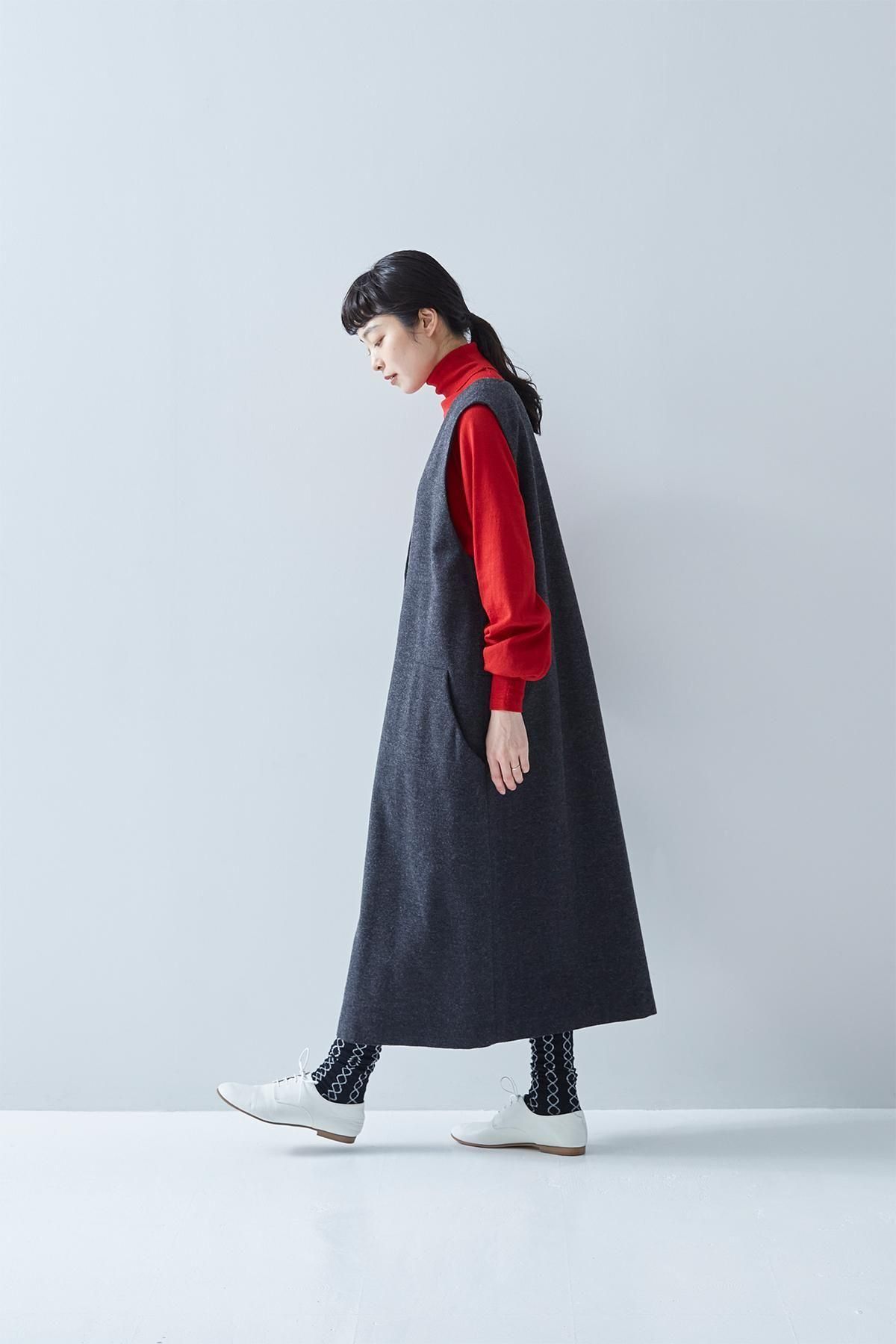 毎シーズン好評をいただいている定番のジャンパースカート。2025 a/wコレクションでも、生地やデザインを変更することなく、そのままの形でリピートします。