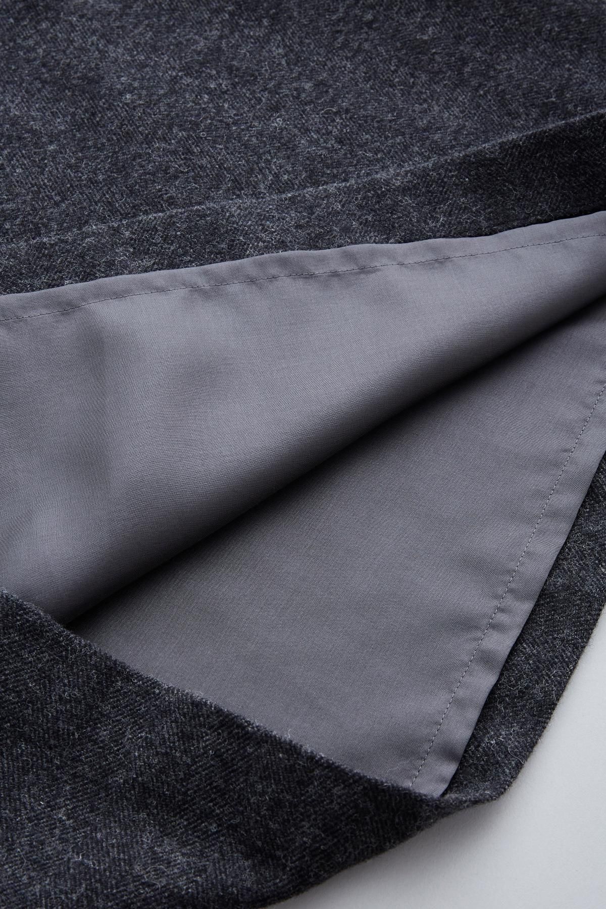 ・使用している生地は、「毛七(ケシチ)」という尾州産の再生羊毛を使用した先染め素材。やや厚手でヘリンボーン織りの丈夫さがあり、起毛とワッシャー加工によってふくらみのある風合いが特徴です。