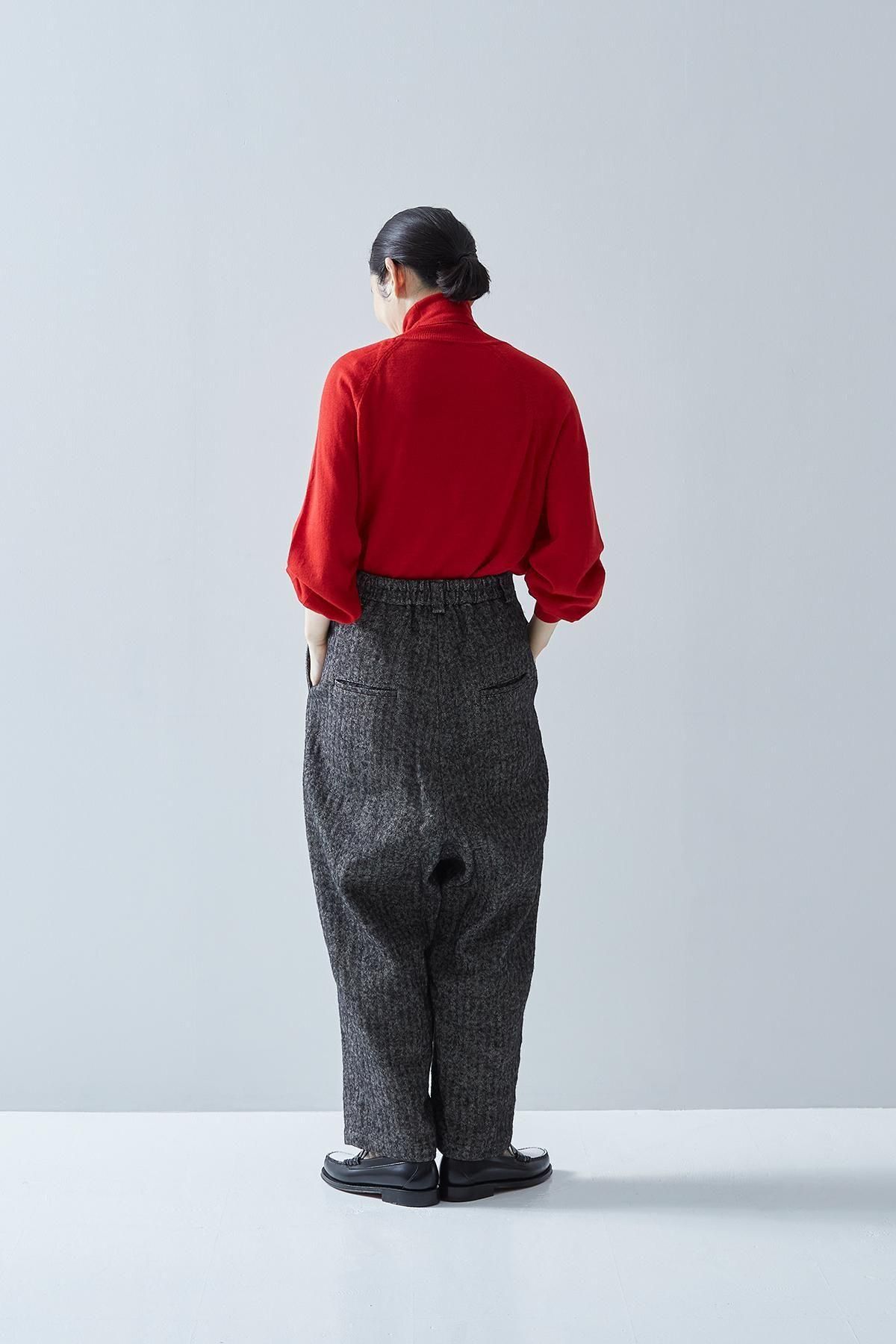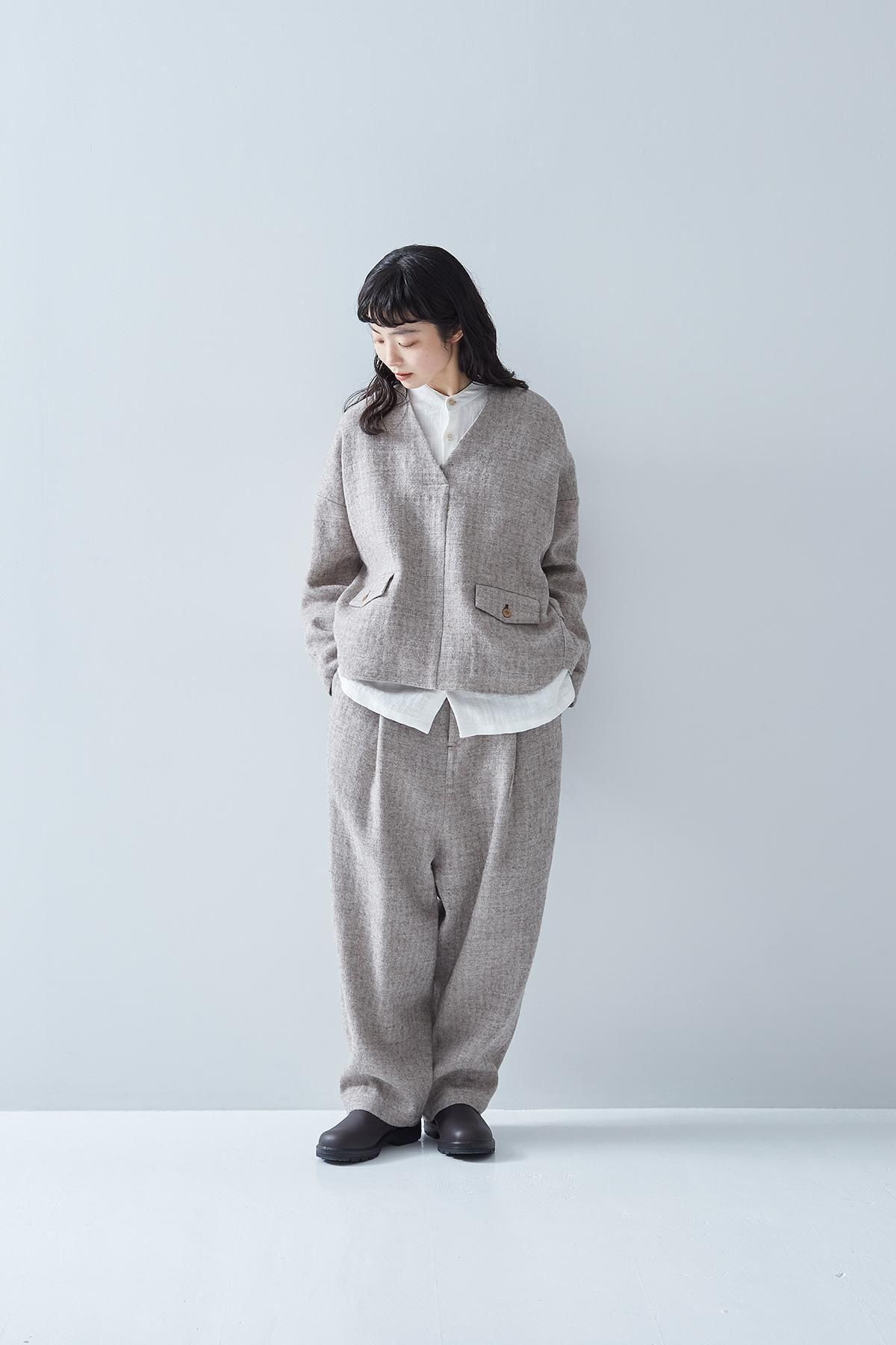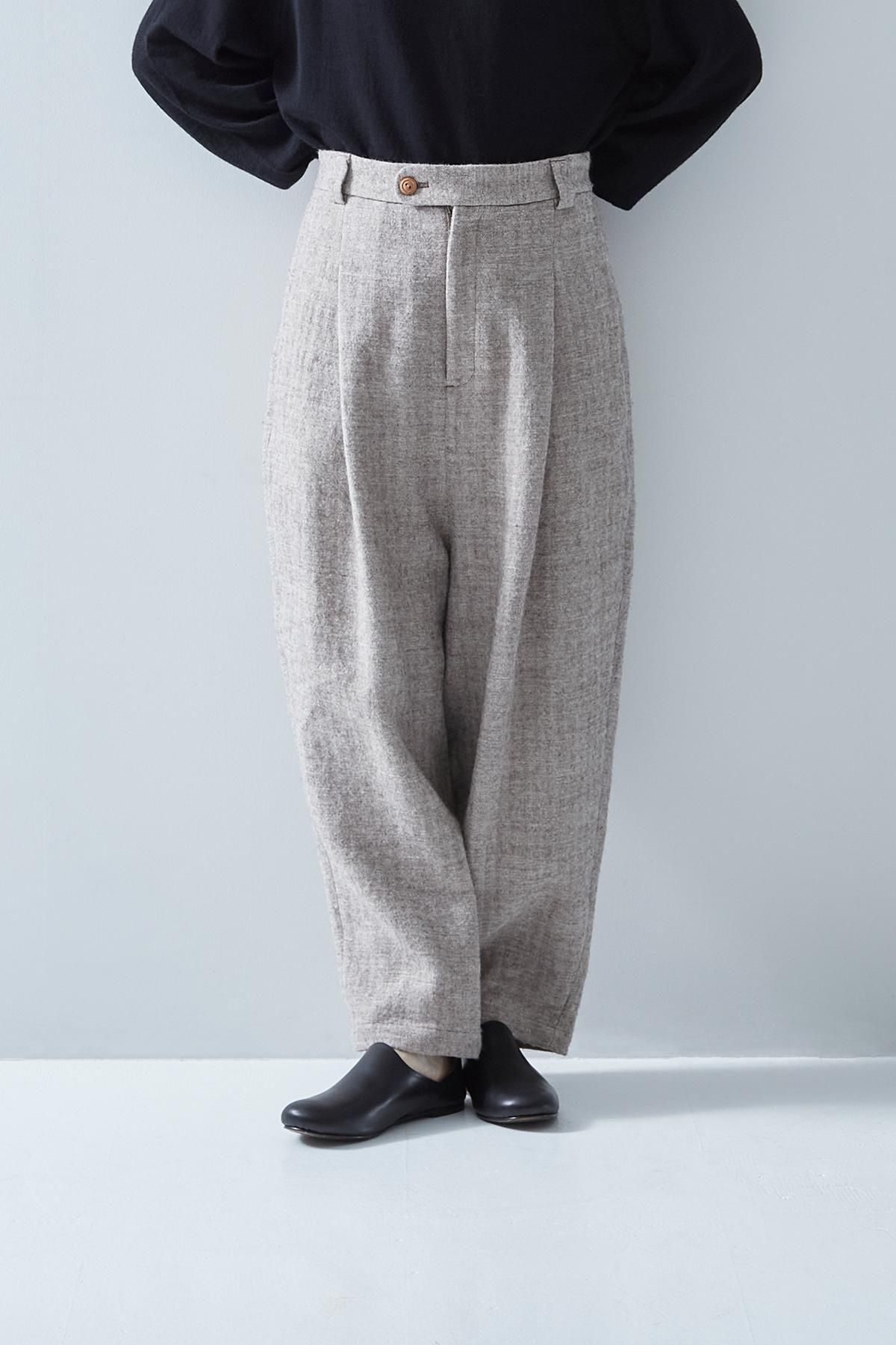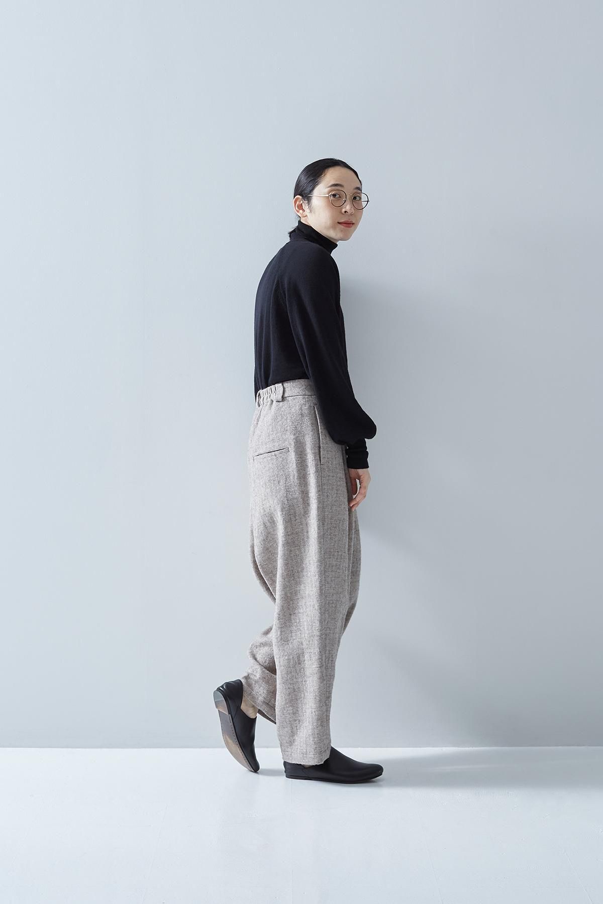 股上が長く、深めのタックが入った、ほどよいサルエル感があるタックワイドパンツを、ざっくりとしたナチュラルなルックスとふくらみのあるシェットランドウールリネンでつくりました。