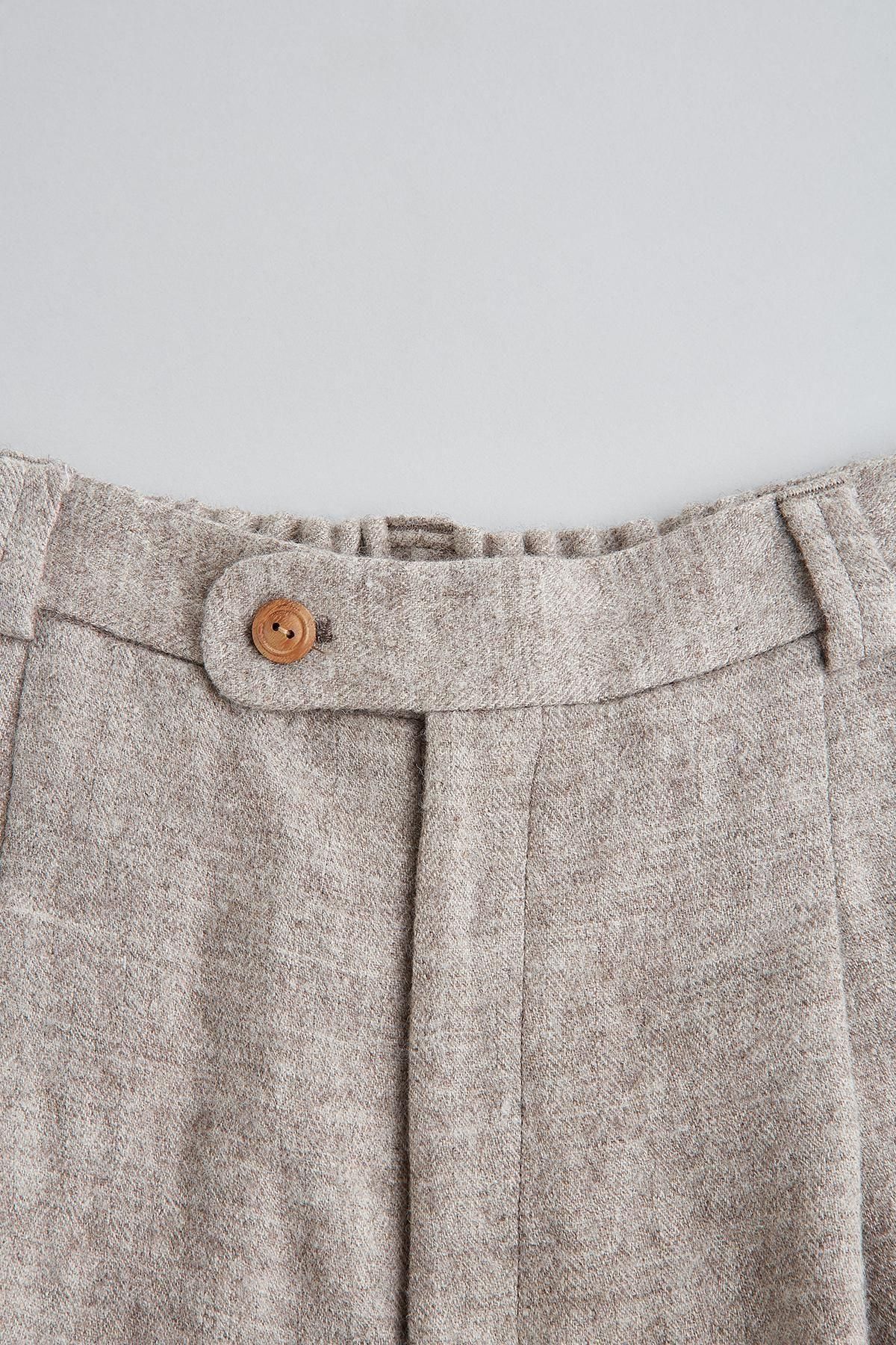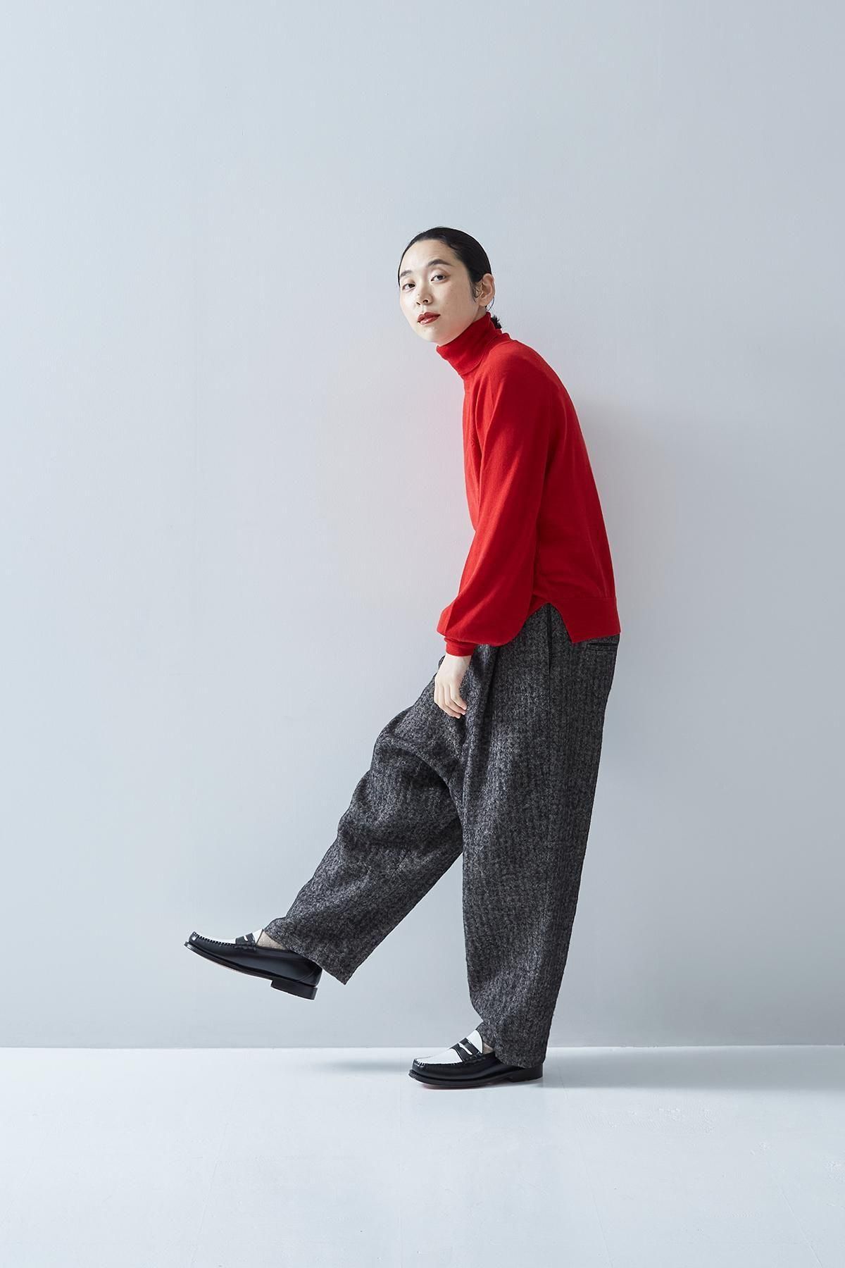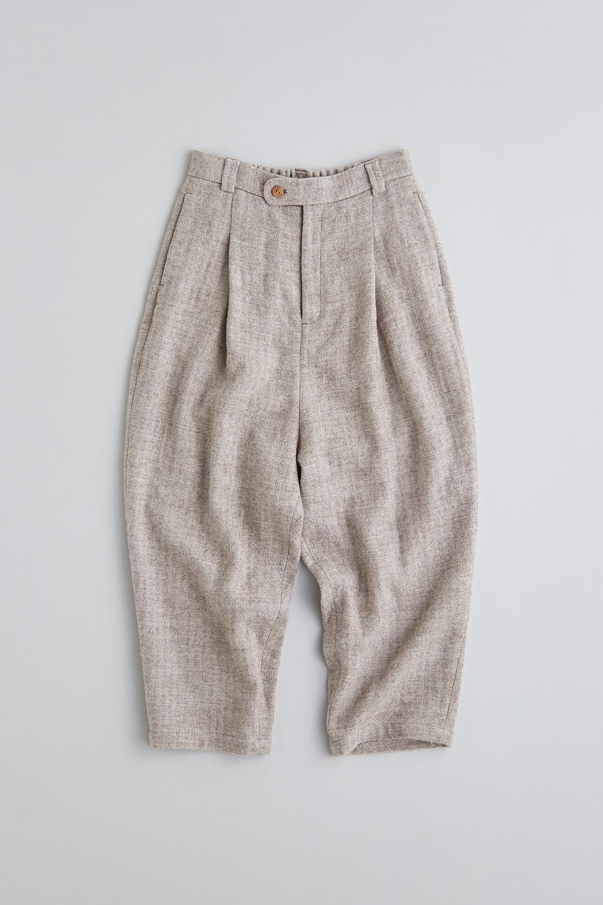股上が長く、深めのタックが入った、ほどよいサルエル感があるタックワイドパンツを、ざっくりとしたナチュラルなルックスとふくらみのあるシェットランドウールリネンでつくりました。