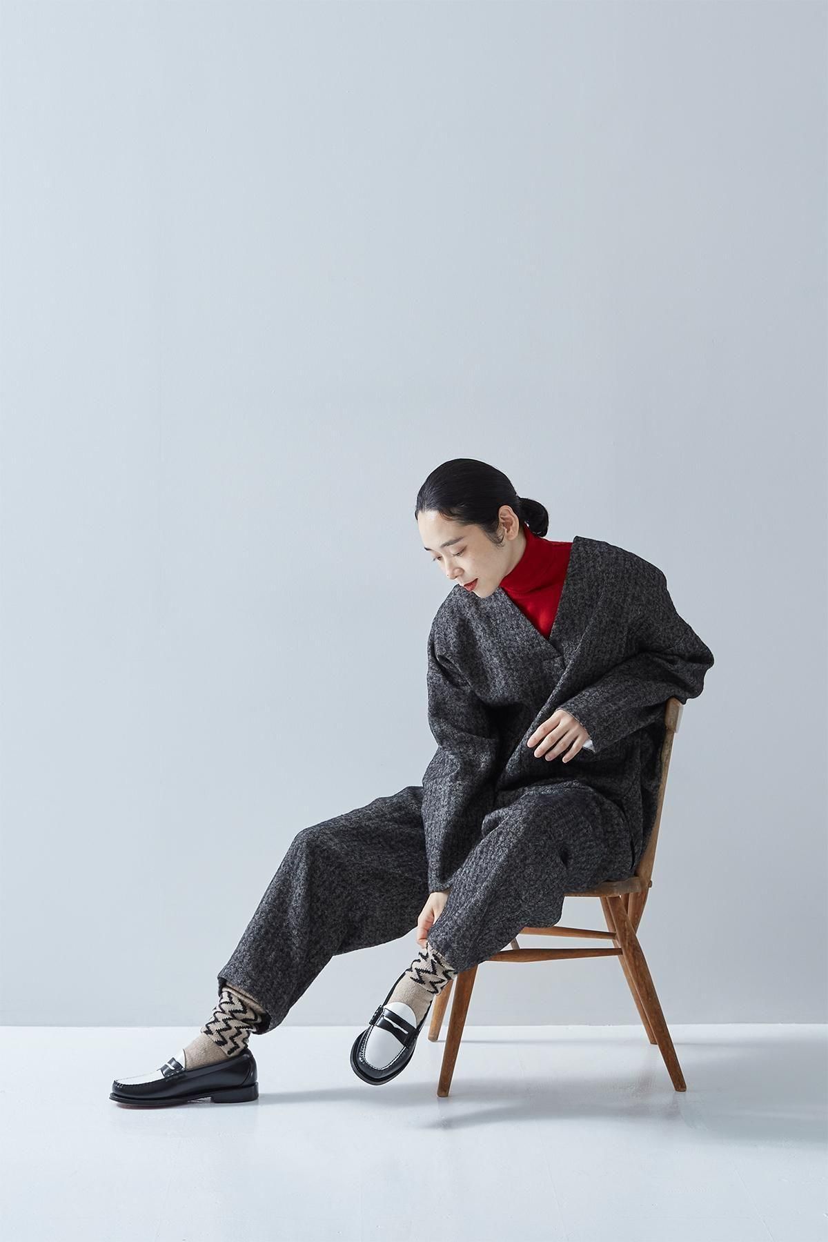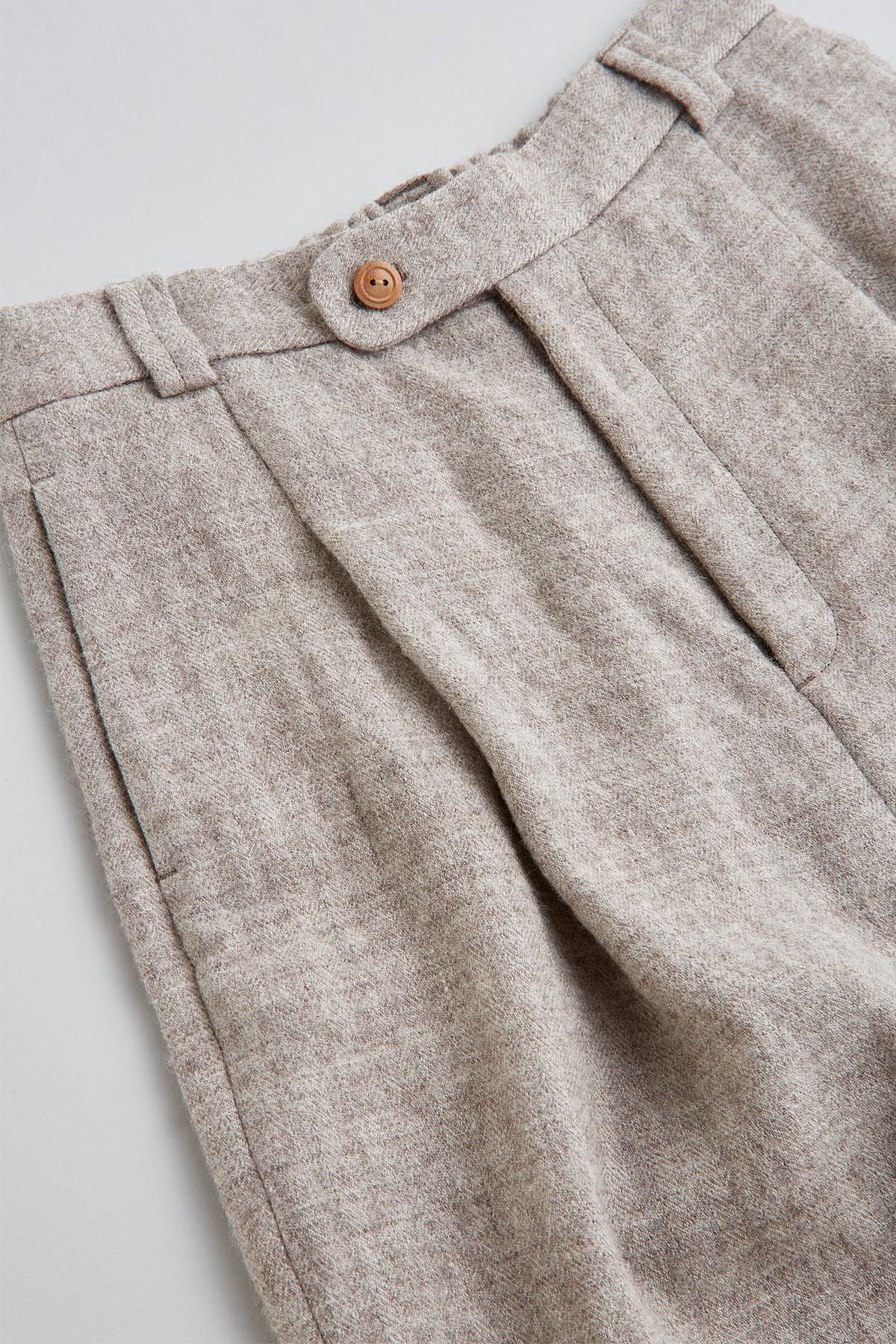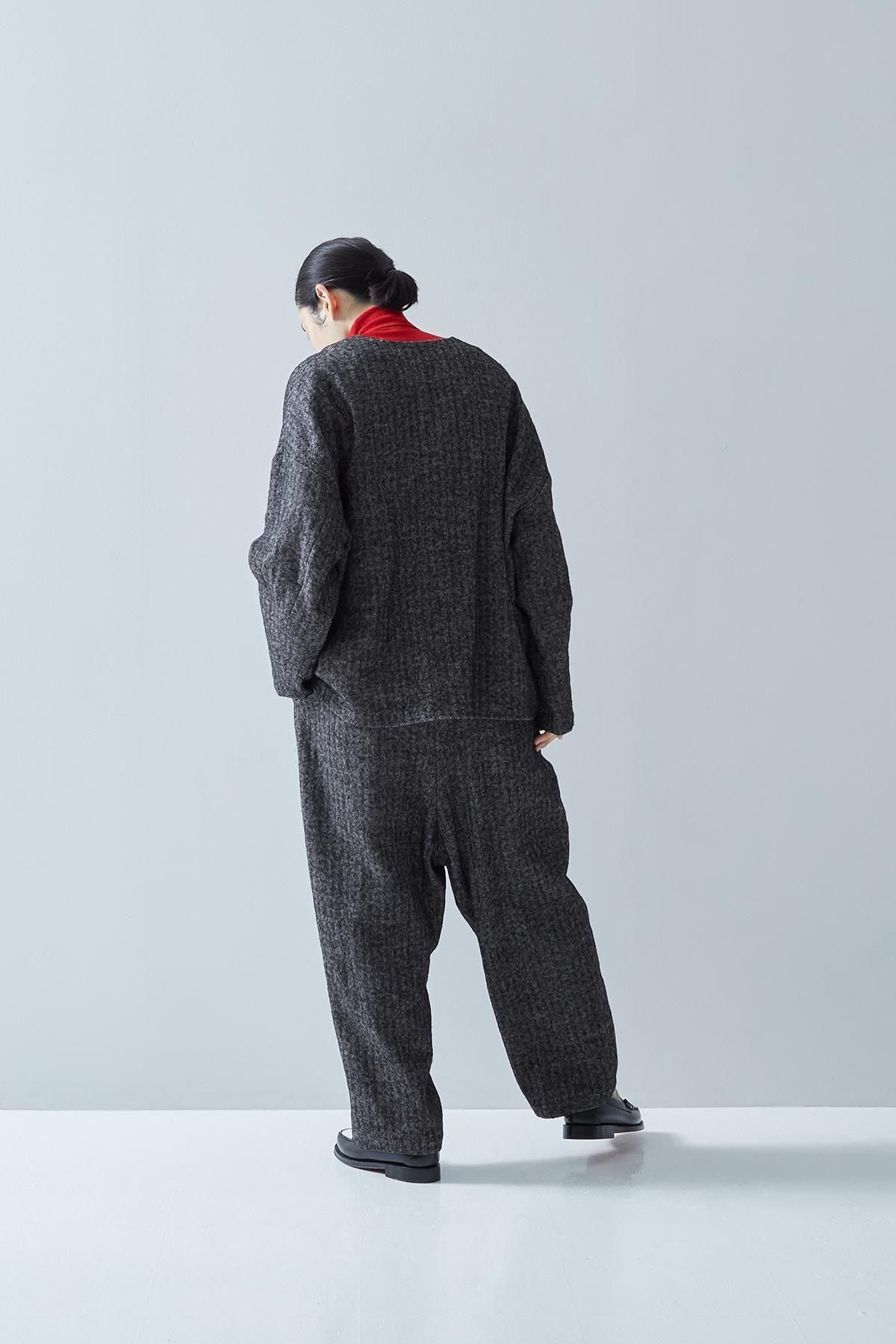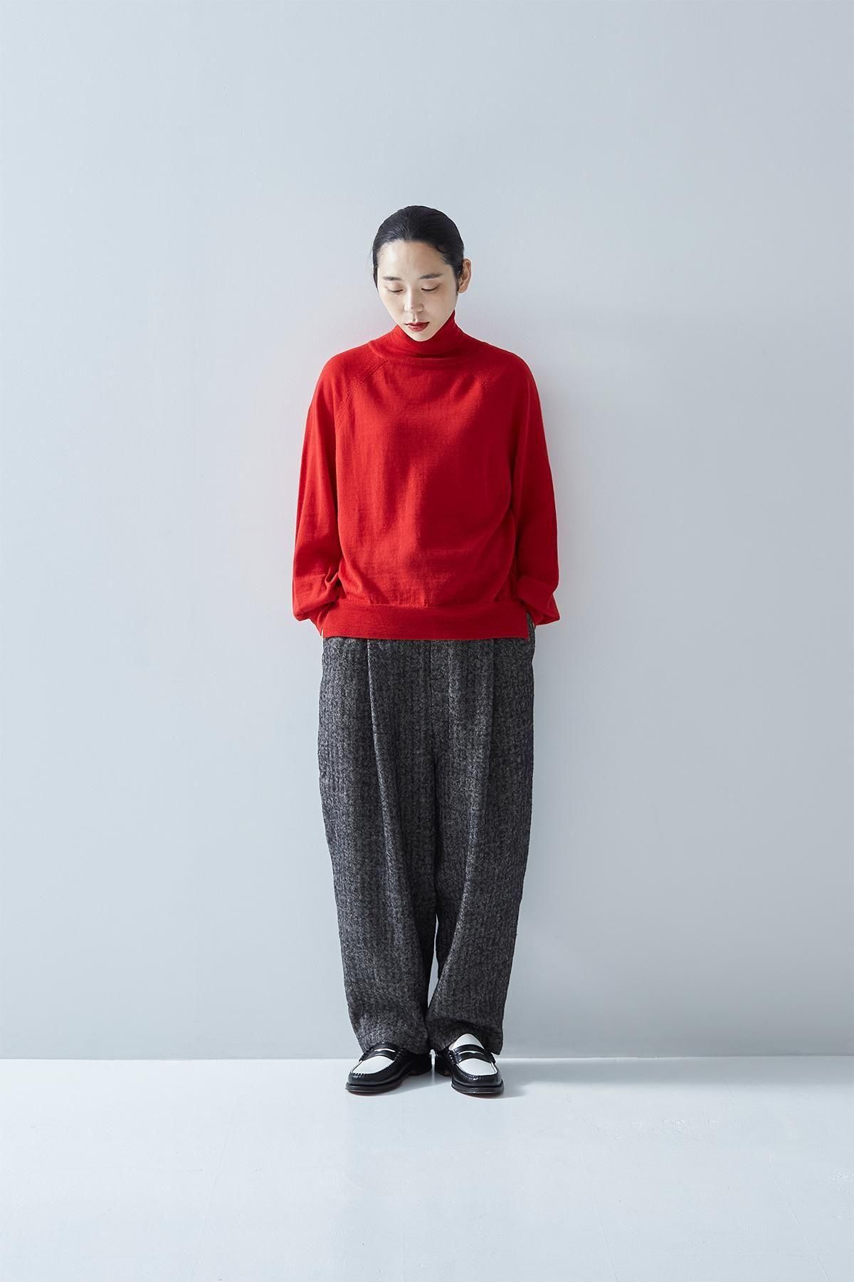 股上が長く、深めのタックが入った、ほどよいサルエル感があるタックワイドパンツを、ざっくりとしたナチュラルなルックスとふくらみのあるシェットランドウールリネンでつくりました。