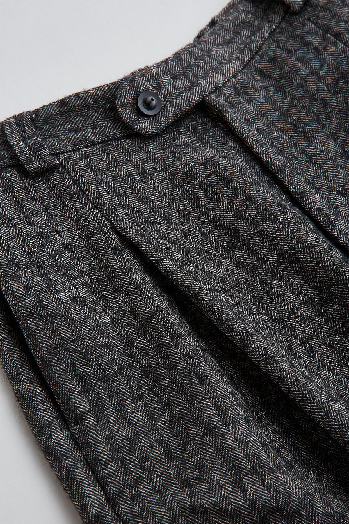 ・使用している生地は、経糸に25番手のノルマンディリネン、緯糸に14番手のシェットランドウールを使用した混紡糸。荒々しさと柔らかさが共存するシェットランドウールリネンのヘリンボーン生地です。