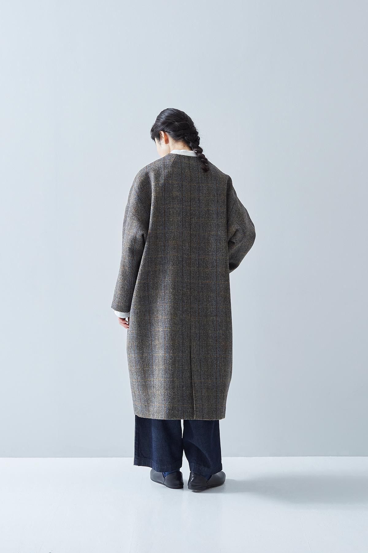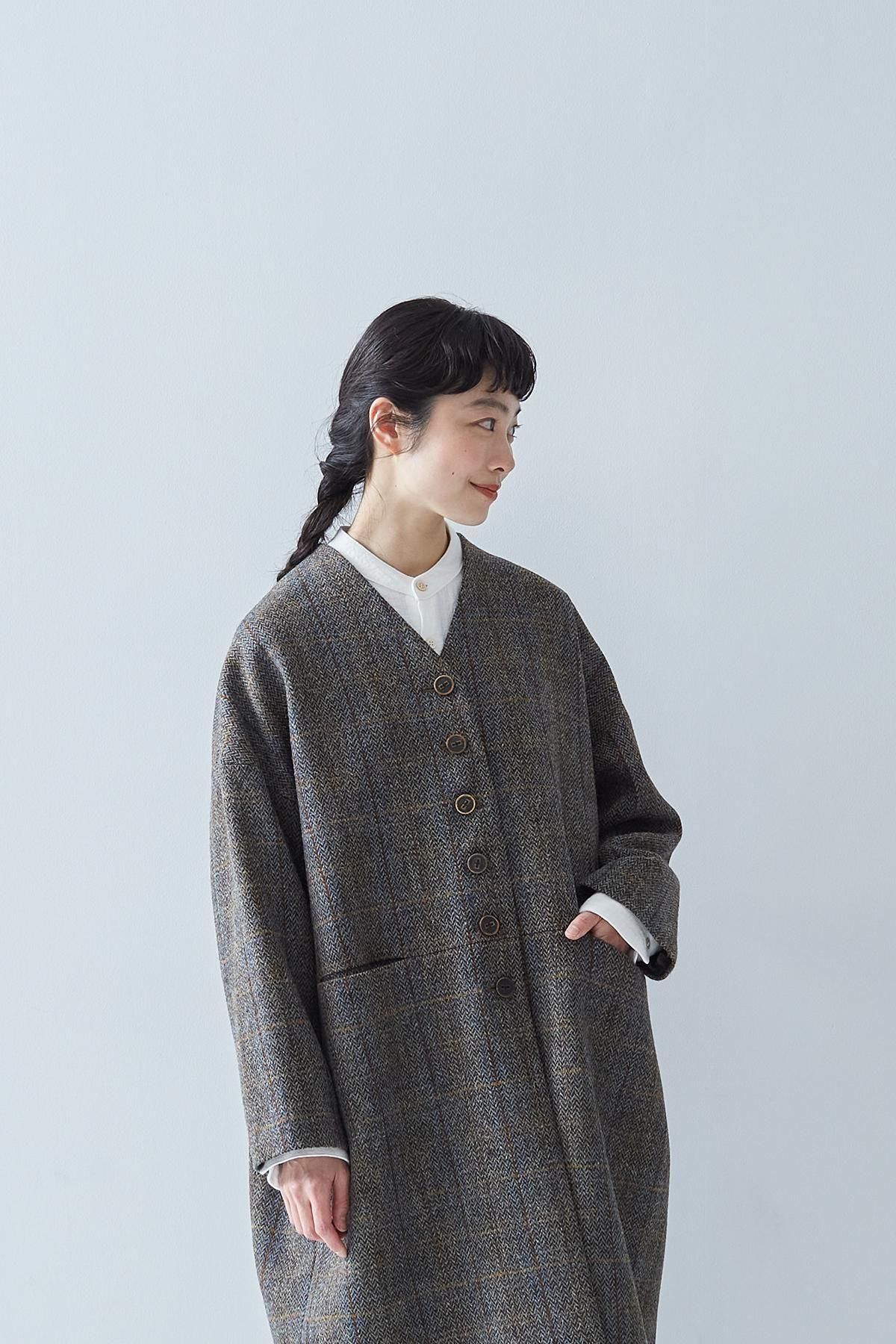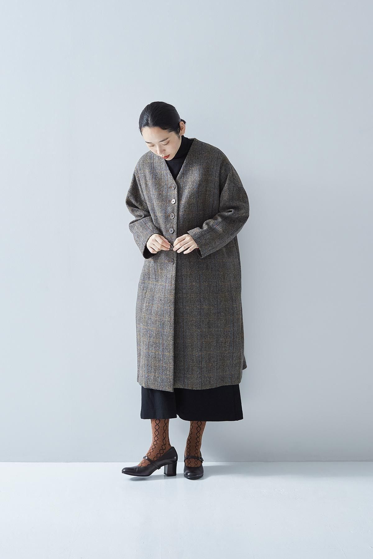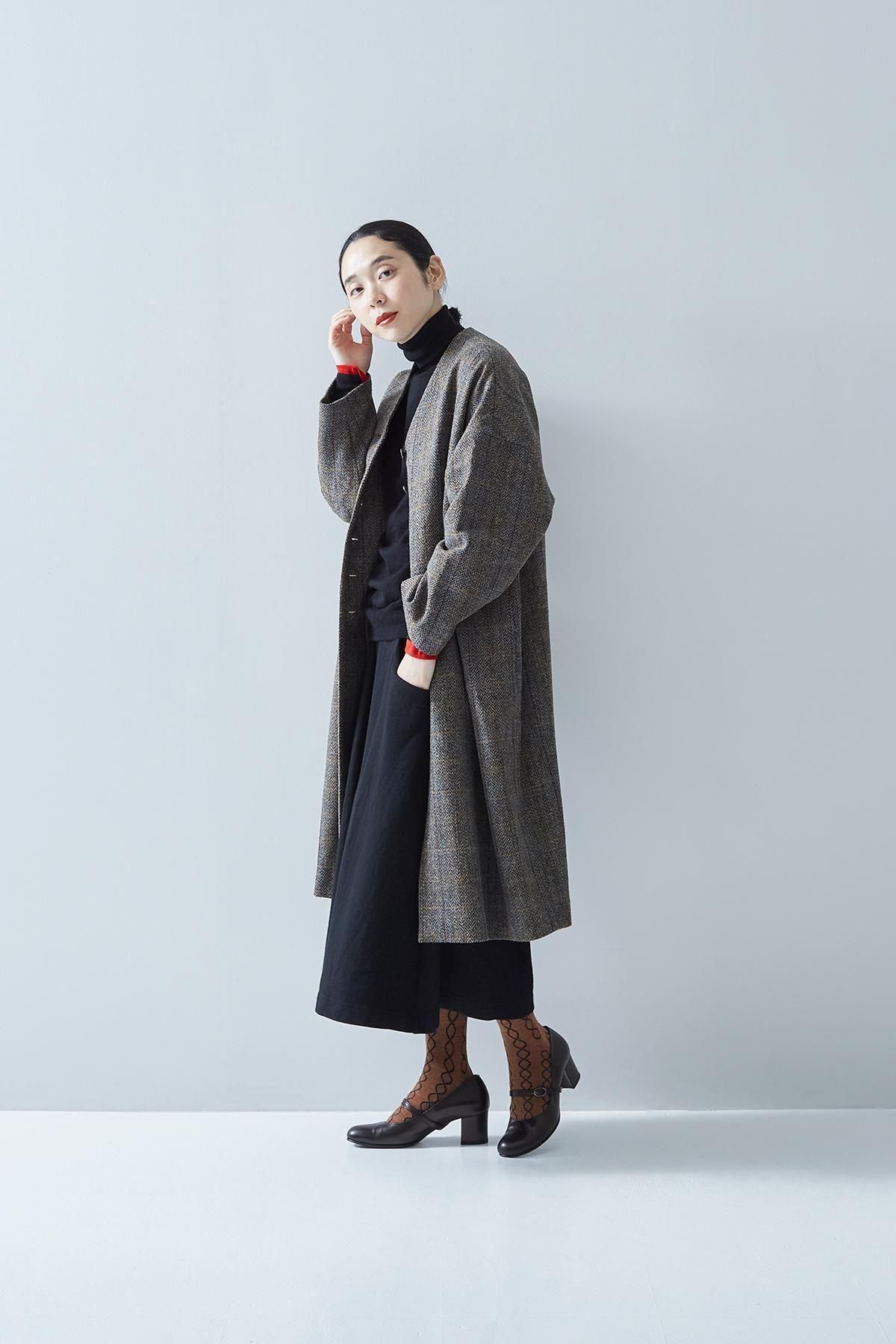 「キング・オブ・ツィード」とも称される手織りのツィード生地『Harris Tweed(ハリスツィード)』(※)。2025 a/wコレクションは、そんな Harris Tweed の中から深みのあるヘリンボーンツィードのチェック地で atelier naruse 定番のコクーン型コートをつくりました。