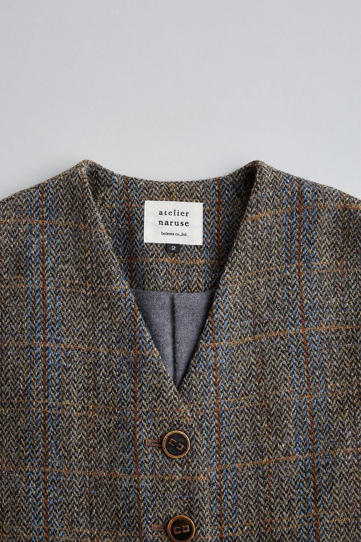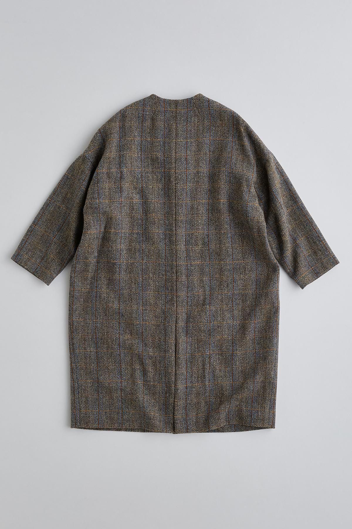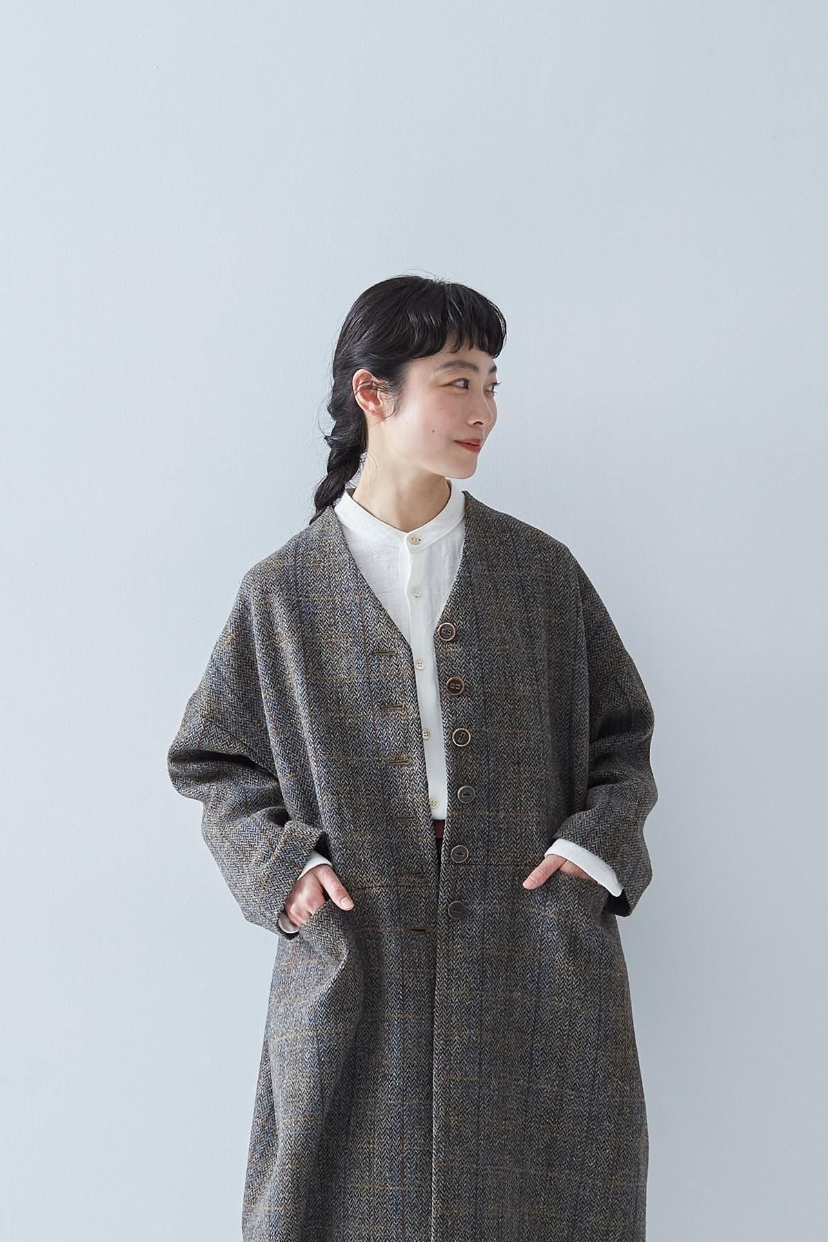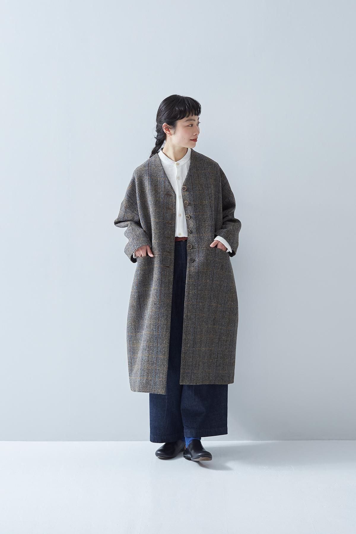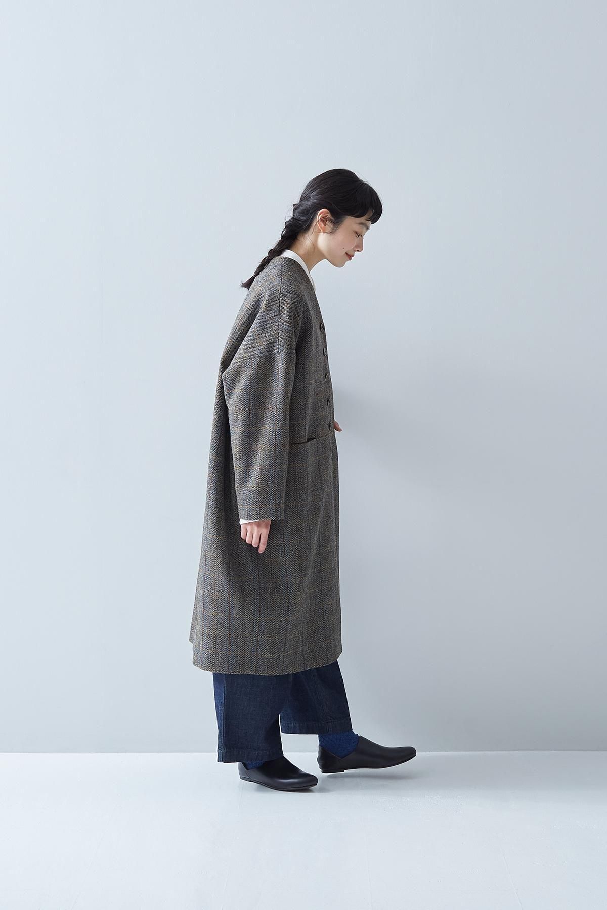 「キング・オブ・ツィード」とも称される手織りのツィード生地『Harris Tweed(ハリスツィード)』(※)。2025 a/wコレクションは、そんな Harris Tweed の中から深みのあるヘリンボーンツィードのチェック地で atelier naruse 定番のコクーン型コートをつくりました。