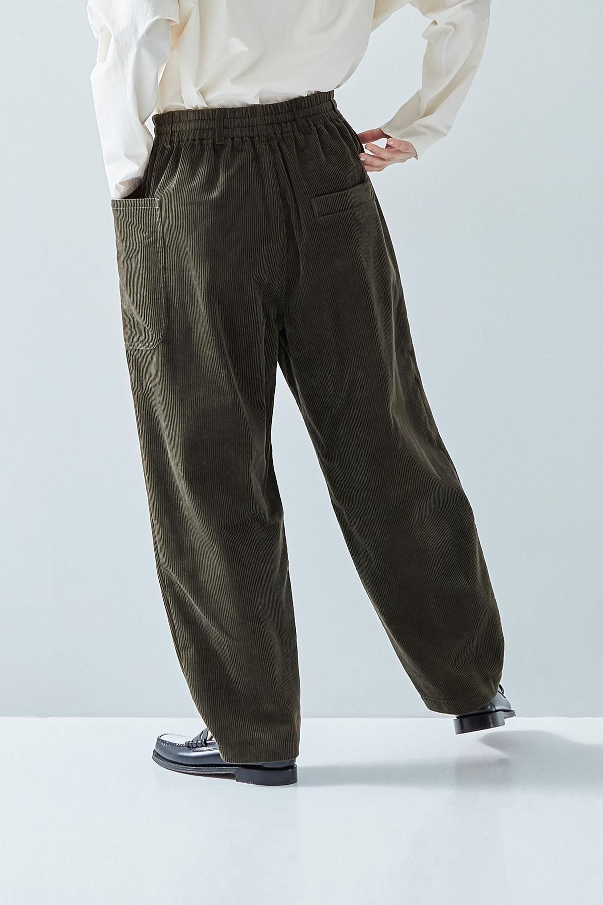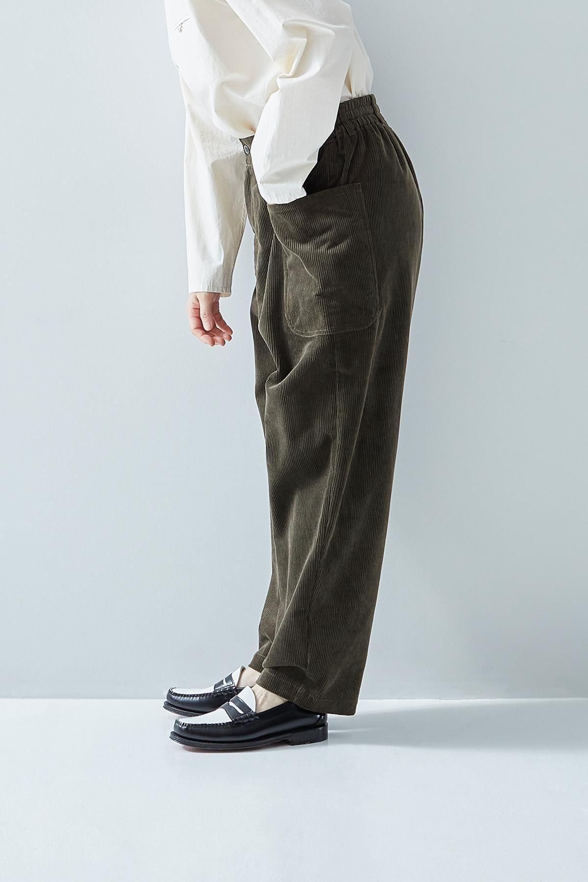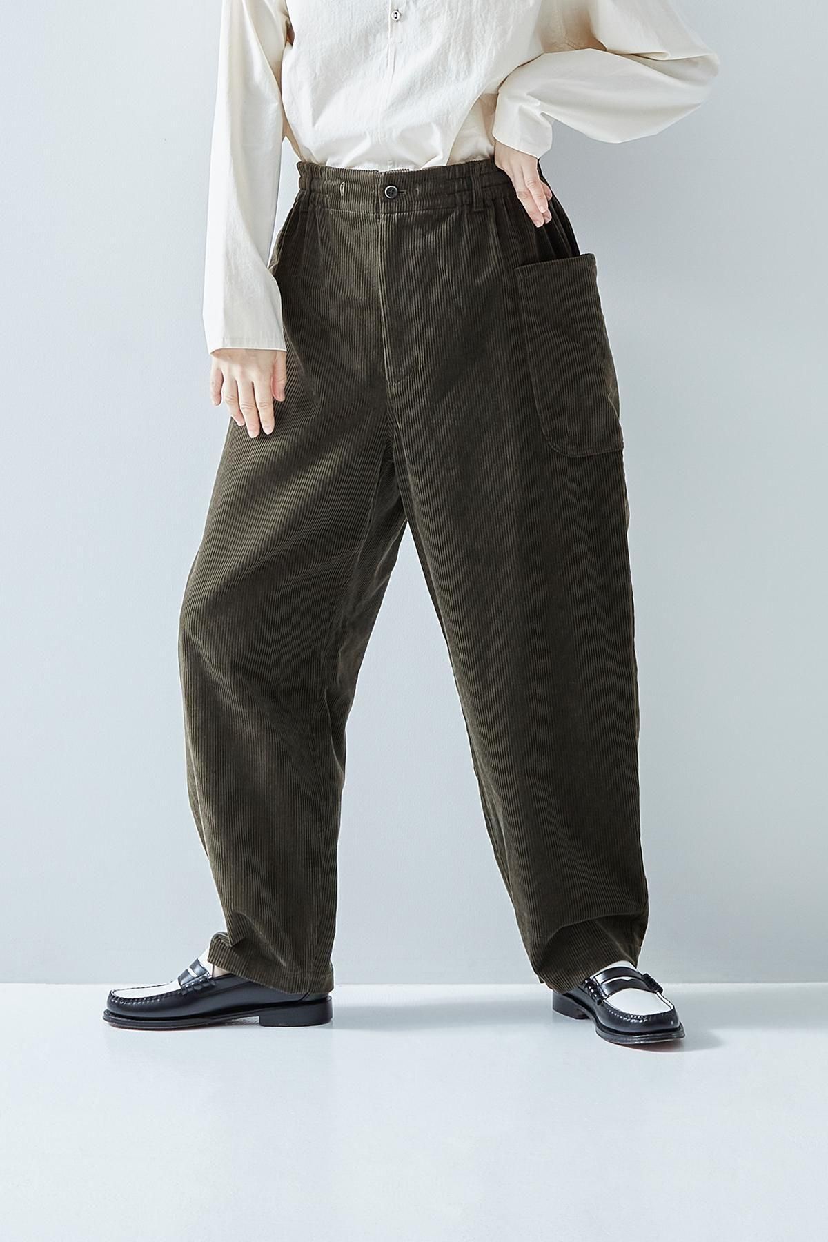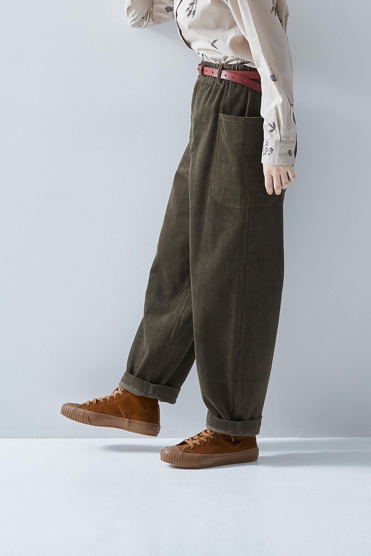 W(ウエスト)ゴム&調整可能な紐がついた、atelier naruse 定番のヒップから裾にかけて細くなるバルーン型のパンツ。こちらは、ここ数シーズン秋冬の定番として展開しているコーデュロイ(ワンウォッシュ)バージョンです。