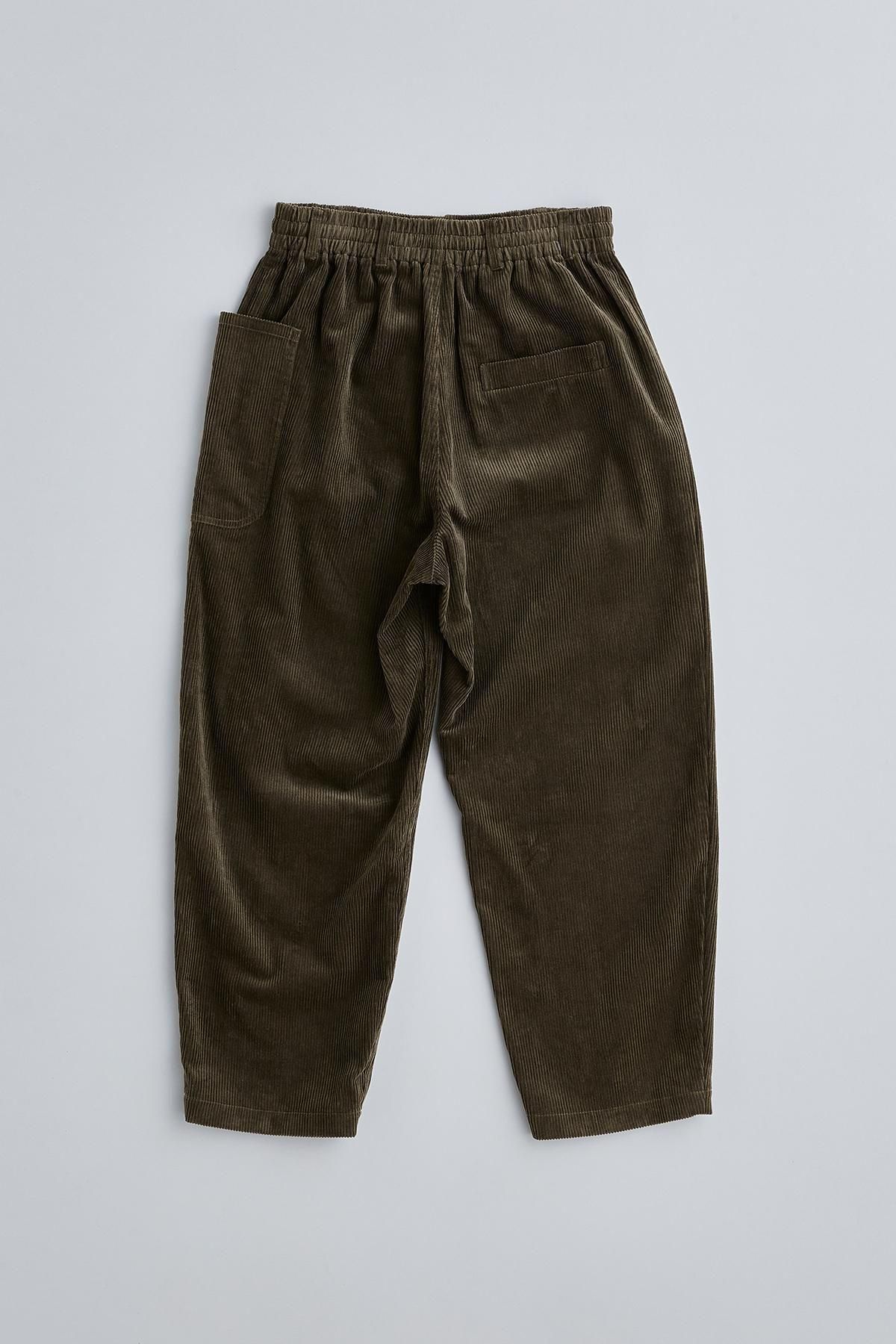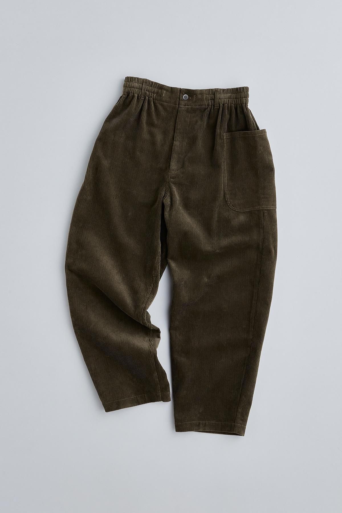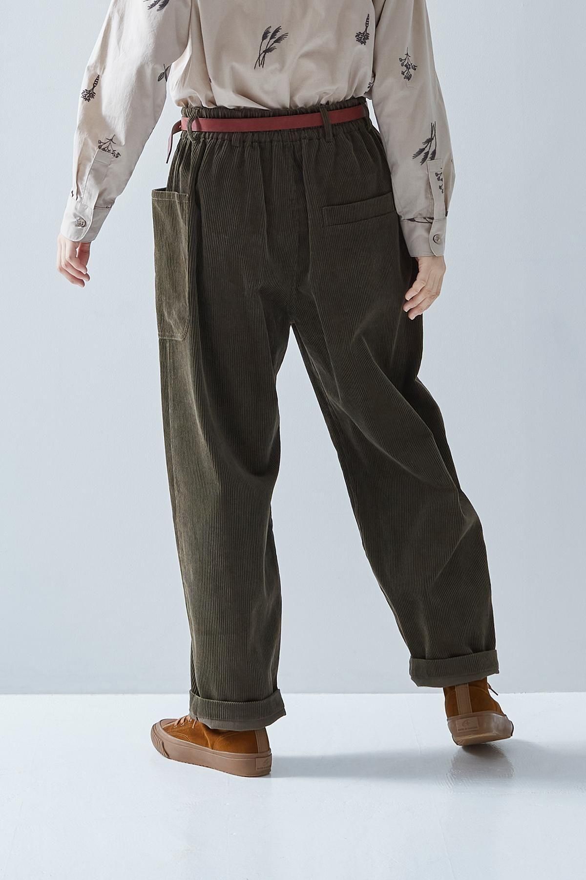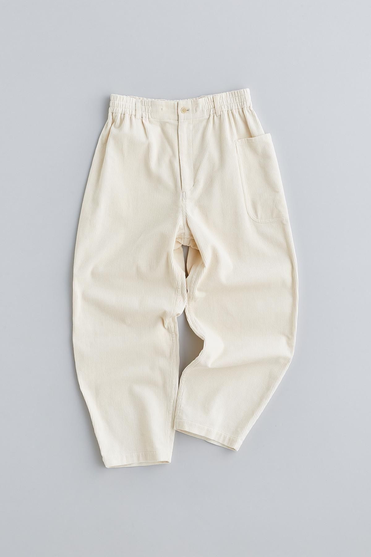W(ウエスト)ゴム&調整可能な紐がついた、atelier naruse 定番のヒップから裾にかけて細くなるバルーン型のパンツ。こちらは、ここ数シーズン秋冬の定番として展開しているコーデュロイ(ワンウォッシュ)バージョンです。