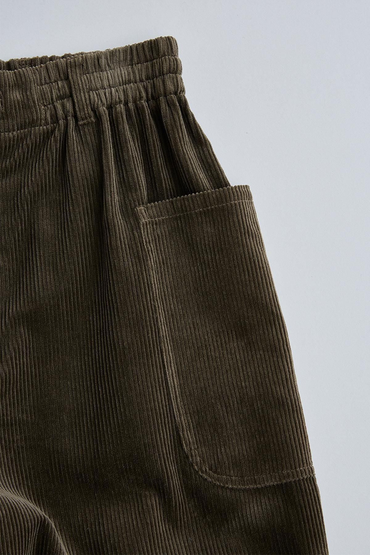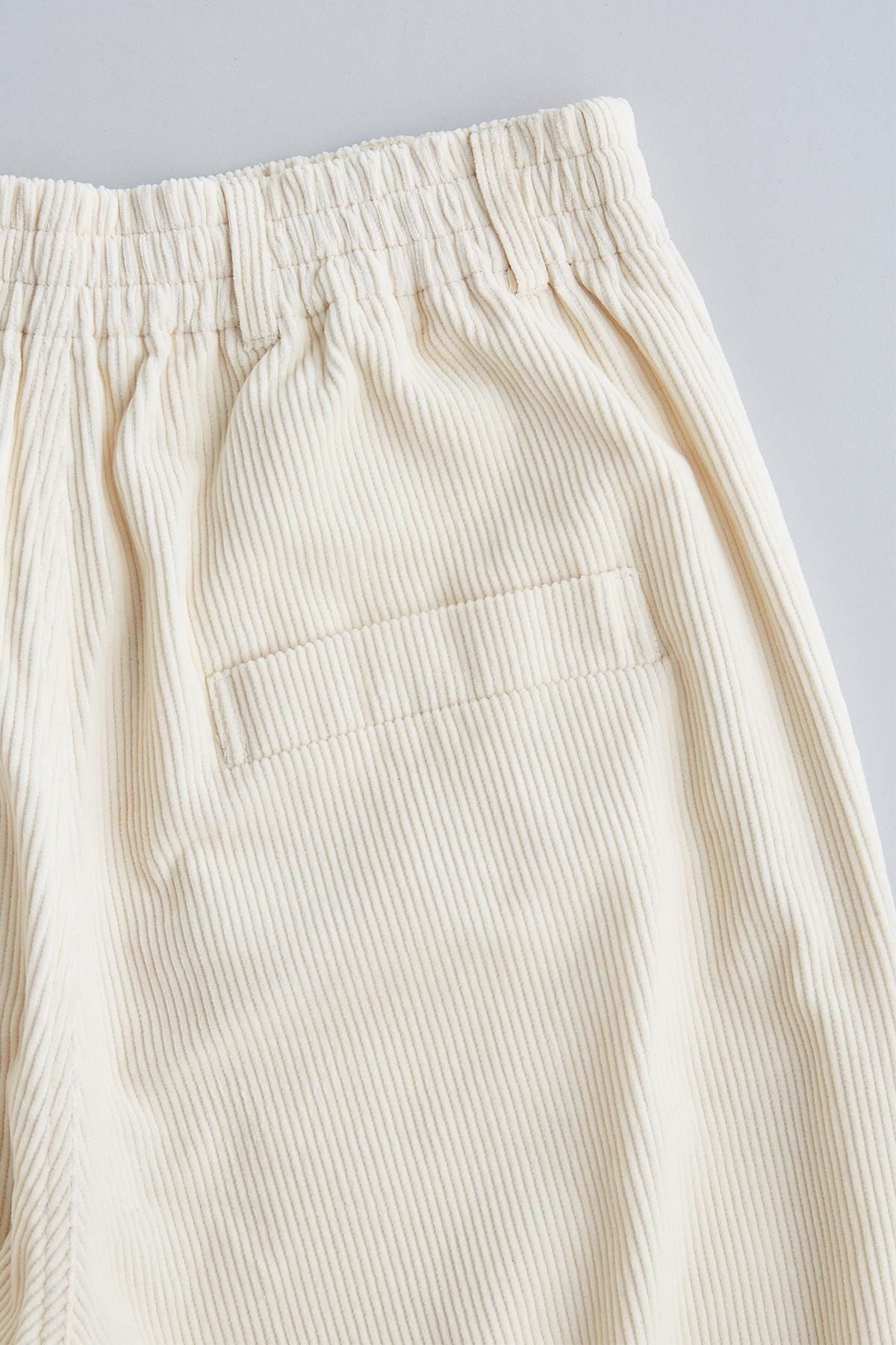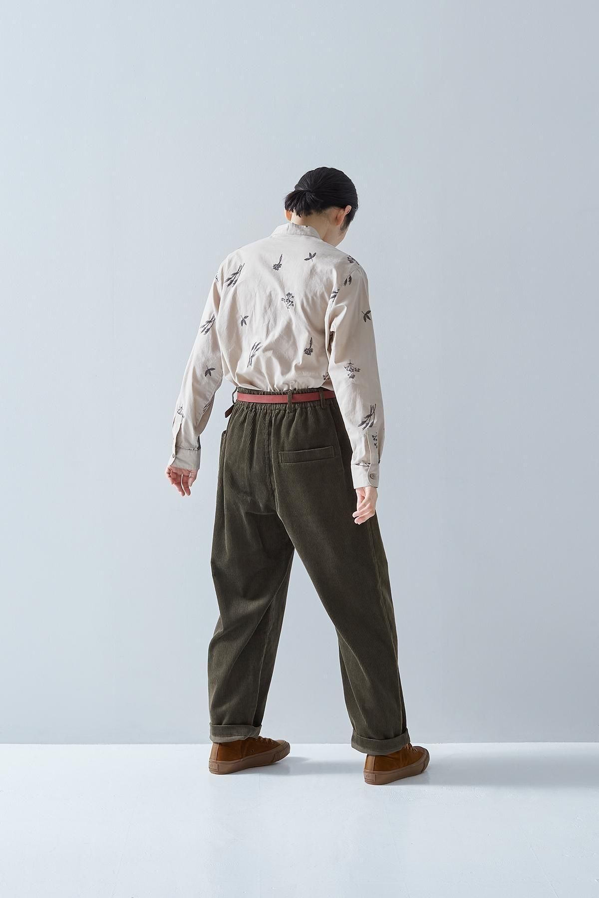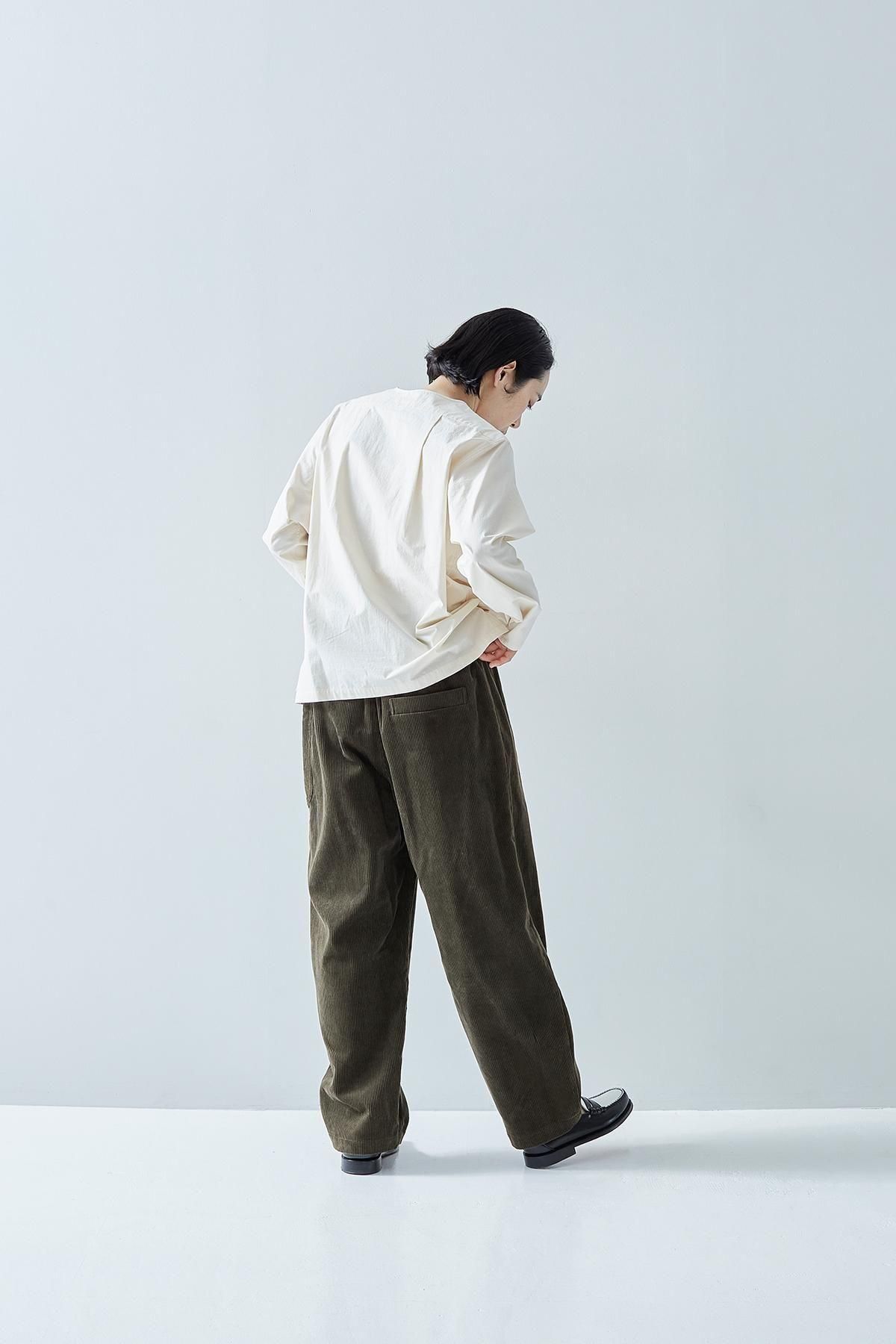 W(ウエスト)ゴム&調整可能な紐がついた、atelier naruse 定番のヒップから裾にかけて細くなるバルーン型のパンツ。こちらは、ここ数シーズン秋冬の定番として展開しているコーデュロイ(ワンウォッシュ)バージョンです。