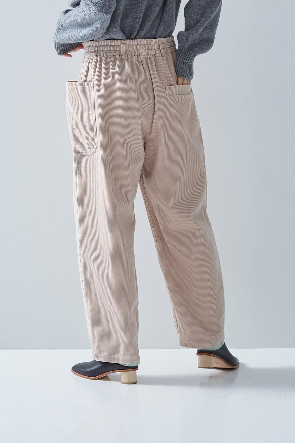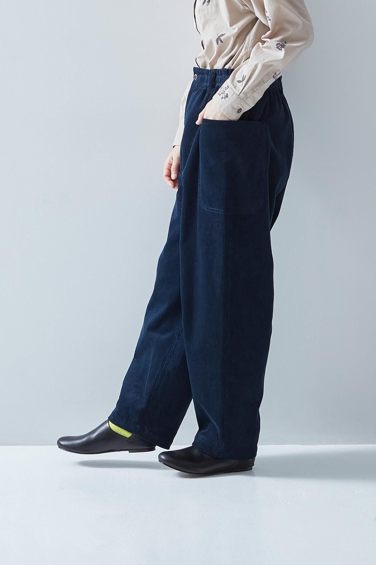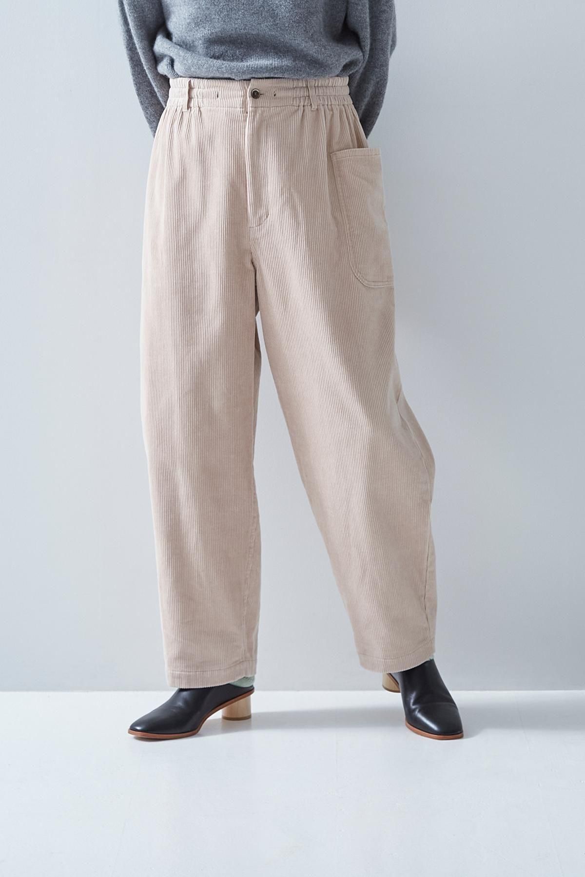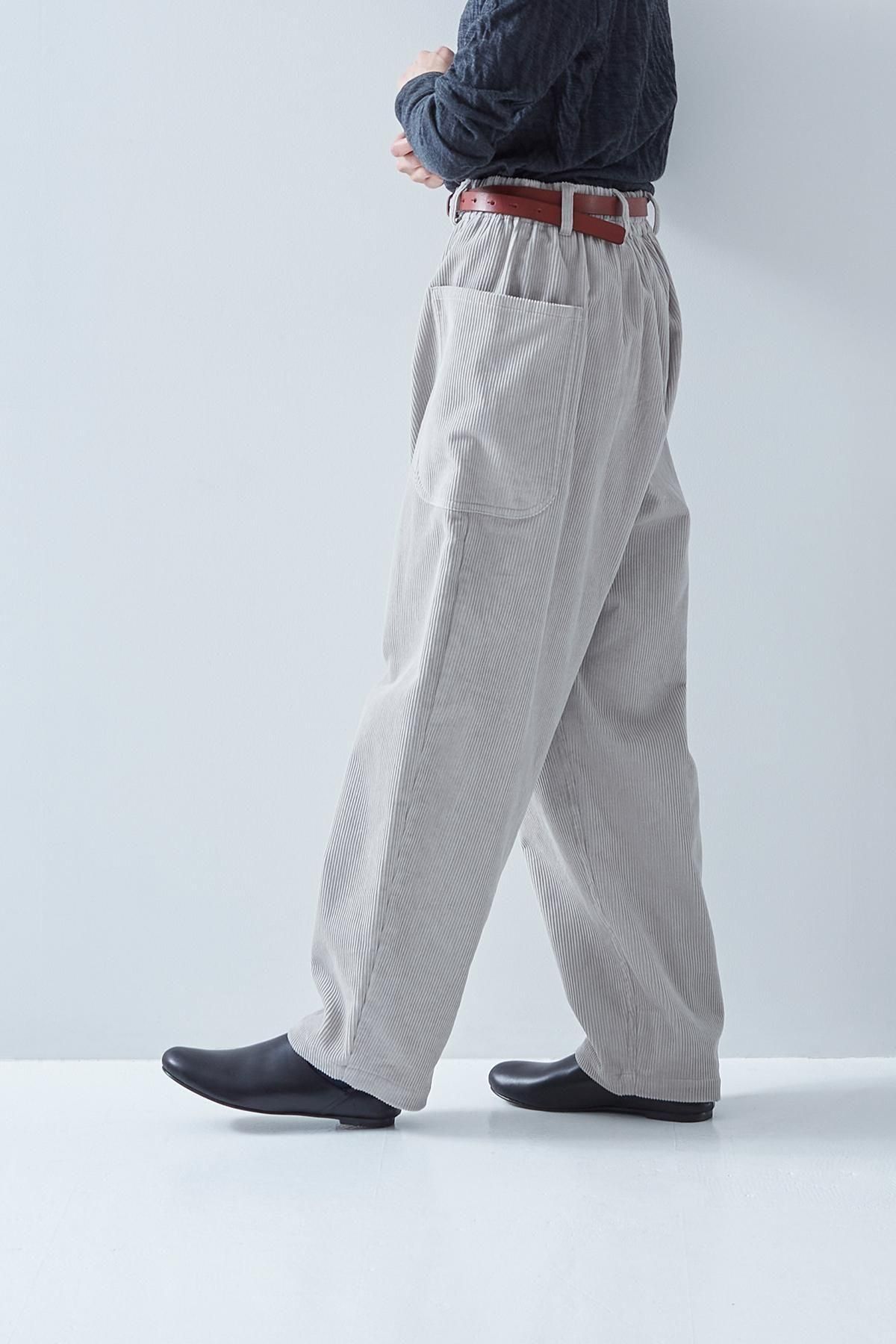W(ウエスト)ゴム&調整可能な紐がついた、atelier naruse 定番のヒップから裾にかけて細くなるバルーン型のパンツ。こちらは、ここ数シーズン秋冬の定番として展開しているコーデュロイ(ワンウォッシュ)バージョンです。